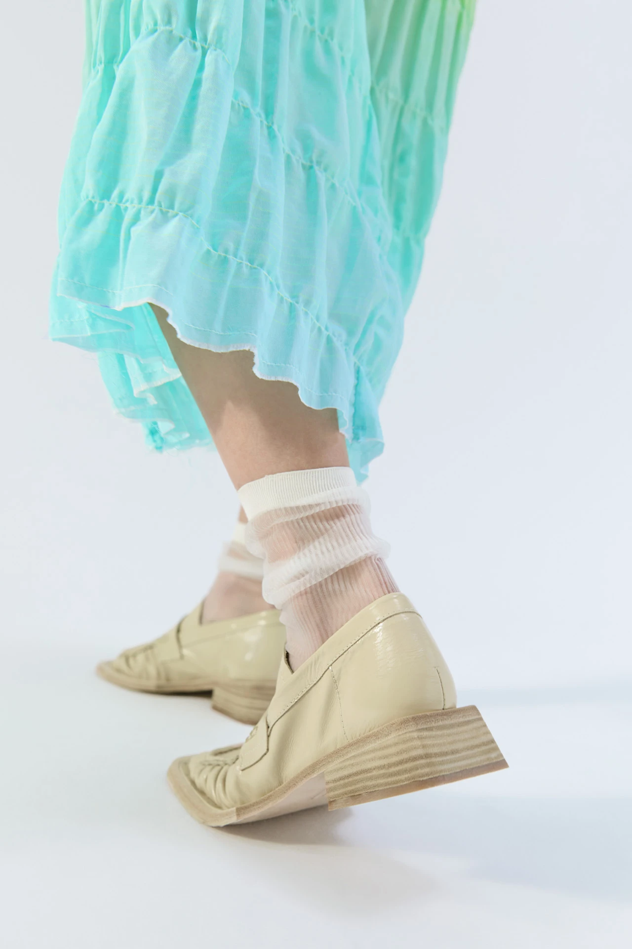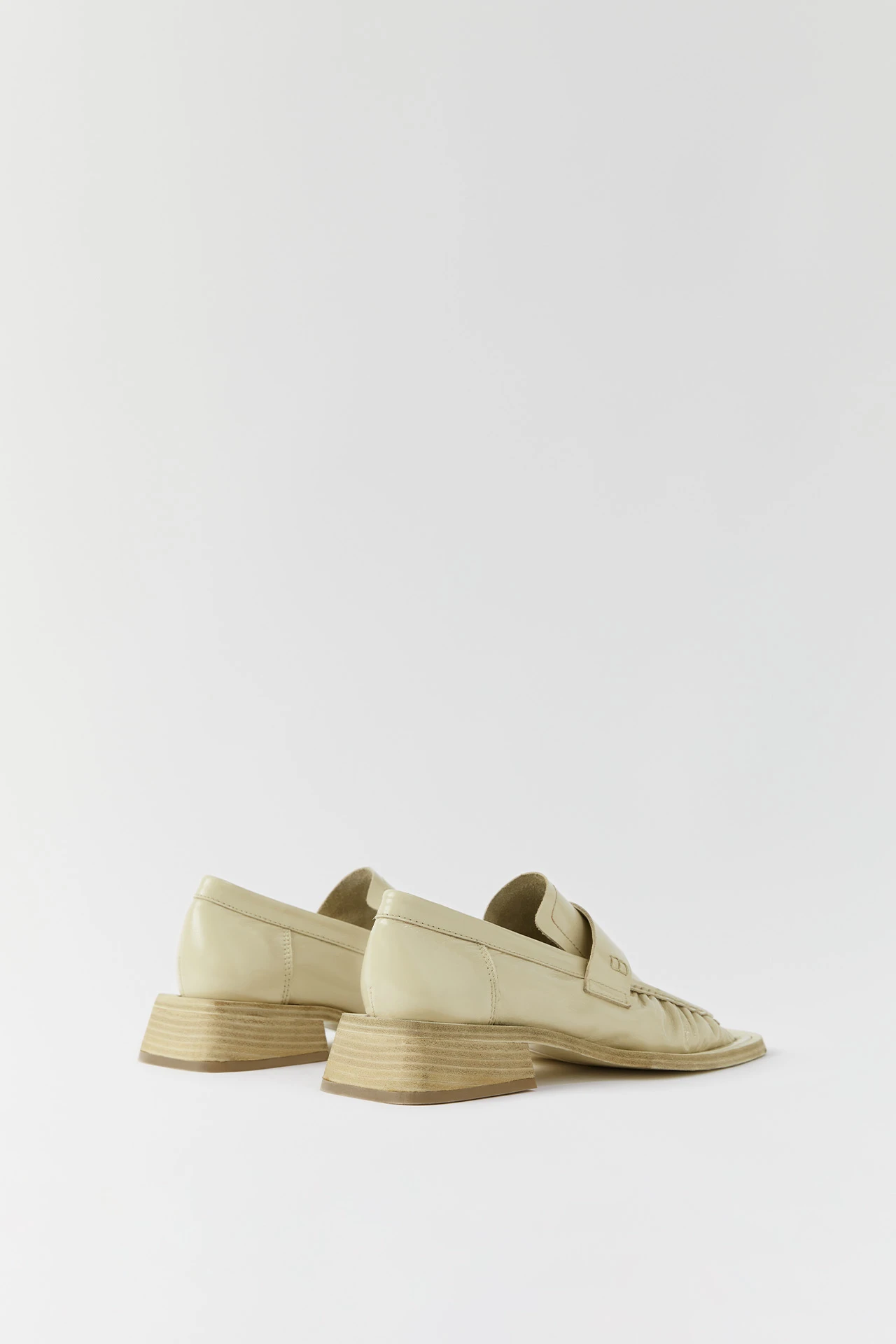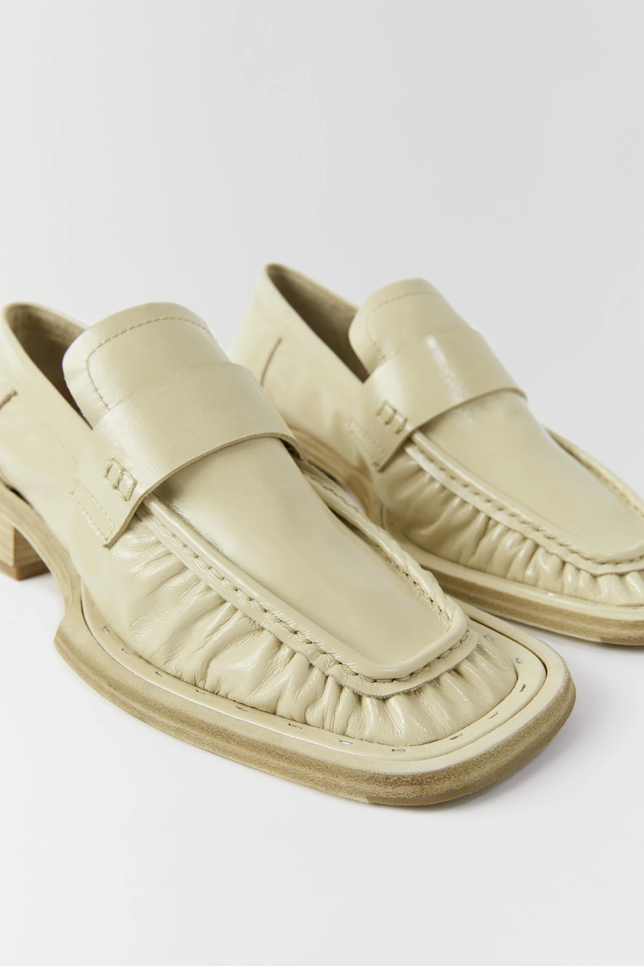 A classic unlined penny loafer with ruched apron detailing is handcrafted from soft glossy beige leather and juxtaposed with an angular stacked leather heel and oversized sole, finished with a doubled welt and metal staples.