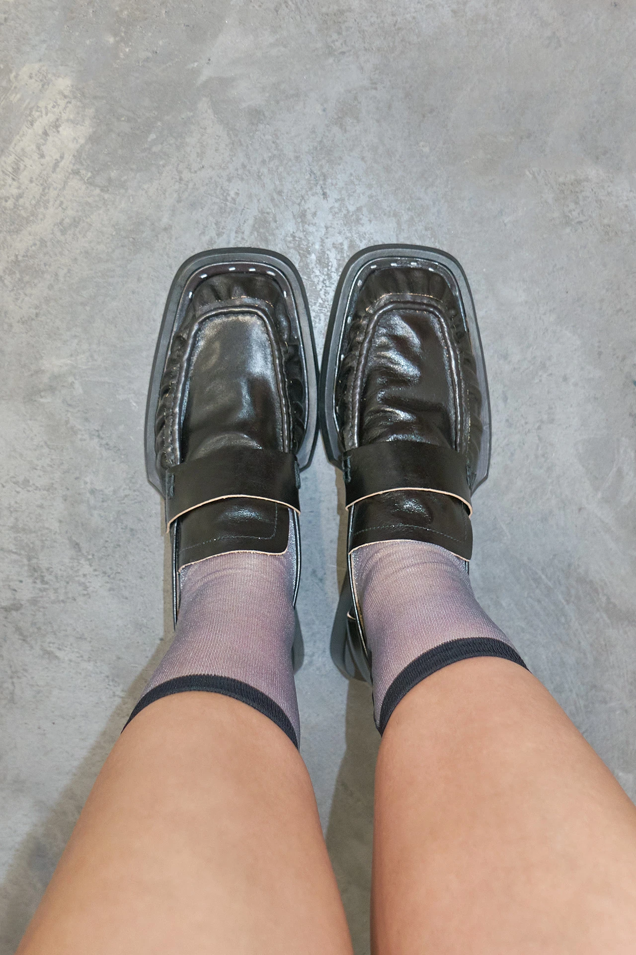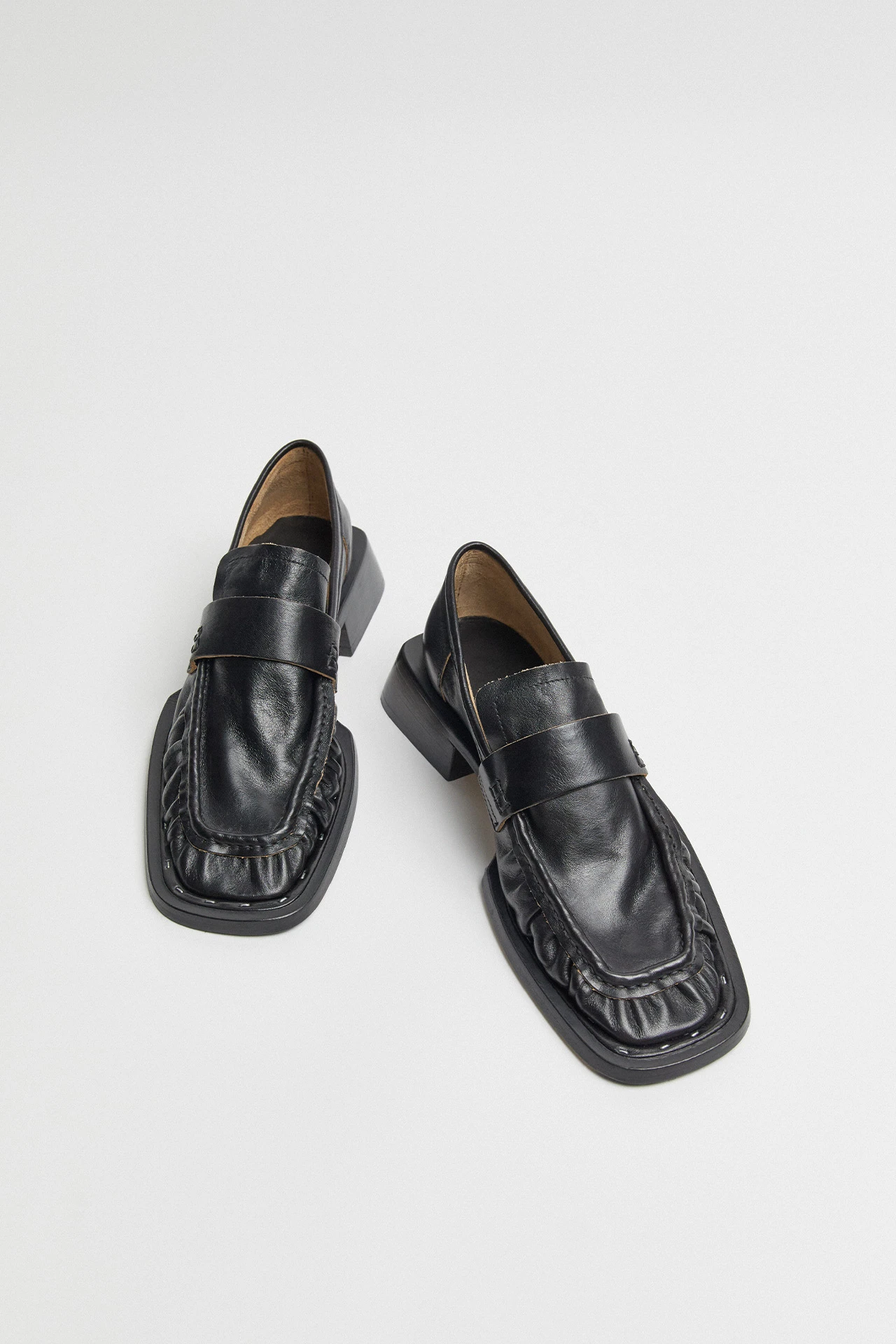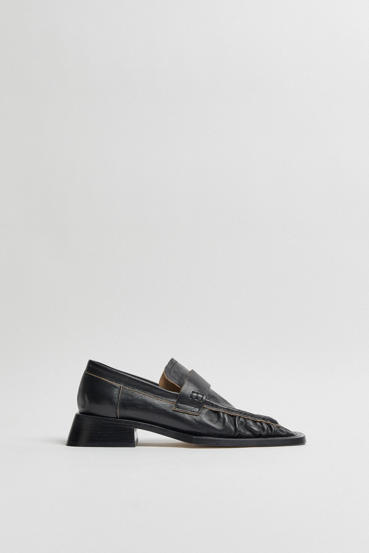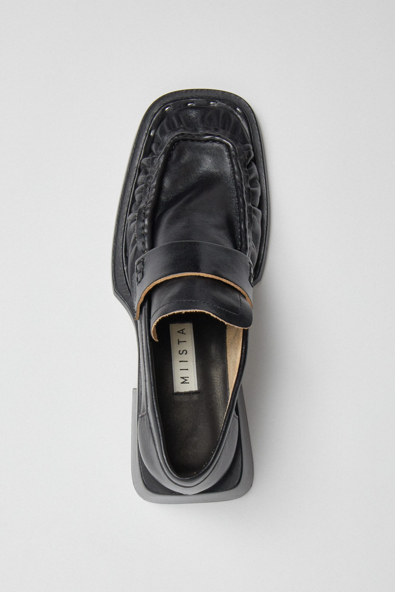 Airi takes everything you thought you knew about the loafer and runs with it. Her cow leather upper features contrast edging and a ruched frontage, hand-stapled to her extended statement sole. Her stacked leather low heel protrudes out in all directions, creating a flared footprint that tapers up to the insole. Airi is complete with memory foam insoles and vegetable tan cow leather lining for enhanced comfort, plus a rubber heel cap and rubber-invected toe protecting its vegetable tan cow leather sole.
