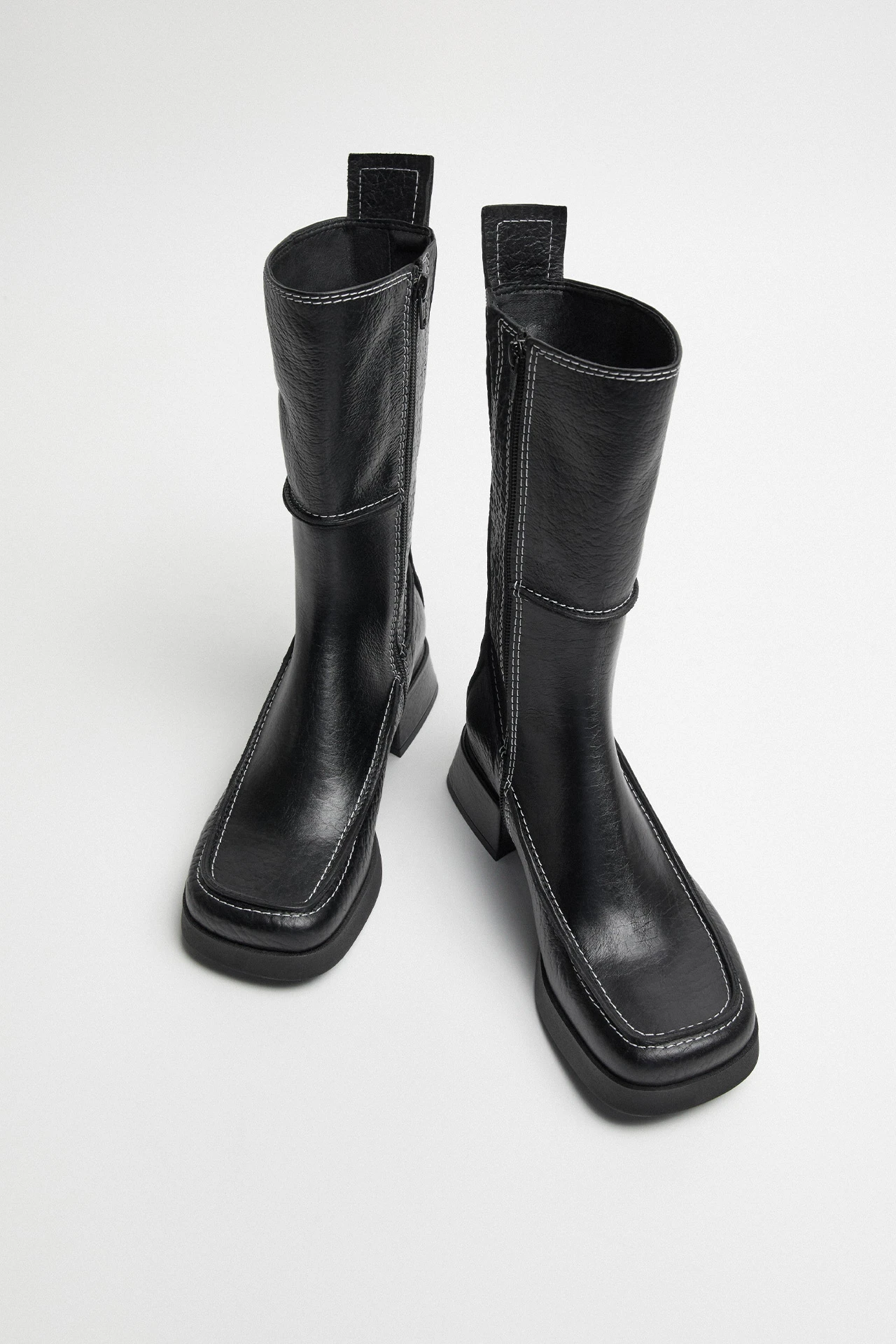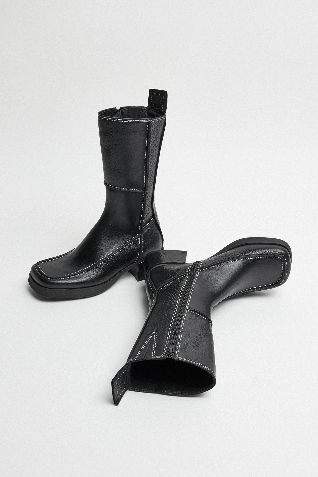 Alzira’s mid-calf, platform silhouette flirts with the 1970s before looking to the future. In a playful panel design, her contrast white stitching and lightly embossed leather steps her forward into the modern day, set on a raised sole and complete with a statement boot-pull tab.