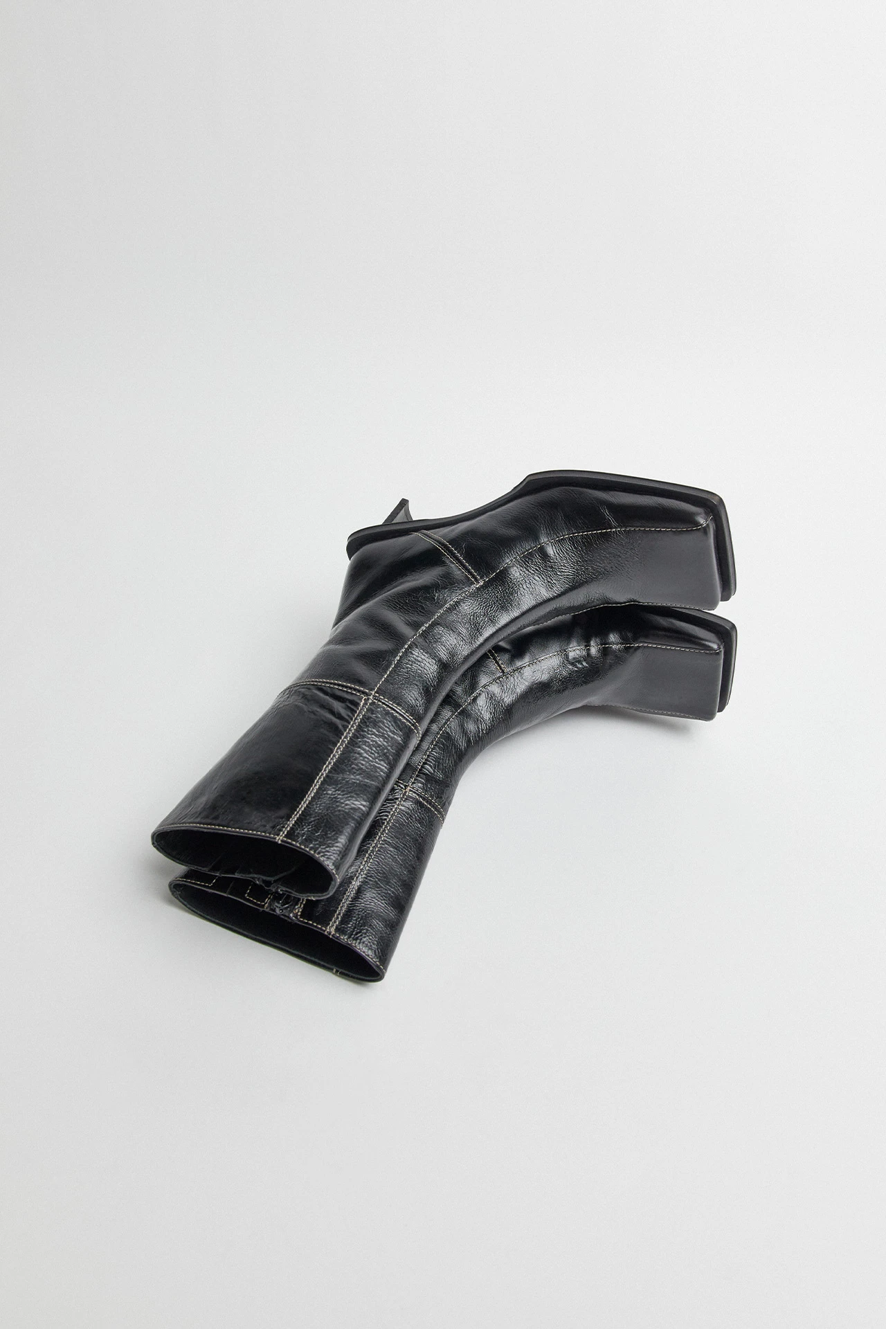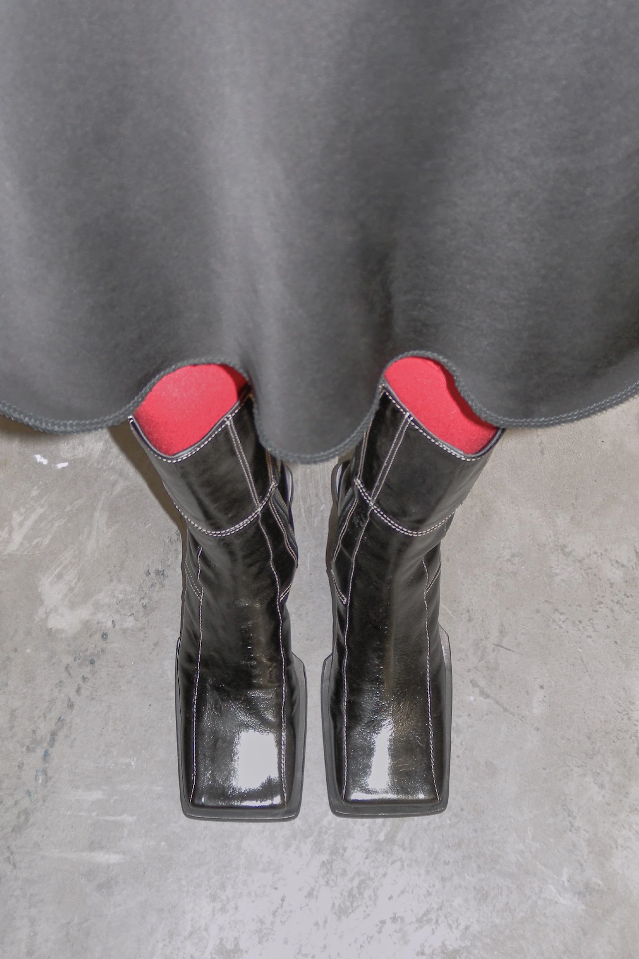Amparo toys with the power of opposites, contrasting her statement square toe with an ultra-slimline curved heel. Her toe drops off at an oblique angle, reaching down to join her extended outsoles. She’s built from black leather paneling, joined with contrast white stitching. A discreet zipper runs the length of this mid-calf Icon, with an elastic gusset allowing for the perfect fit. Amparo is finished with memory foam insoles and vegetable tan cow leather lining for enhanced comfort, plus a rubber heel cap and rubber-invected toe on her vegetable tan cow leather sole for robust durability.