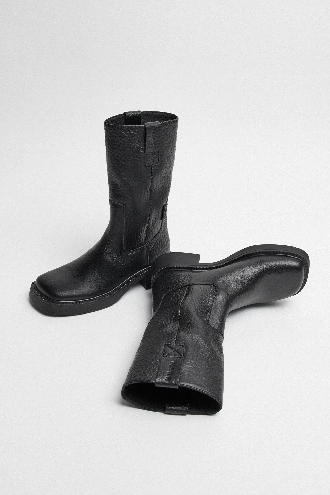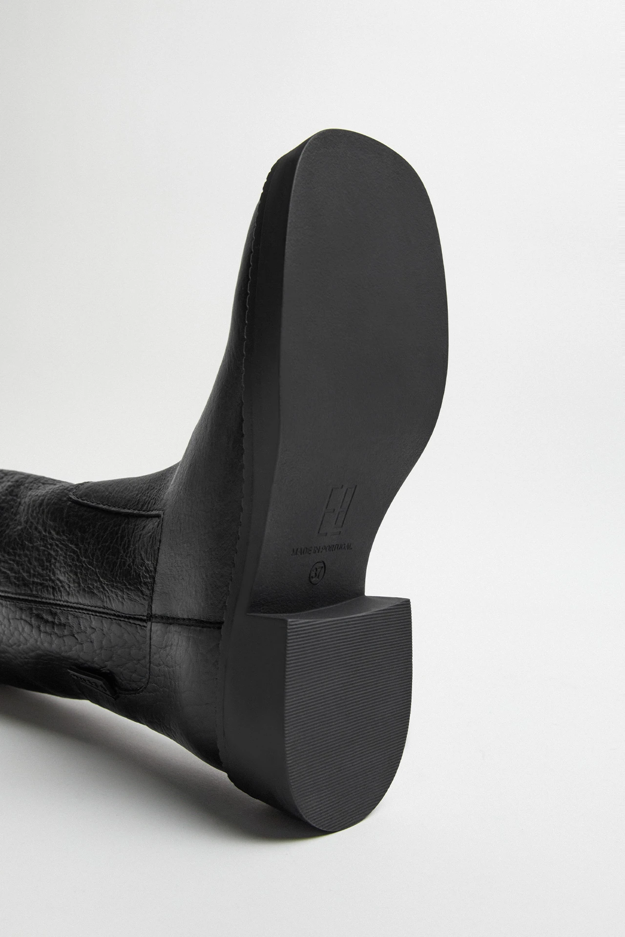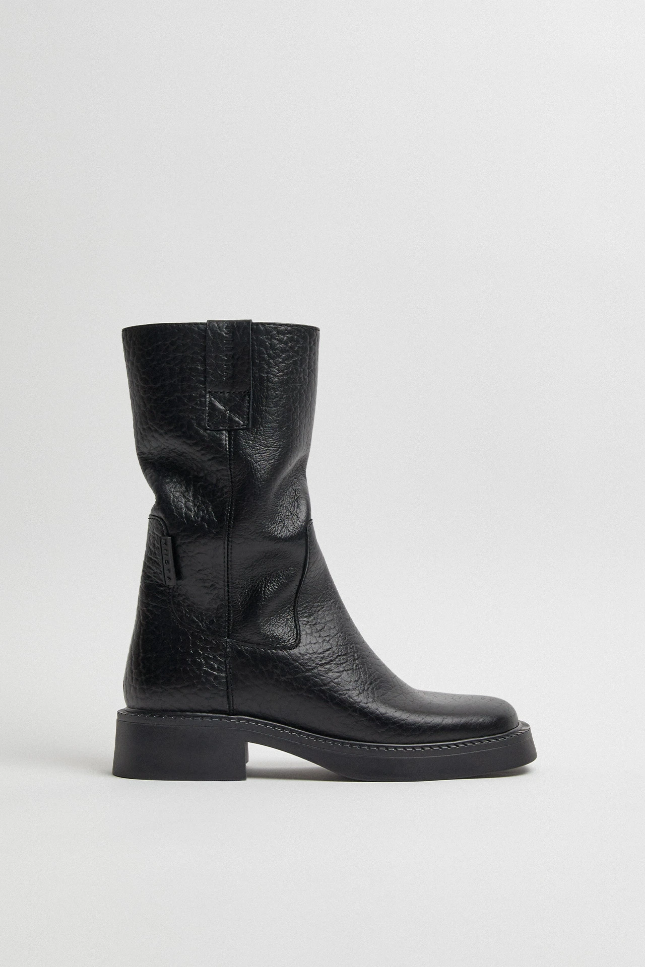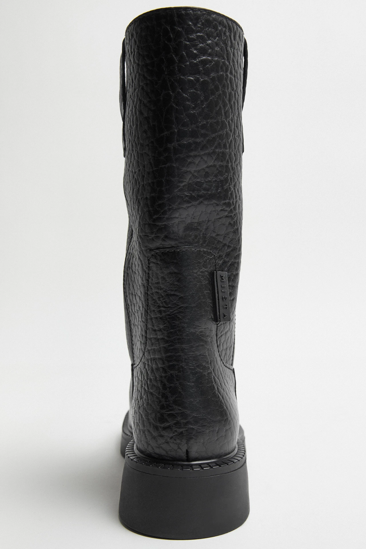 Aron slouches in style but never in attitude. Her textured leather upper grazes the calf in a relaxed shape that nods to her elevated biker aesthetic. Sleek sturdiness can be found in her rounded toe, complete with slick stitching and just enough platform to get noticed when she enters the room.