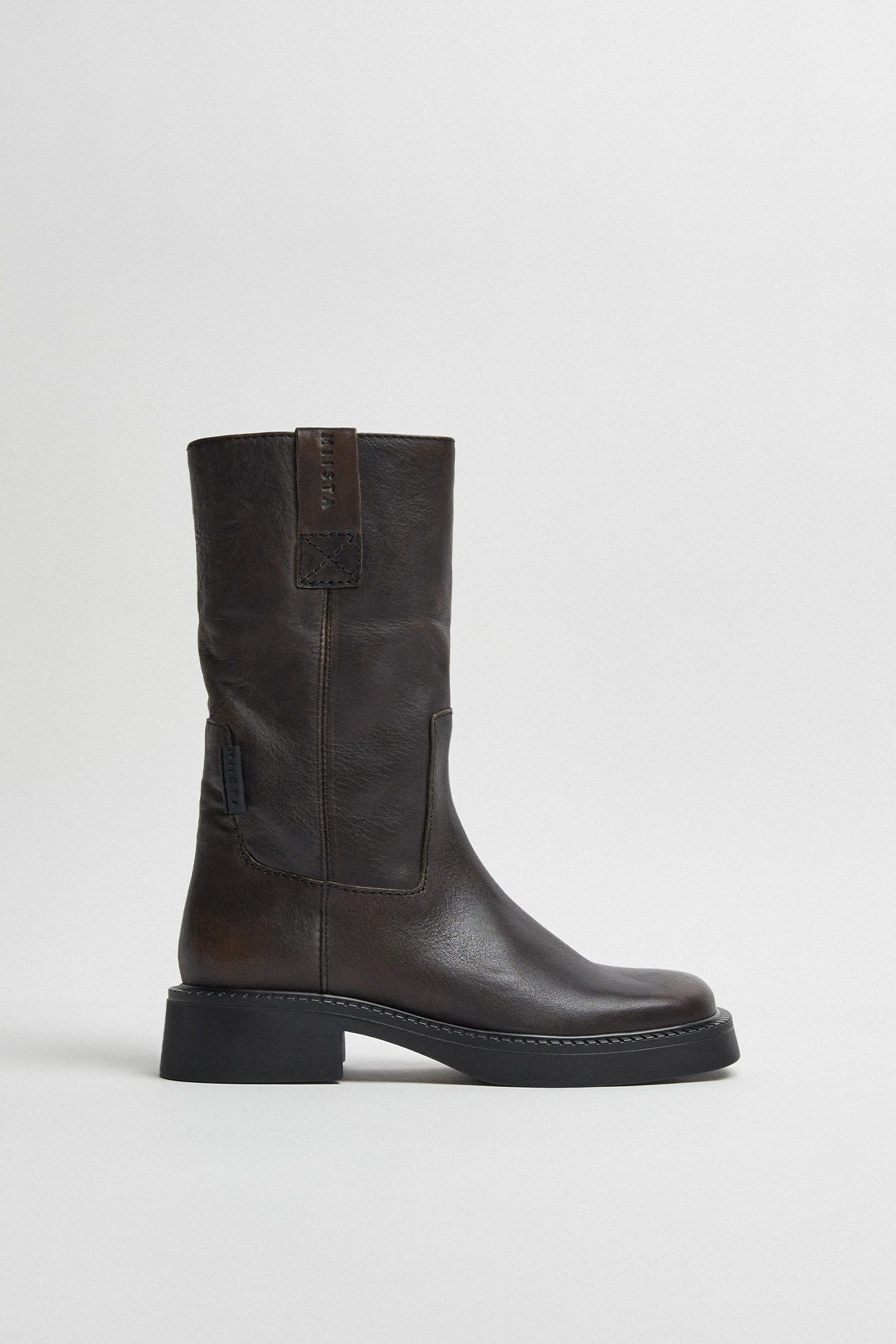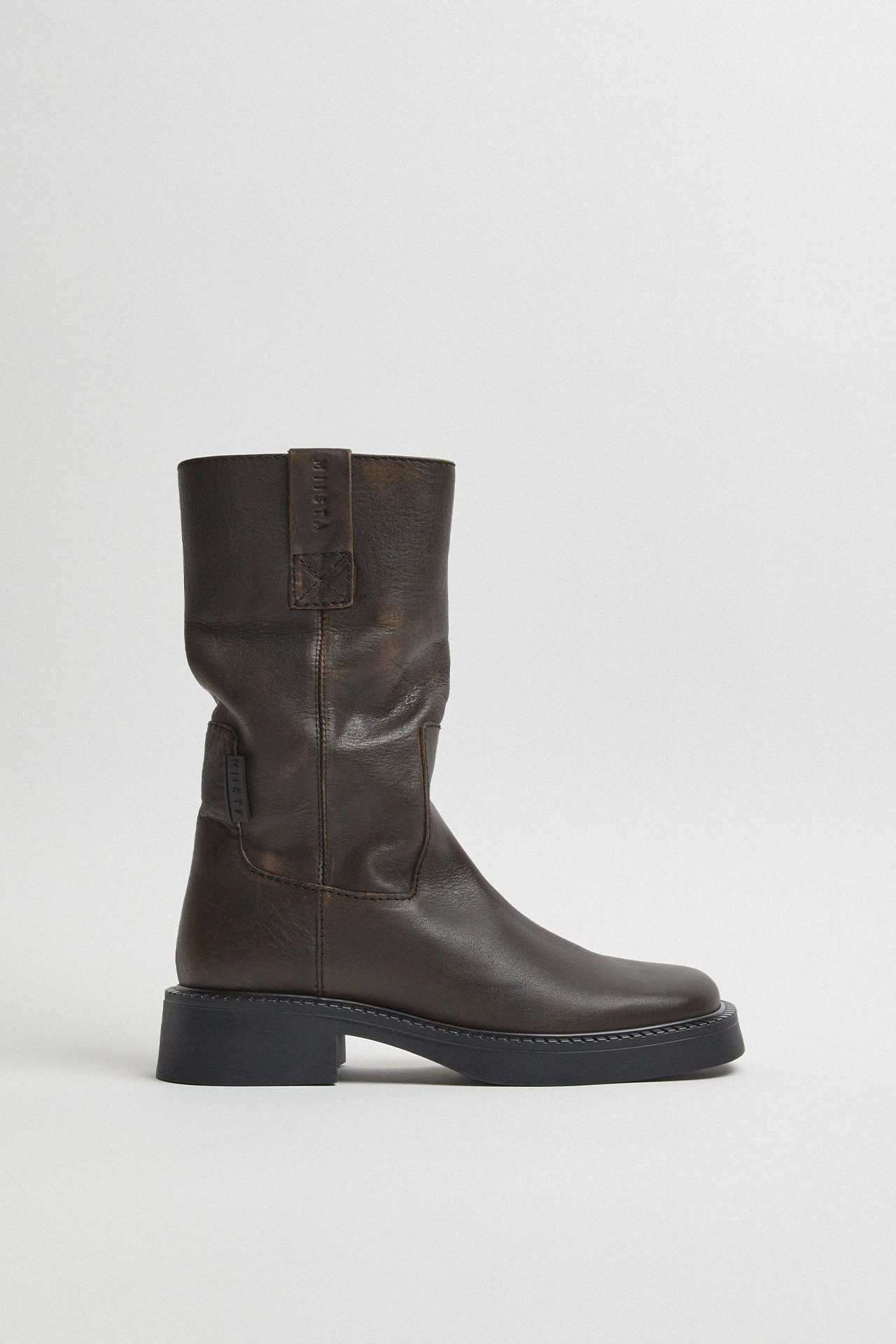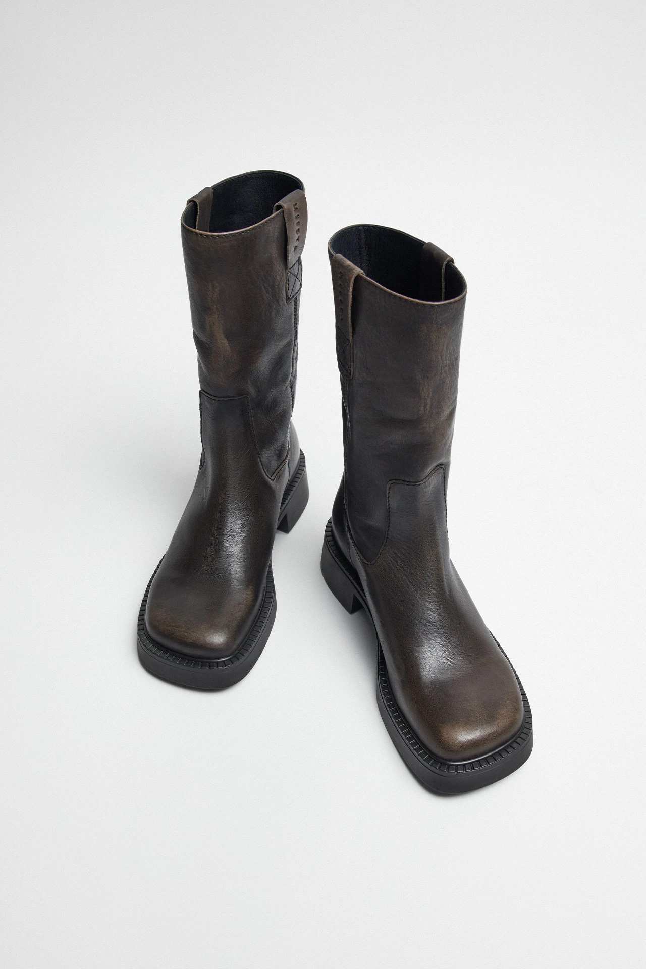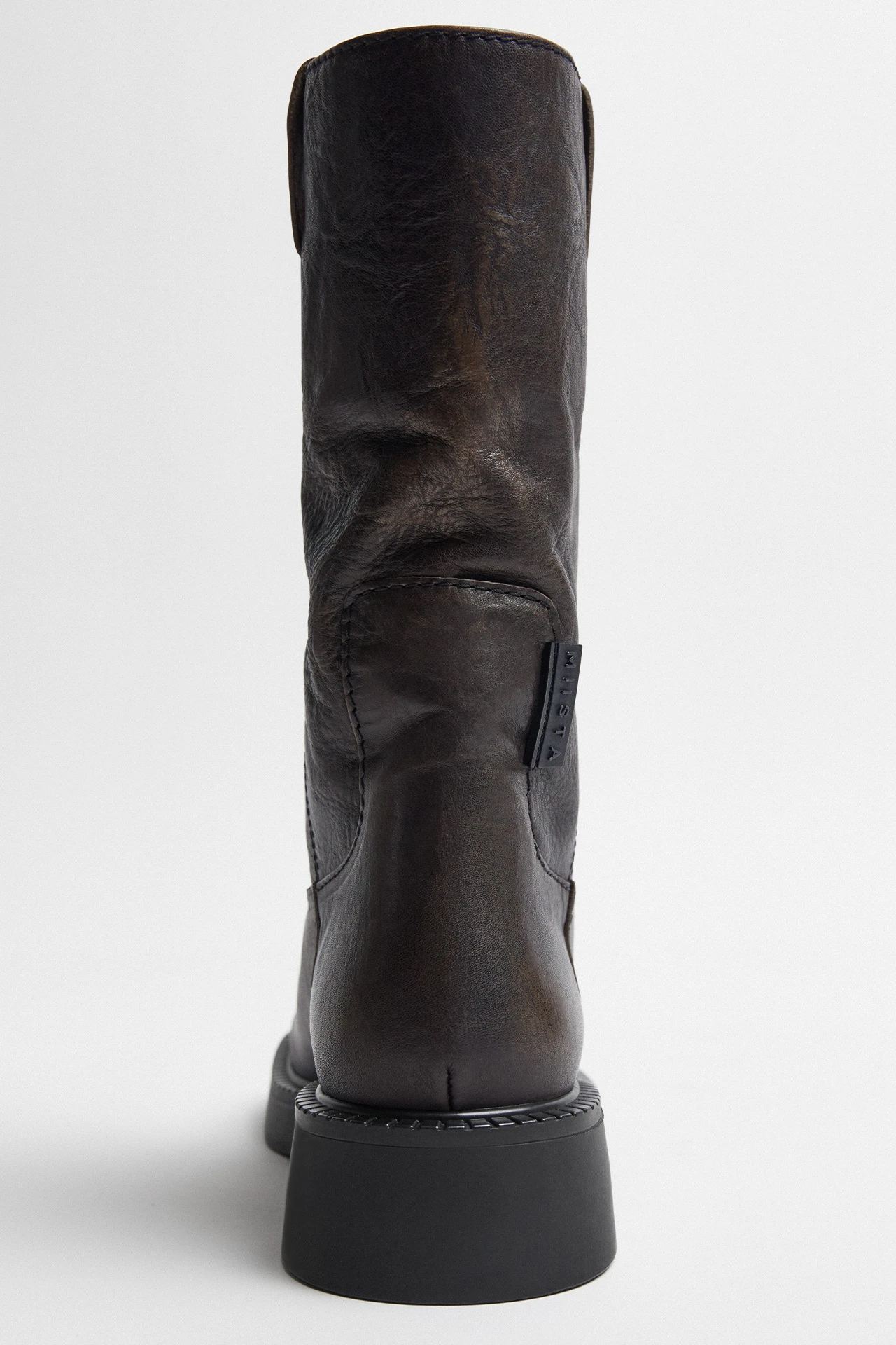 Aron slouches in style but never in attitude. Her acid-wash leather upper grazes the calf in a relaxed shape that nods to her elevated biker aesthetic. Sleek sturdiness can be found in her rounded toe, complete with slick stitching and just enough platform to get noticed when she enters the room.