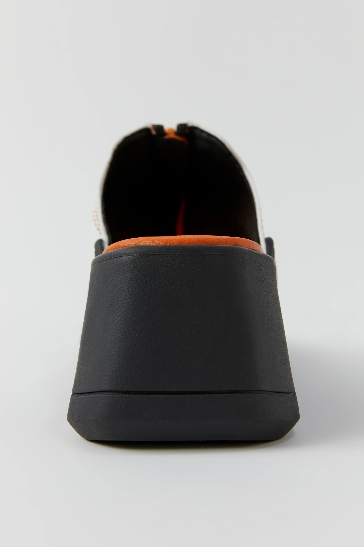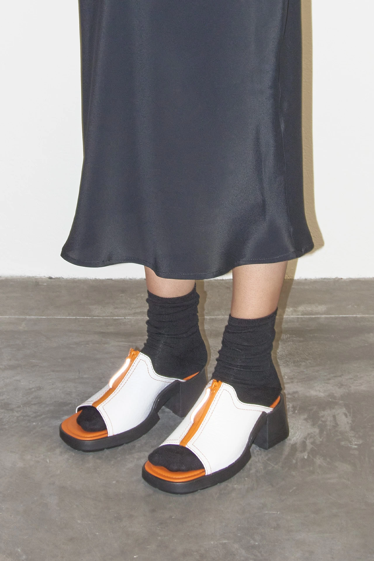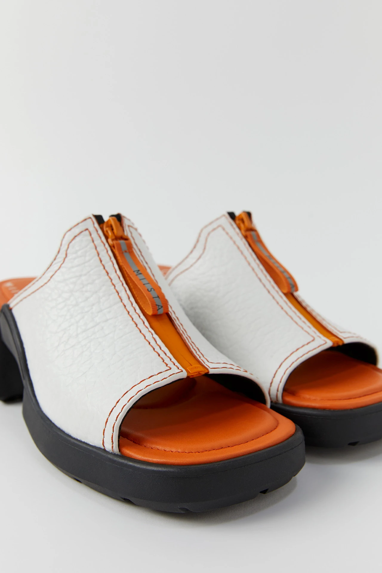 Bertie sits in that glorious realm between sandal and mule. Her white tumbled cow leather upper sports a central rubberised zipper in contrasting orange, complete with a Miista branded 3M reflective zip pull to catch the light as you walk. Her anatomical insole massages the foot, and is covered in super soft orange sheep nappa leather to take that comfortable feel to the next level.