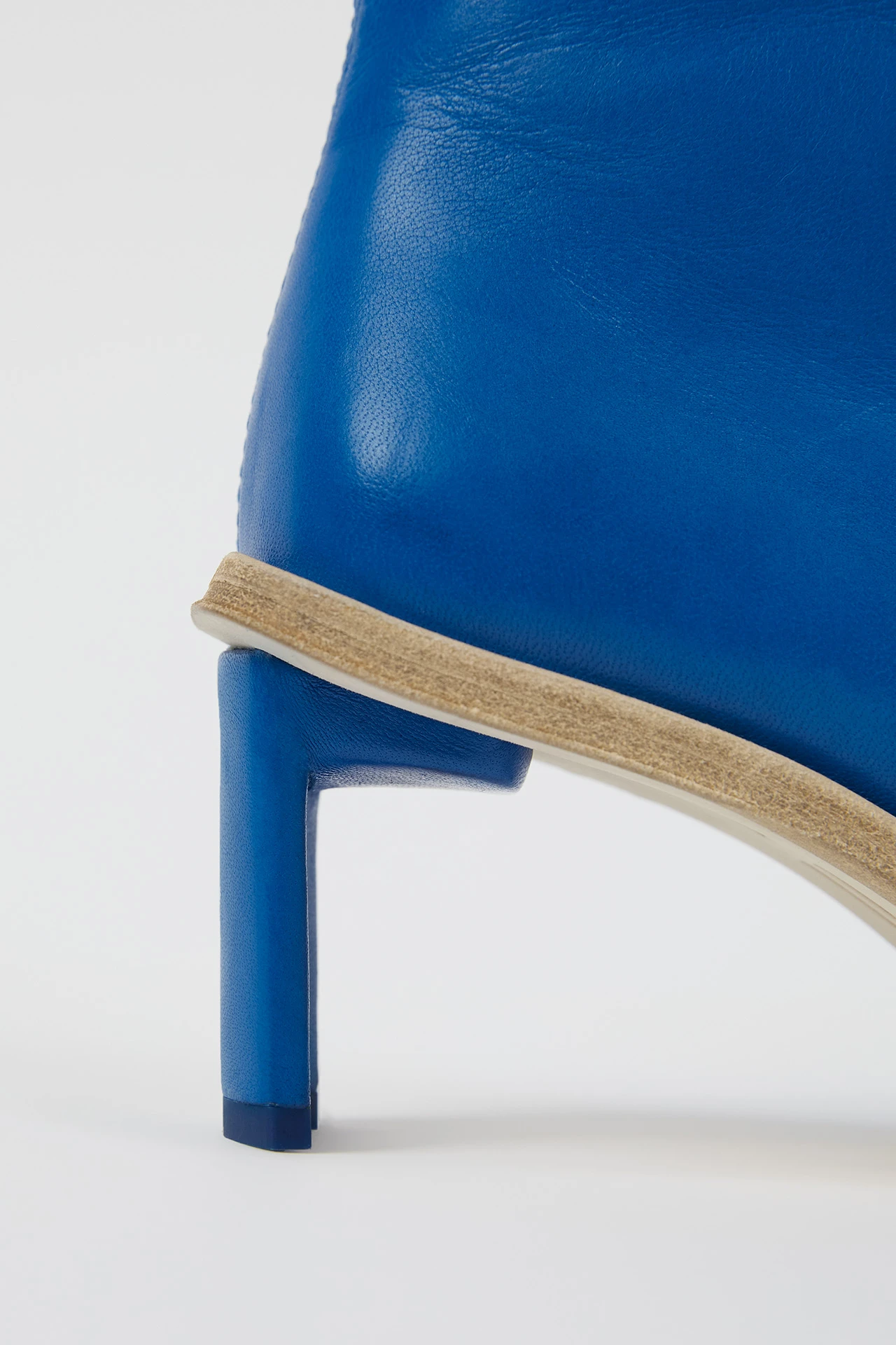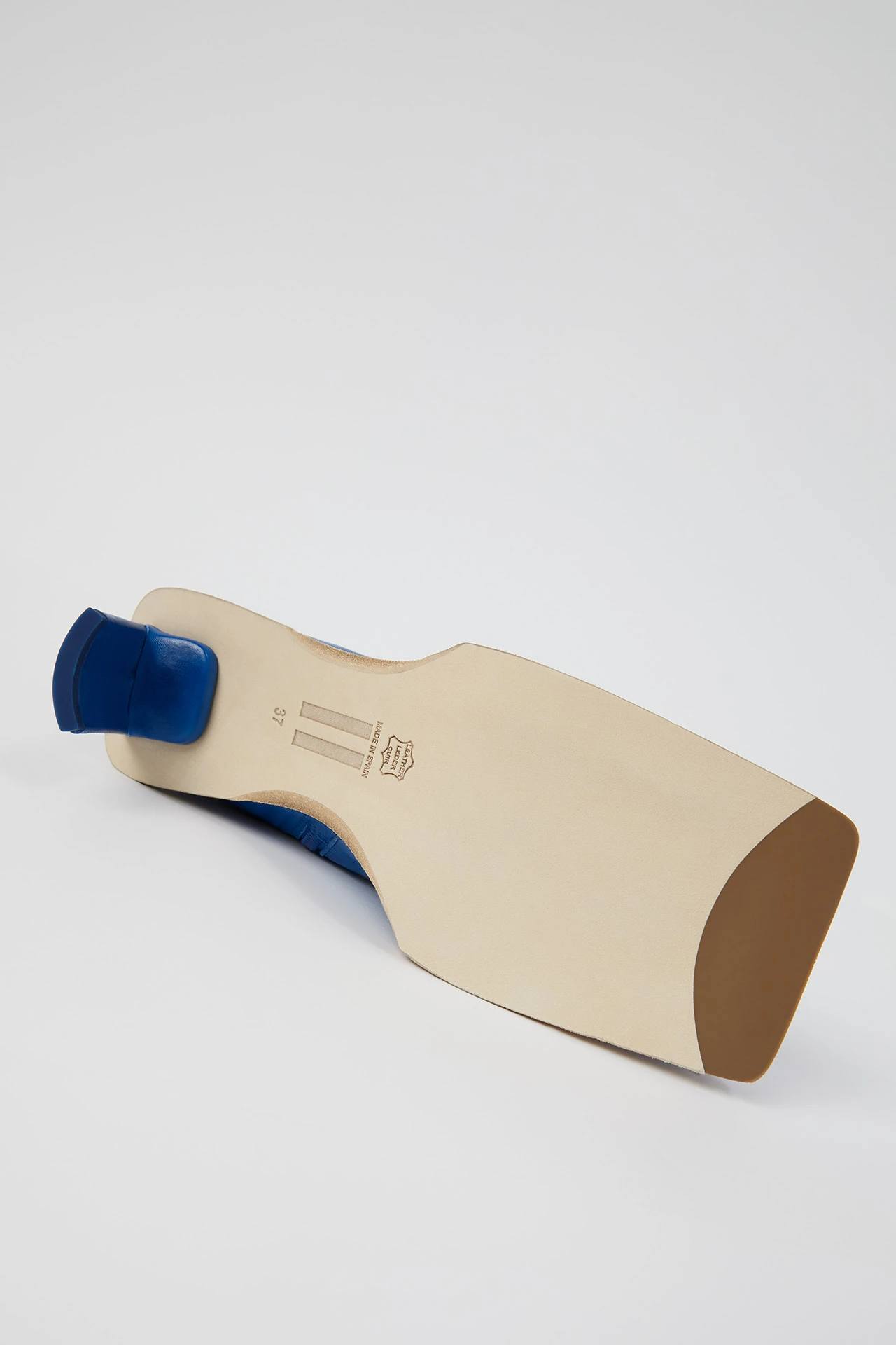 Pairing a statement square toe with an ultra-slimline curved heel, Brenda takes the fundamentals of opposites and runs with them. Her toe drops off at an oblique angle, plummeting in on itself to join the extended welt. Her soft Italian vegetable tan lamb leather upper in vibrant blue runs just above the ankle, featuring a full-length inner zip and discreet elastic gusset for the perfect fit. As with all Icons, Brenda is finished with memory foam insoles and vegetable tan cow leather lining for enhanced comfort, plus a rubber heel cap and rubber-invected toe on her vegetable tan cow leather sole for durability. Heel Height 6cm This style is true to size. We recommend selecting your standard European size. Designed in London | Handcrafted in Spain