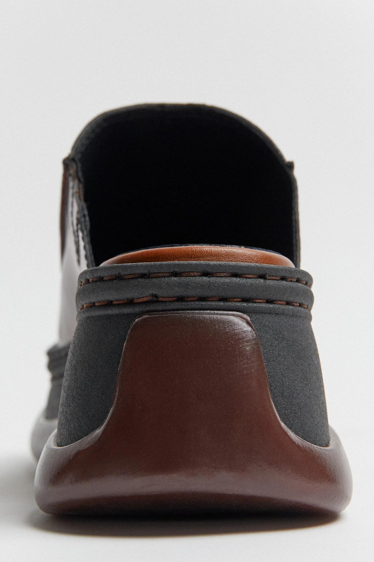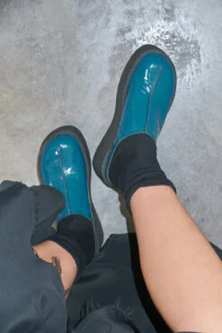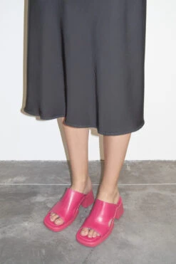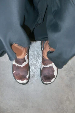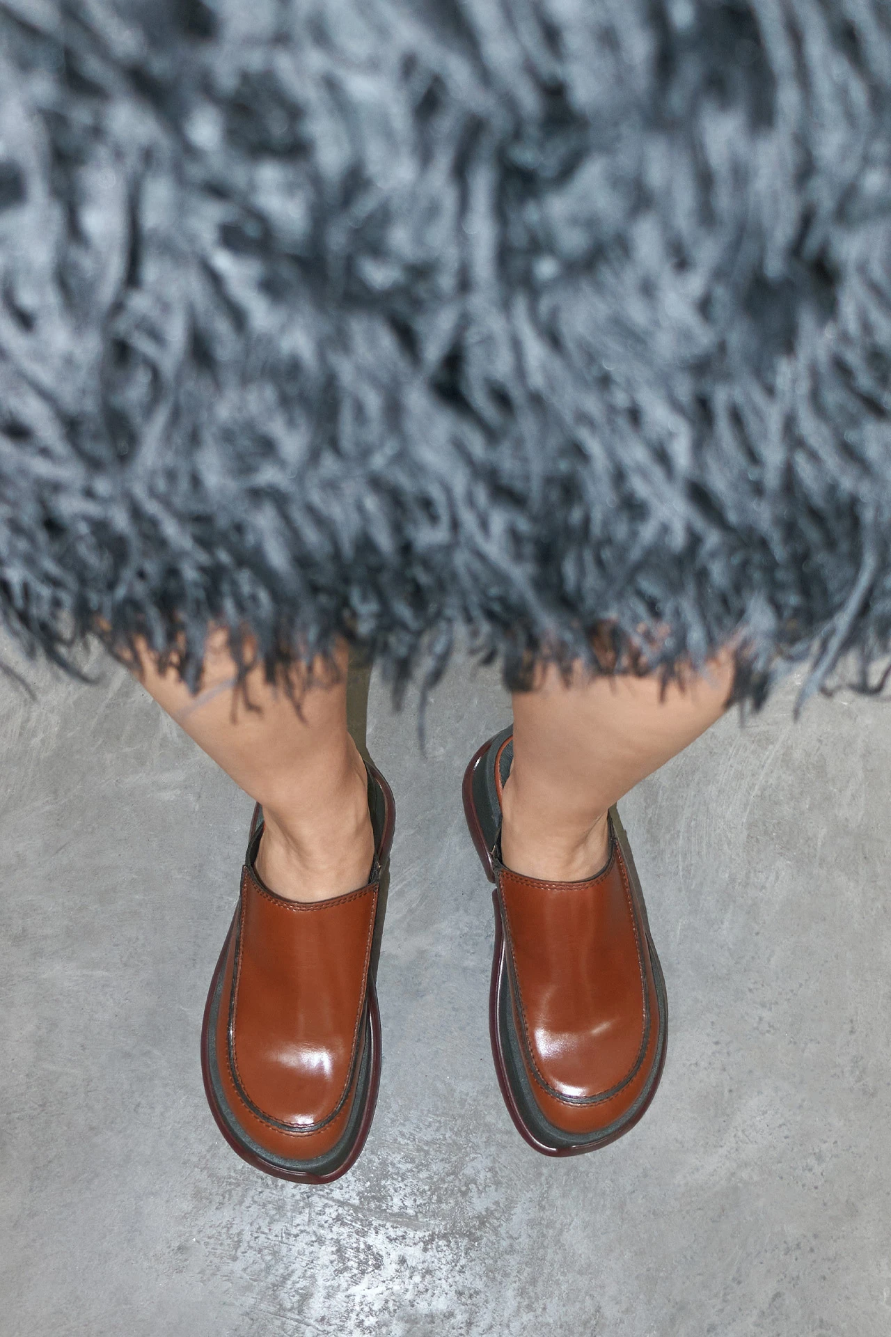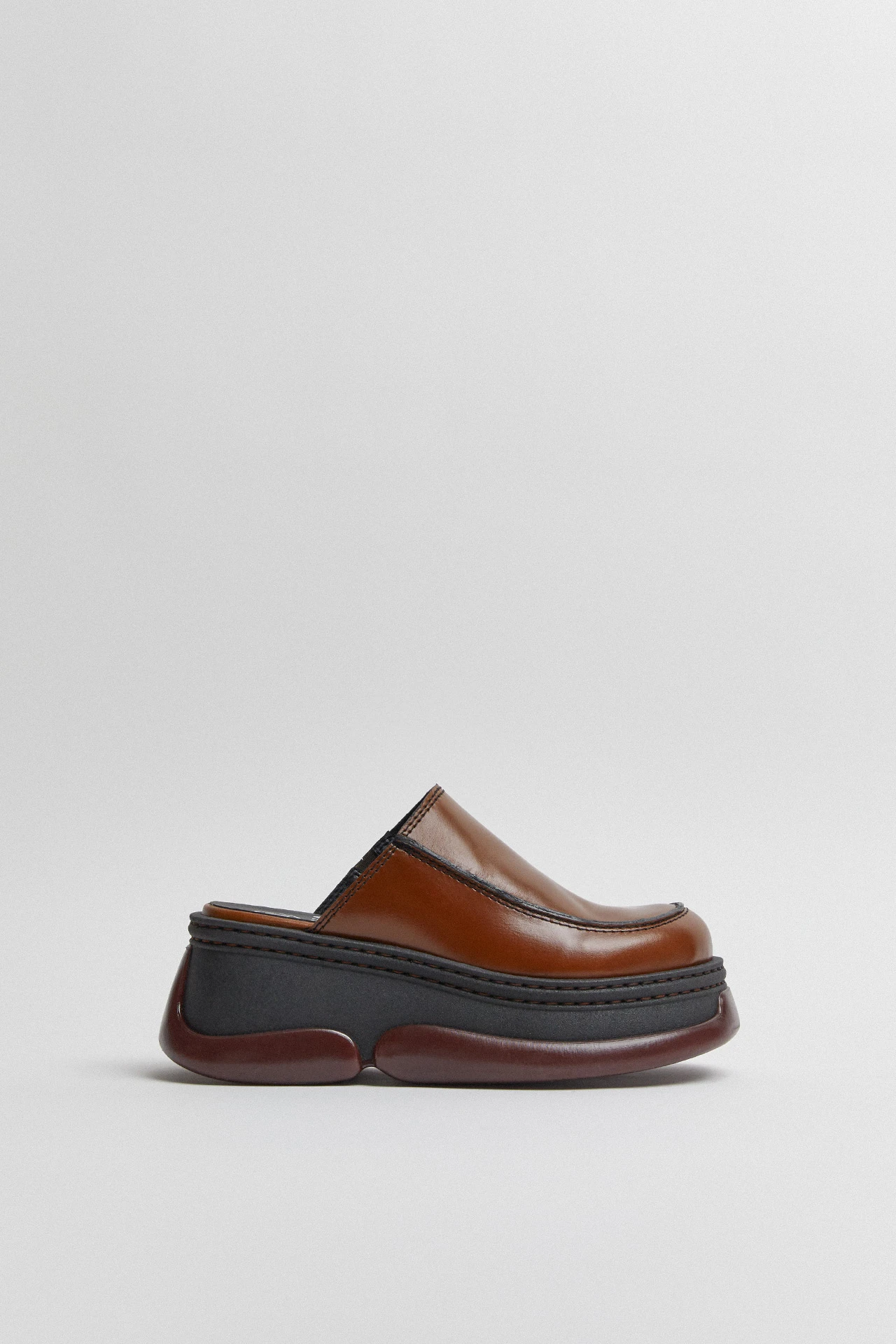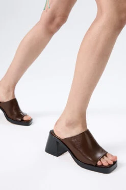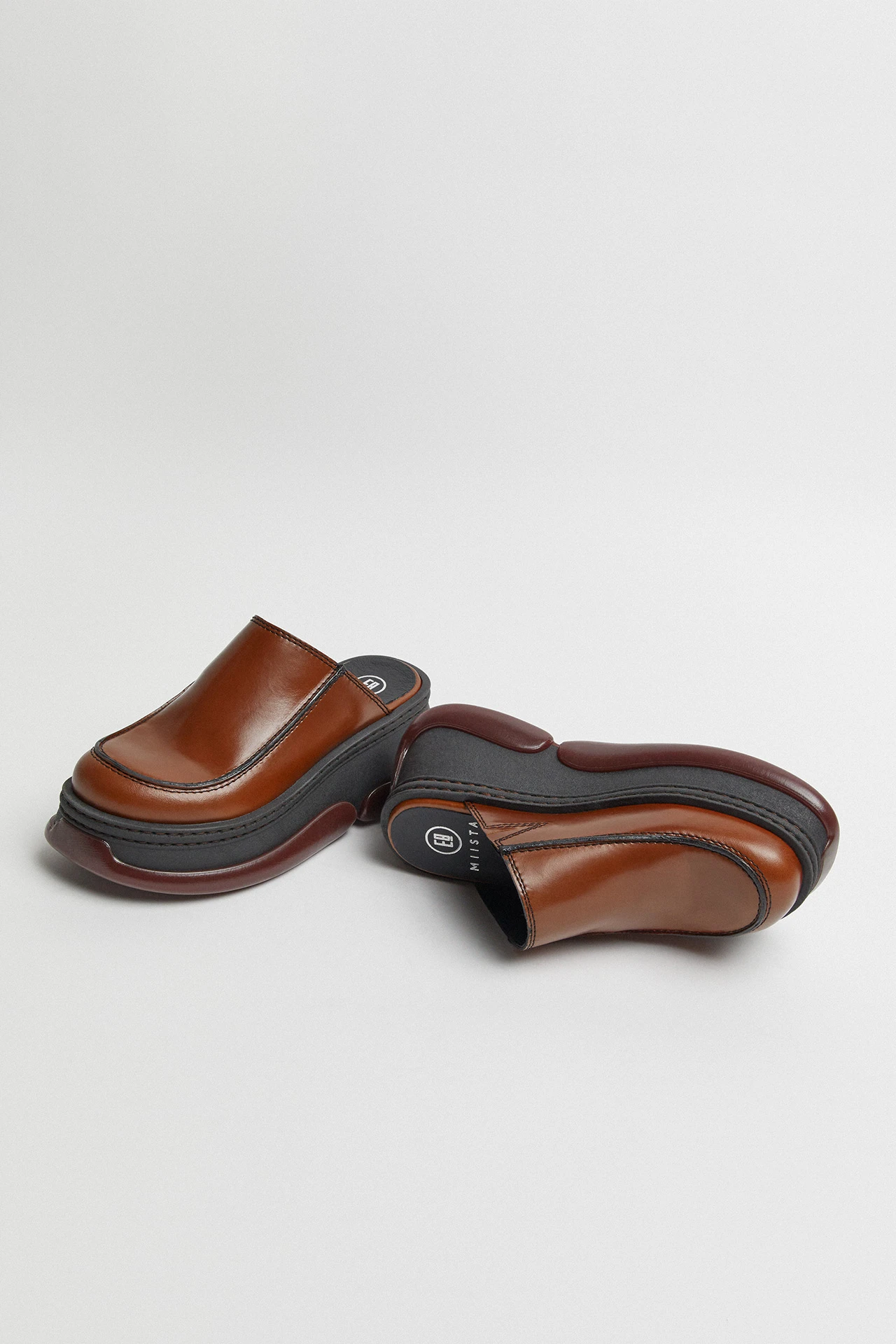 Who is she? And is she from the 1990s? Or from 2090? Brietta applies a pseudo-futuristic Japanese touch to our metamorphosized mule. Atop a thick black rubber flatform sole complete with contrast bubble outer wrapping, her sumptuous brown cow leather upper is formed of two curving panels – and joined with invisible stitching that juts outwards for maximum impact. Who is she? She’s yours.