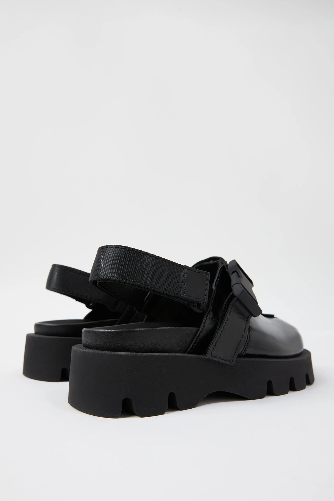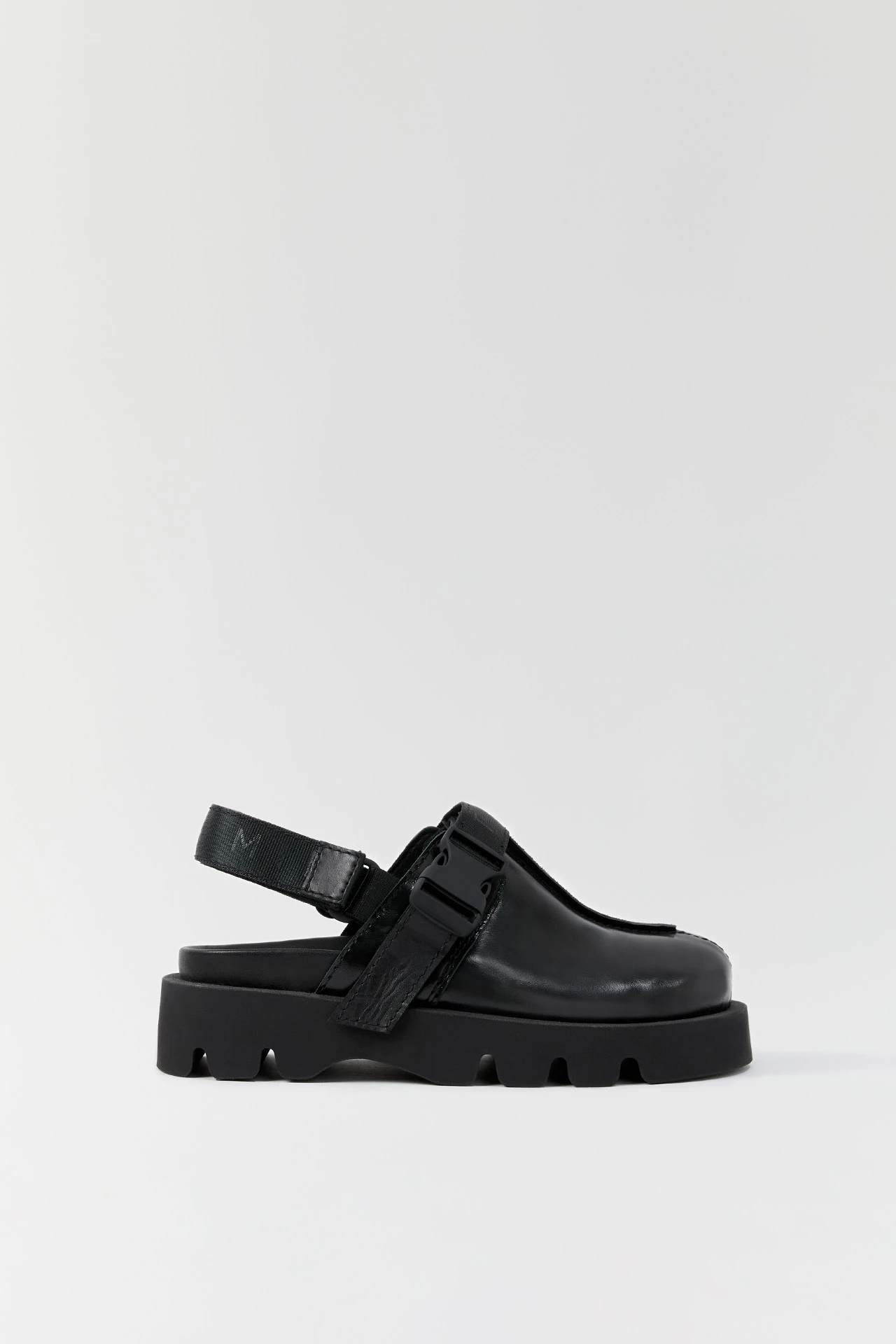 Clive is a pseudo-sporty mule-clog. His upper is robust, formed of shiny box cow leather and featuring a central seam to the front that’s been part sttiched and part rubberised. A top strap runs across said upper to meet a soft-touch rubberised plastic buckle, with a velcro branded nylon strap protruding from its back to hold Clive’s wearer comfortably in position. His rubber sole is grounded in curved cleating to form a wave effect. Slip Clive on, and you’ll find a raised dimple massage sole within. Surprise!