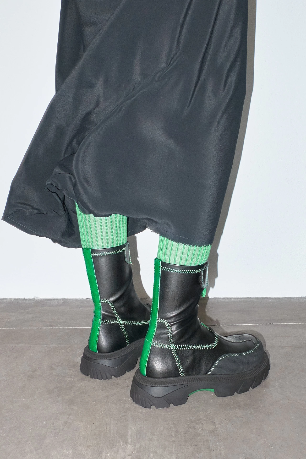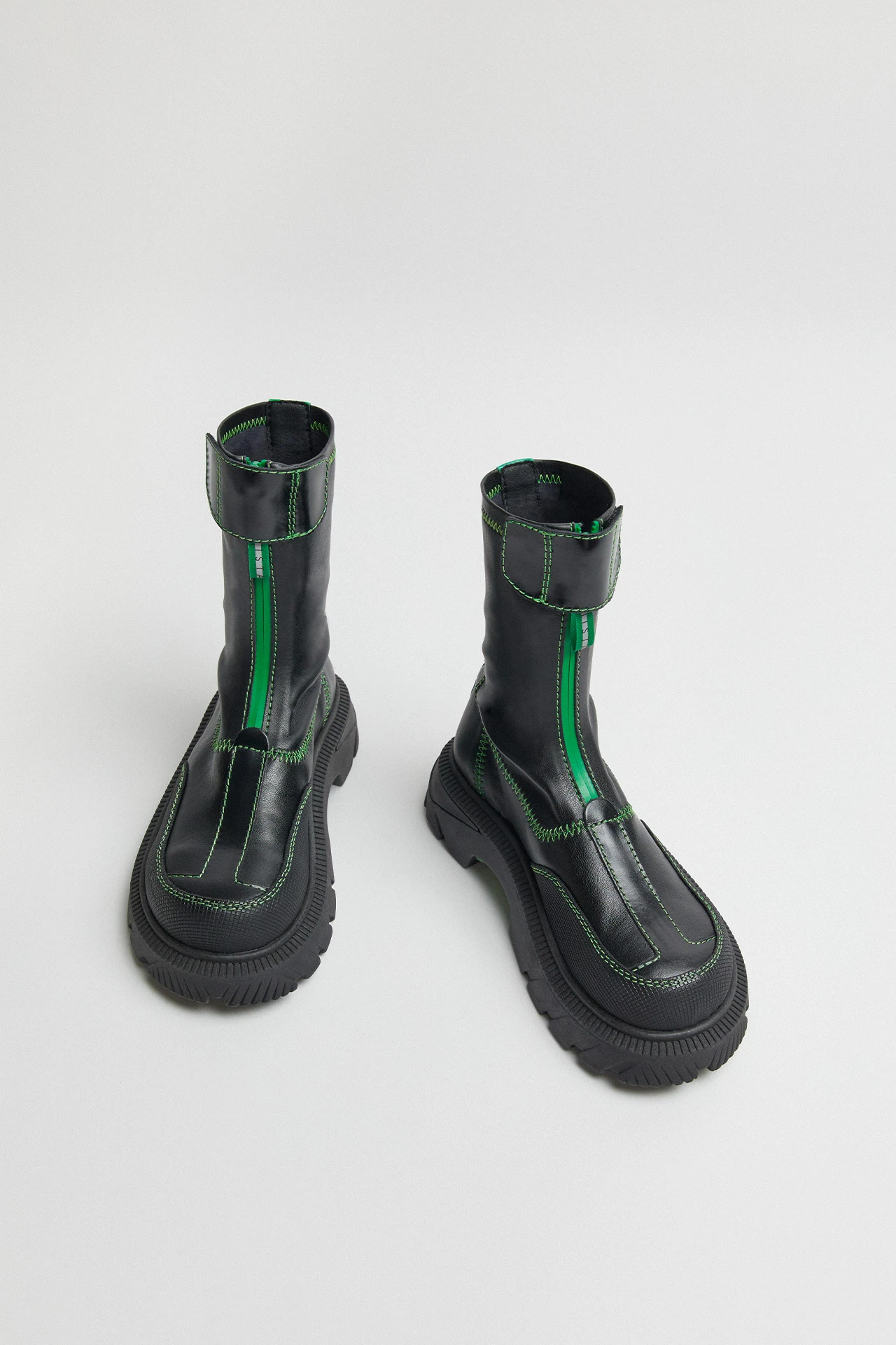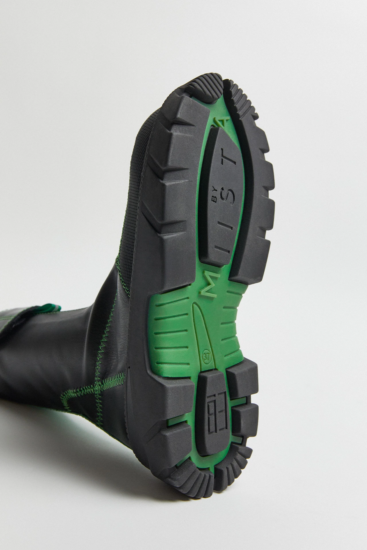 Danica is ready for anything. She’s a black ankle boot featuring a rubberized black centre zip, velcro strap, textured rubber panels, and contrasting zig-zag green stitching all over. And to top it all off, she’s got a heavy duty rubber tread sole for supreme comfort through thick and thin.