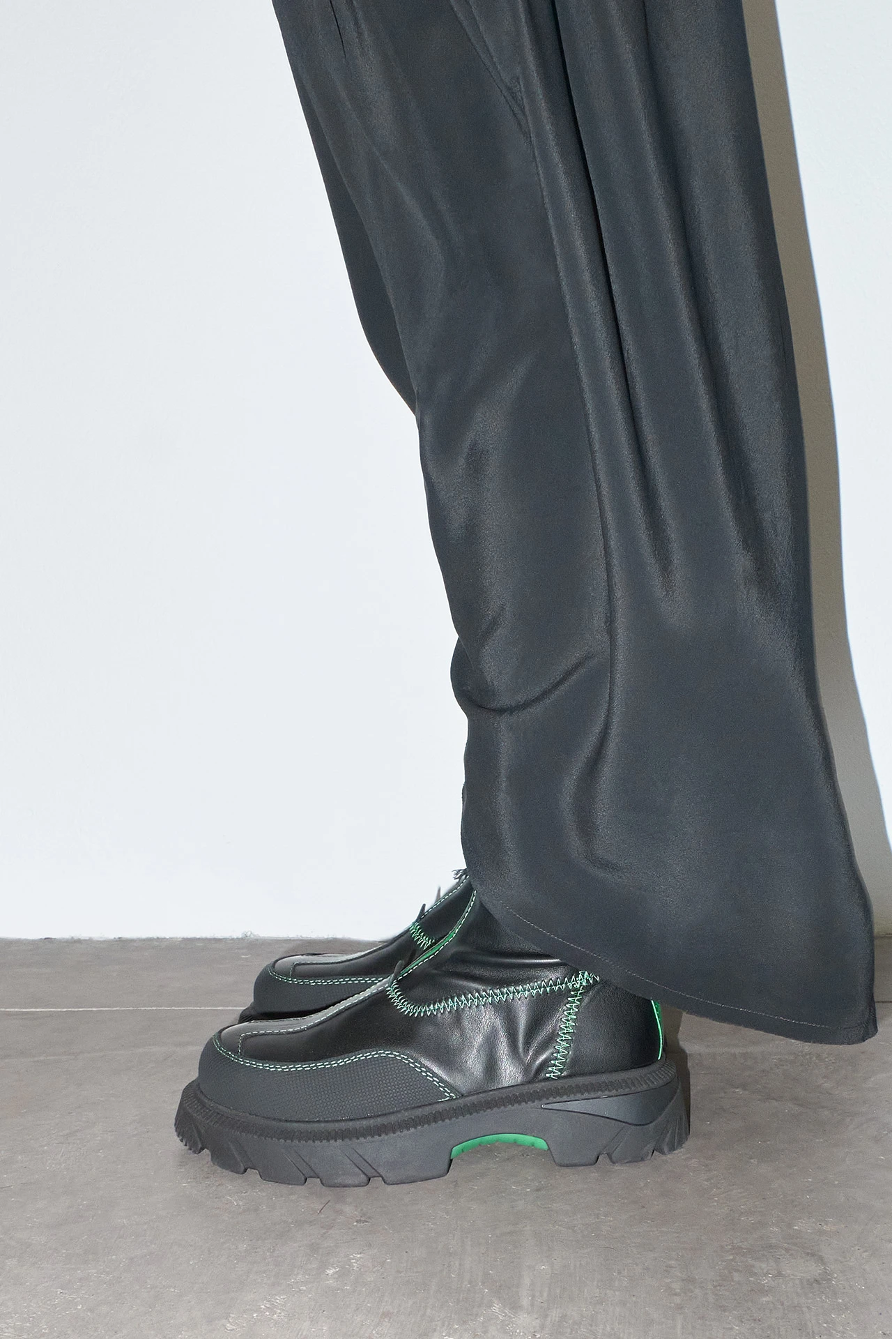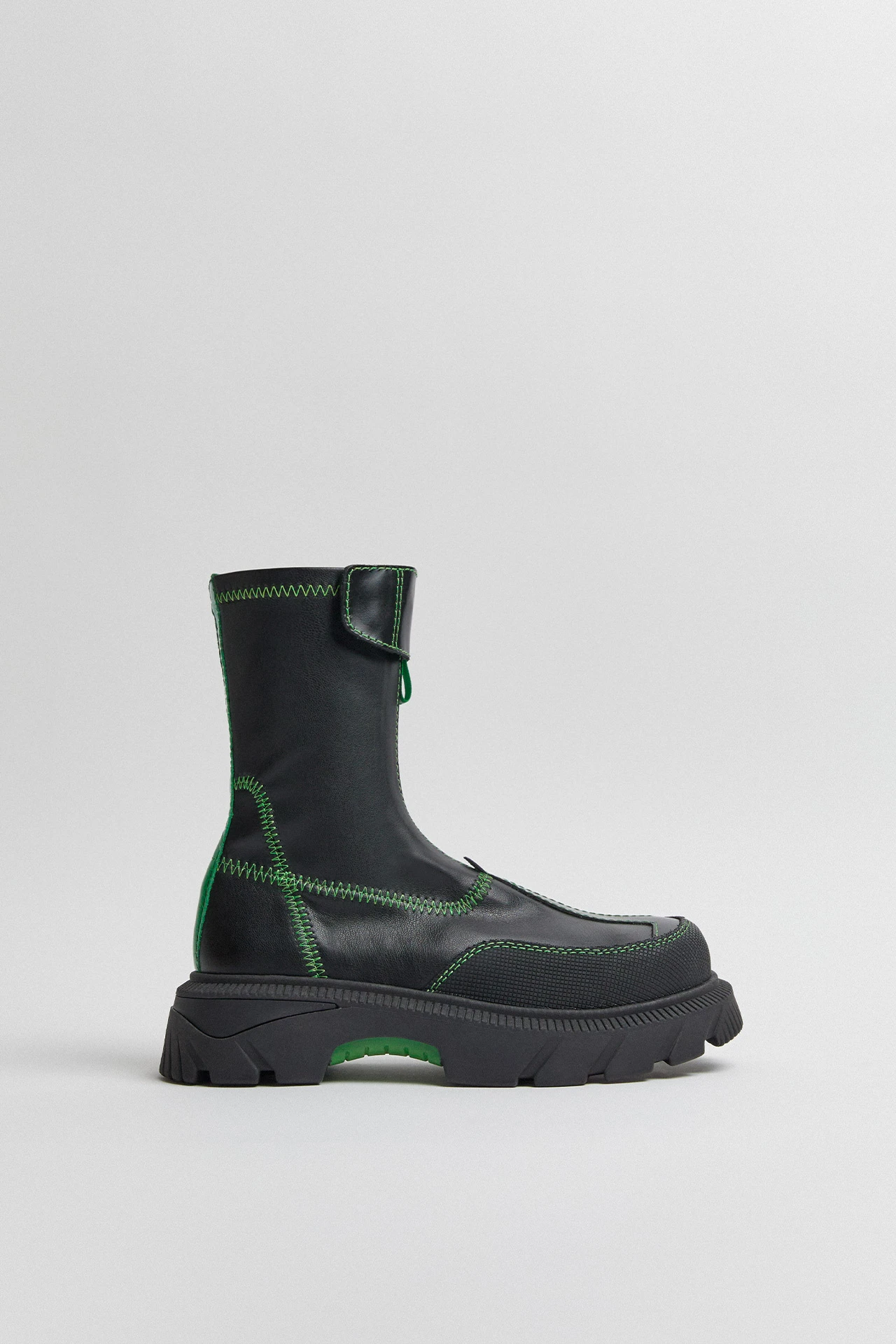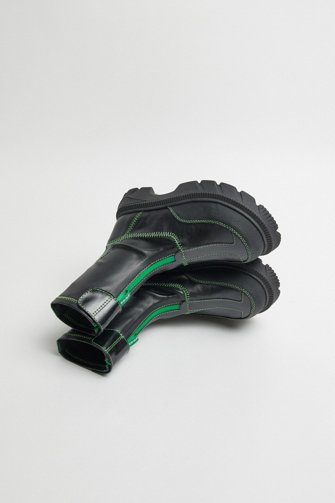 Danica is ready for anything. She’s a black ankle boot featuring a rubberized black centre zip, velcro strap, textured rubber panels, and contrasting zig-zag green stitching all over. And to top it all off, she’s got a heavy duty rubber tread sole for supreme comfort through thick and thin.