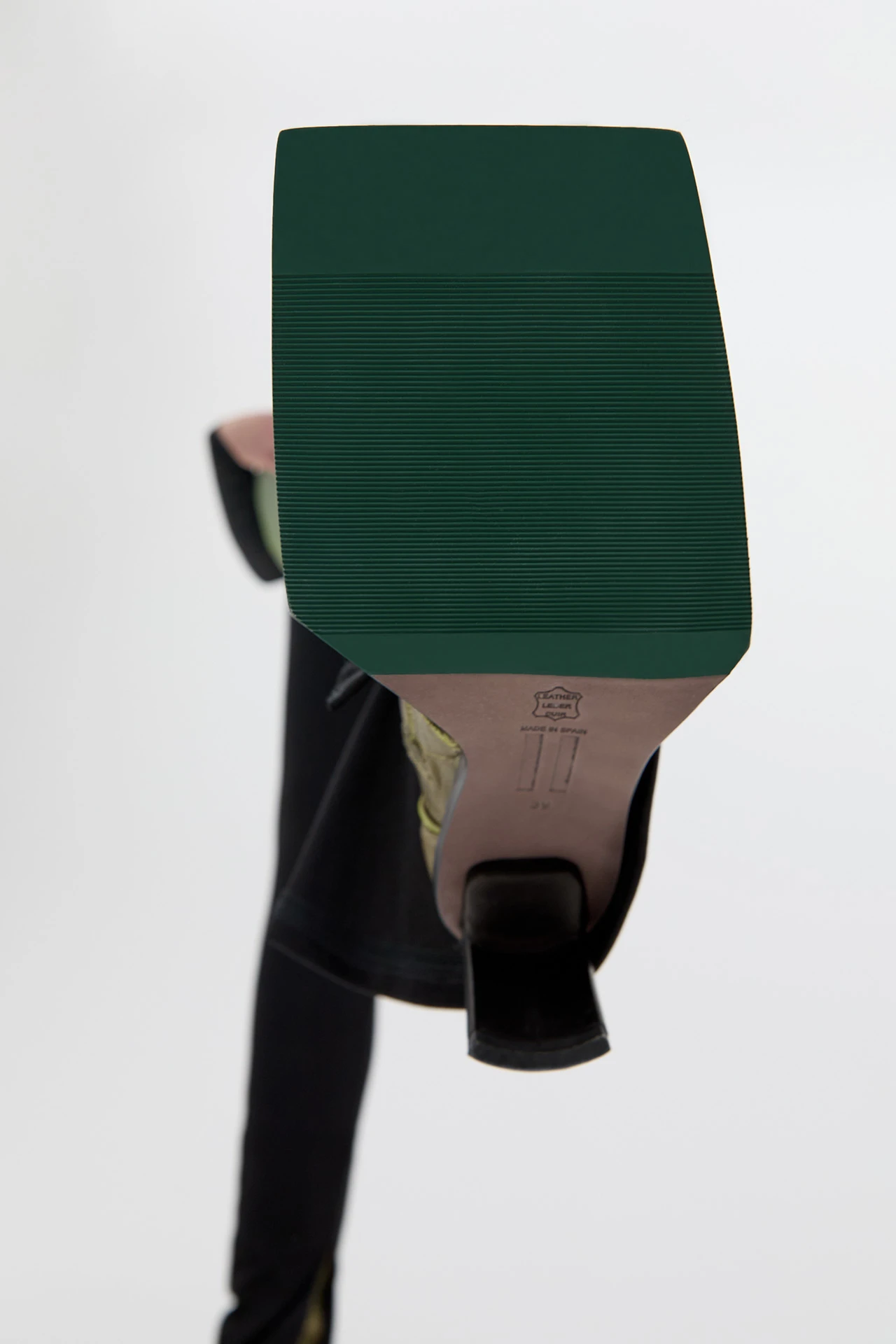 Try and figure out Eimi: a boot made up of a complex patchwork of panels handcrafted from soft khaki stretch nappa leather, finished with contrast neon lime overlock stitching. Featuring our signature ultra-thin straight heel and a black oversized angular rubberised sole that extends around the toe.