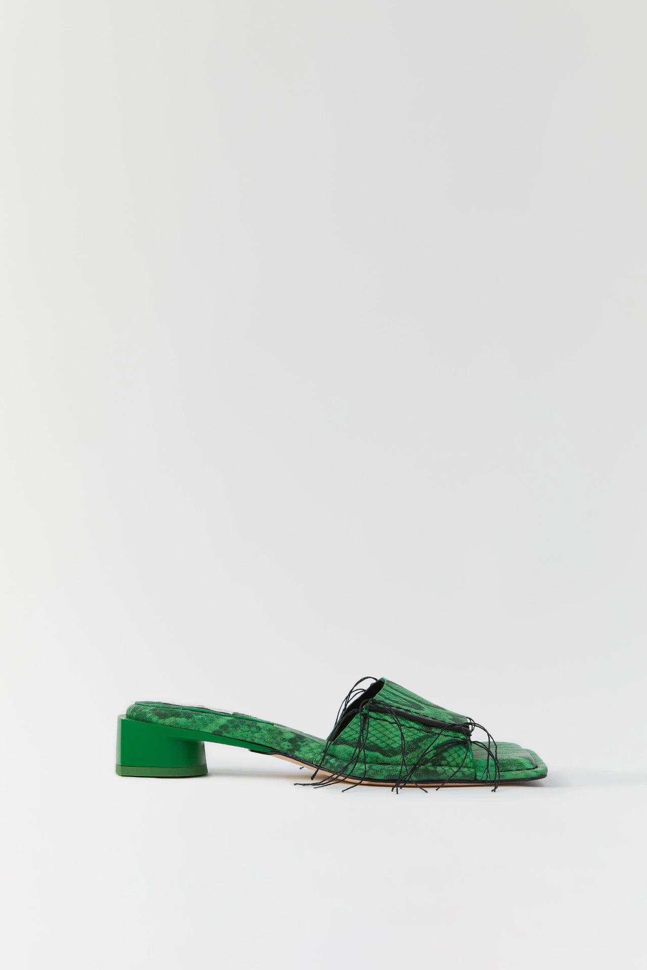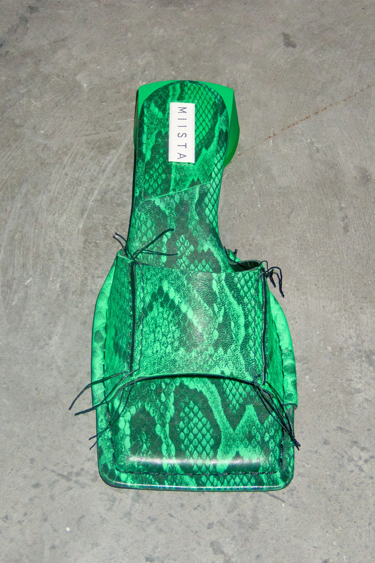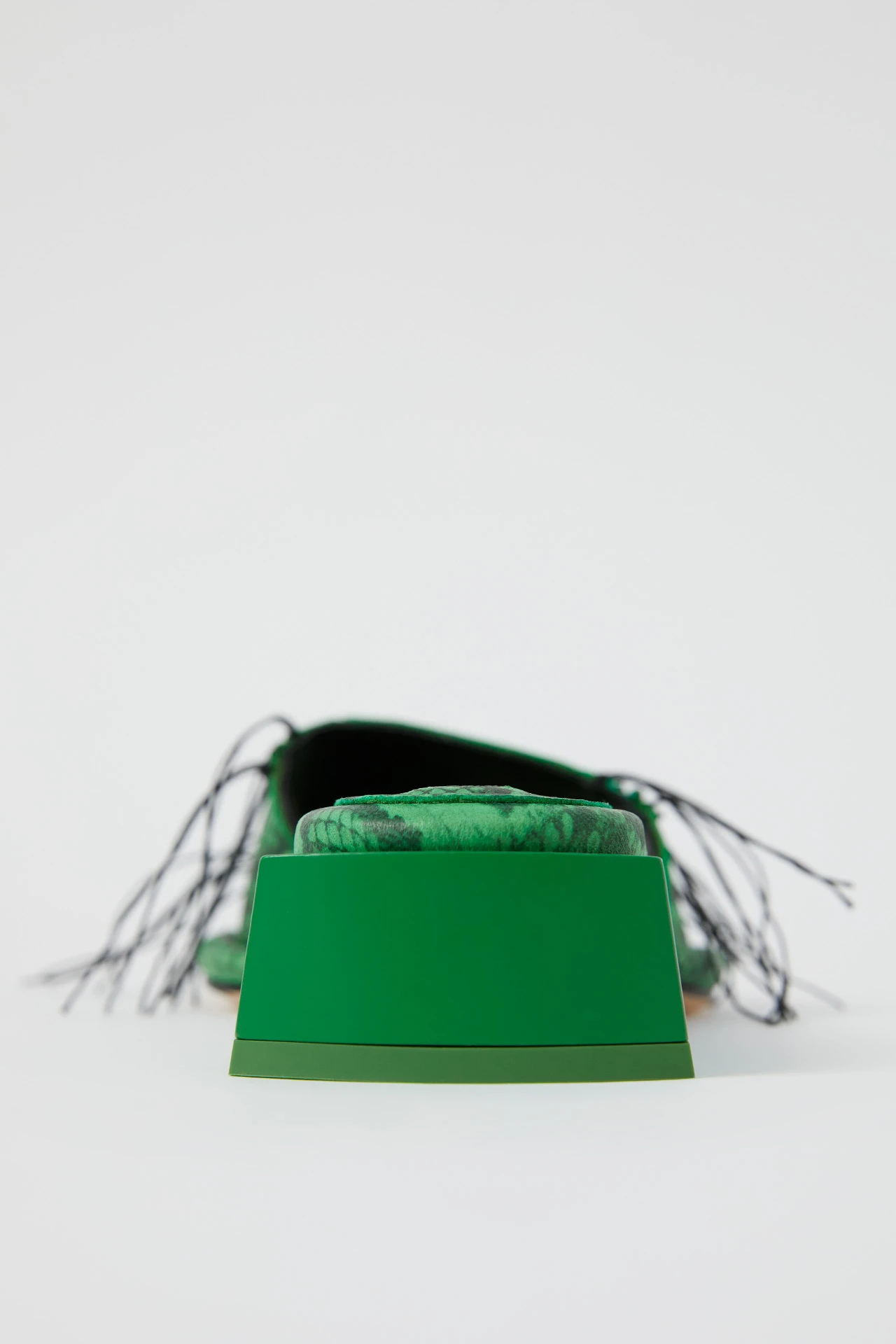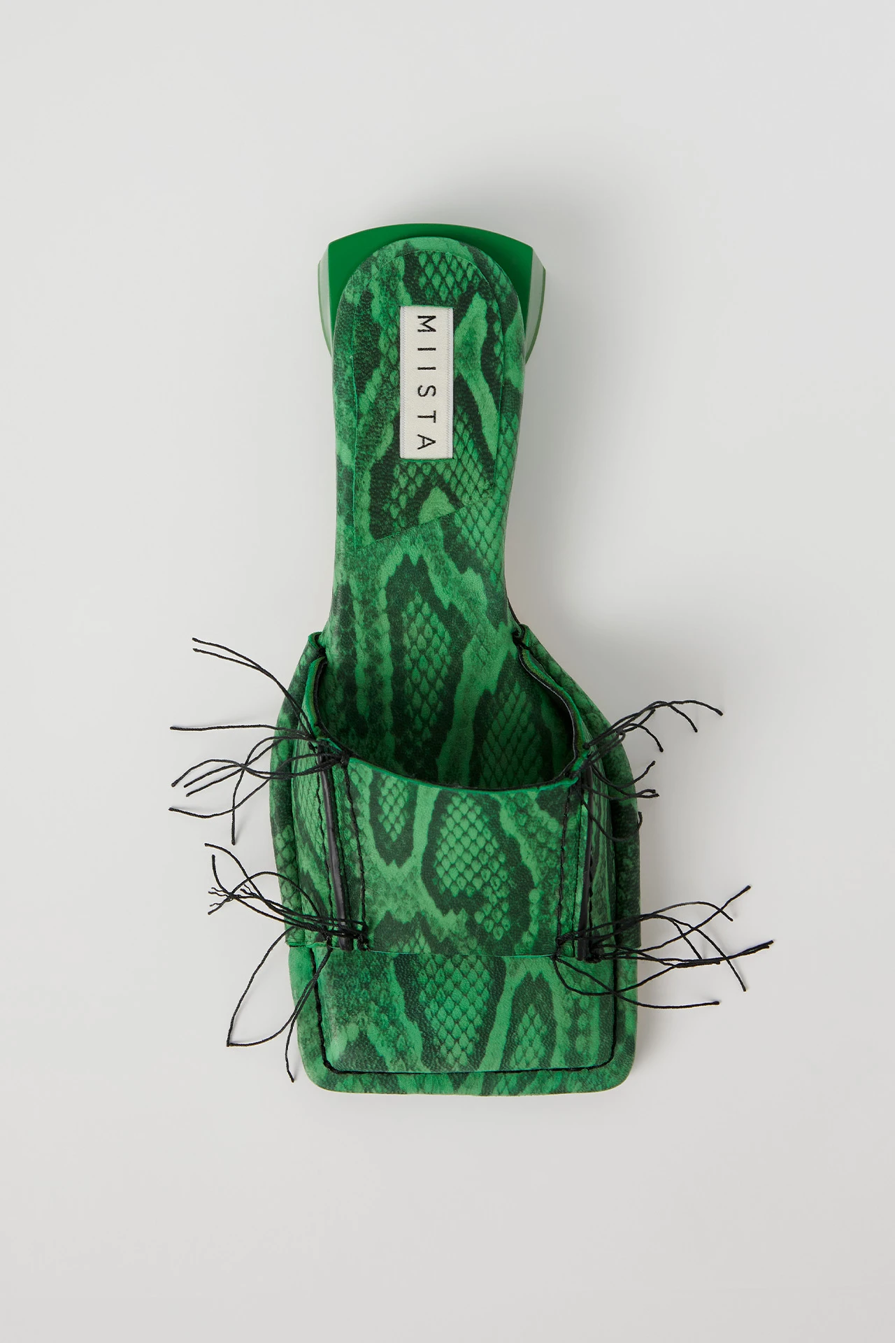 A fabulous Icon, is Fifi. But with her low-lying nature, she’ll keep you grounded too. In opposition to all things archetypal, her short rubberized painted heel inverts the classic footwear format – finished with an almost-flat drop-off at the back, and rounded to the front. Her green snake skin effect upper lands in panelled sheep leather, bound with contrasting black rubberized wax edging and overlock stitching – uncut to create decorative loose threads that flutter as you move. No Icon is complete without memory foam insoles and vegetable tan cow leather lining for enhanced comfort, plus a rubber heel cap and rubber-invected toe protecting its vegetable tan cow leather sole. Heel Height 3cm This style is true to size. We recommend selecting your standard European size. Designed in London | Handcrafted in Spain