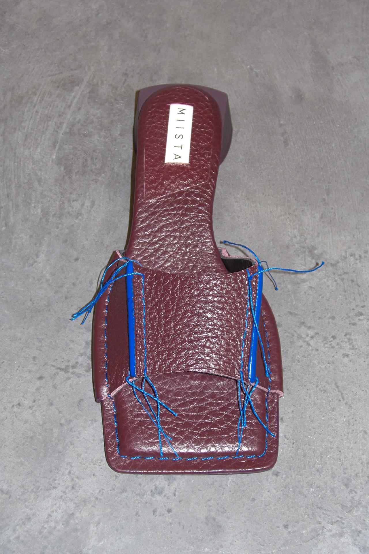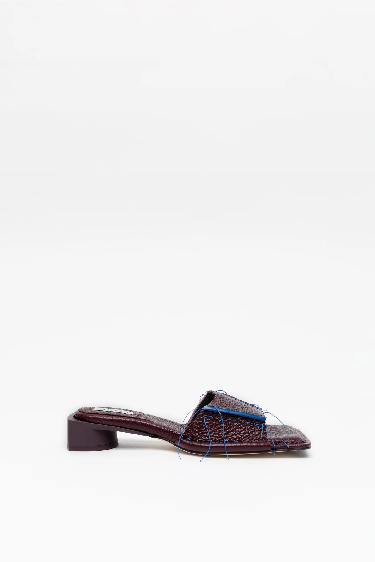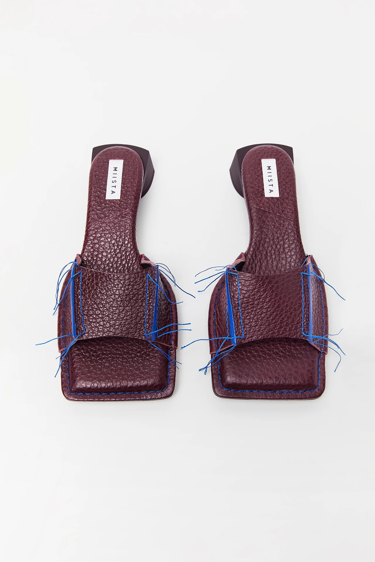 A fabulous Icon, is Fifi. But with her low-lying nature, she’ll keep you grounded too. In opposition to all things archetypal, her short rubberized painted heel inverts the classic footwear format – finished with an almost-flat drop-off at the back, and rounded to the front. Her purple upper lands in panelled tumbled-texture cow leather, bound with contrasting blue rubberized wax edging and overlock stitching – uncut to create decorative loose threads that flutter as you move. No Icon is complete without memory foam insoles and vegetable tan cow leather lining for enhanced comfort, plus a rubber heel cap and rubber-invected toe protecting its vegetable tan cow leather sole. Heel Height 3cm This style is true to size. We recommend selecting your standard European size. Designed in London | Handcrafted in Spain