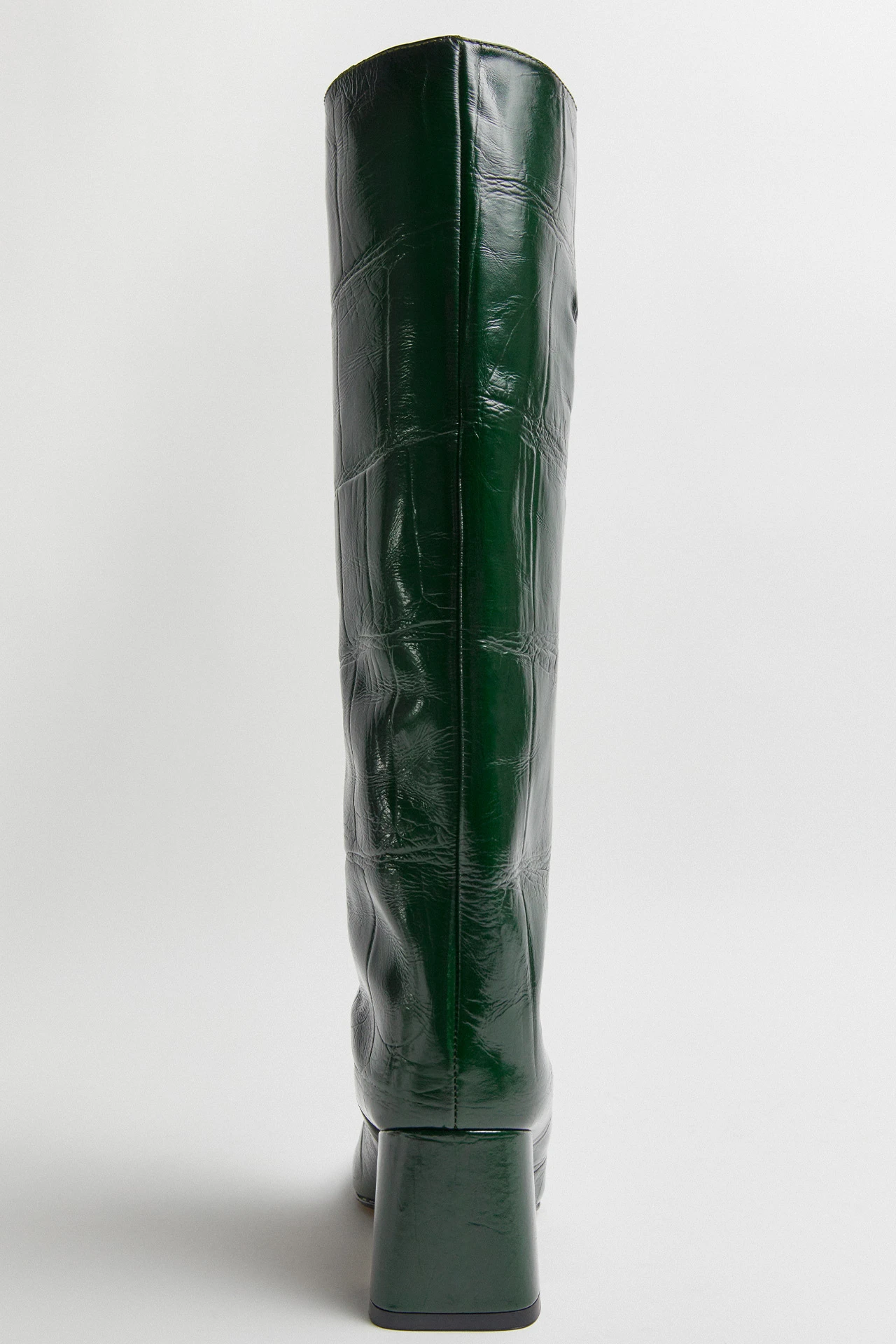 Tall and imposing, Finola is a knee-high, wide-leg boot crafted from textured calf leather that transforms from dark to lime green. Featuring a block heel and elongated toe, Finola is finished with memory foam insoles, calf leather lining, and leather outsoles.