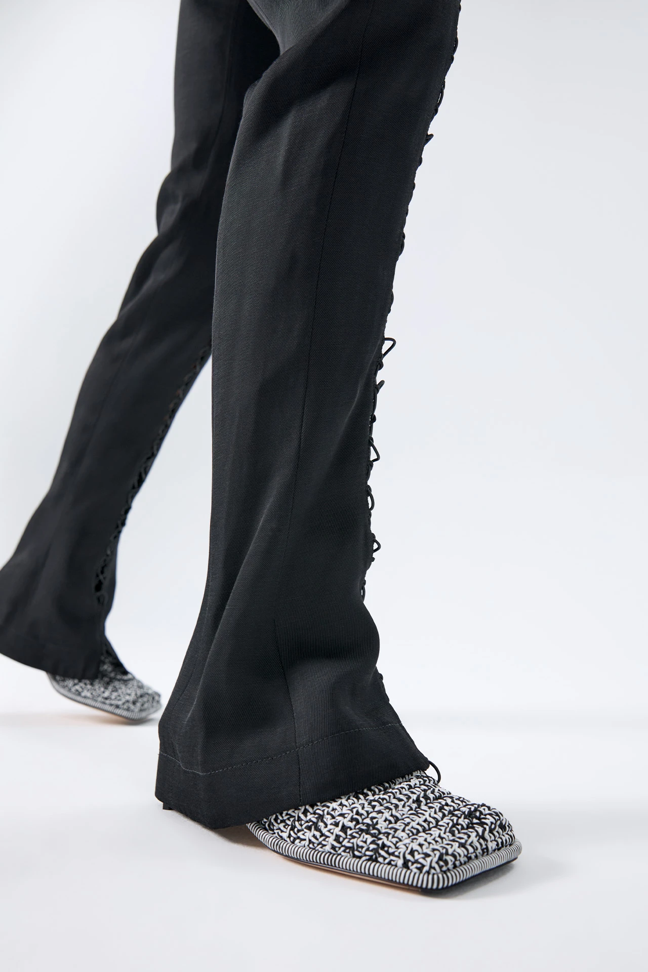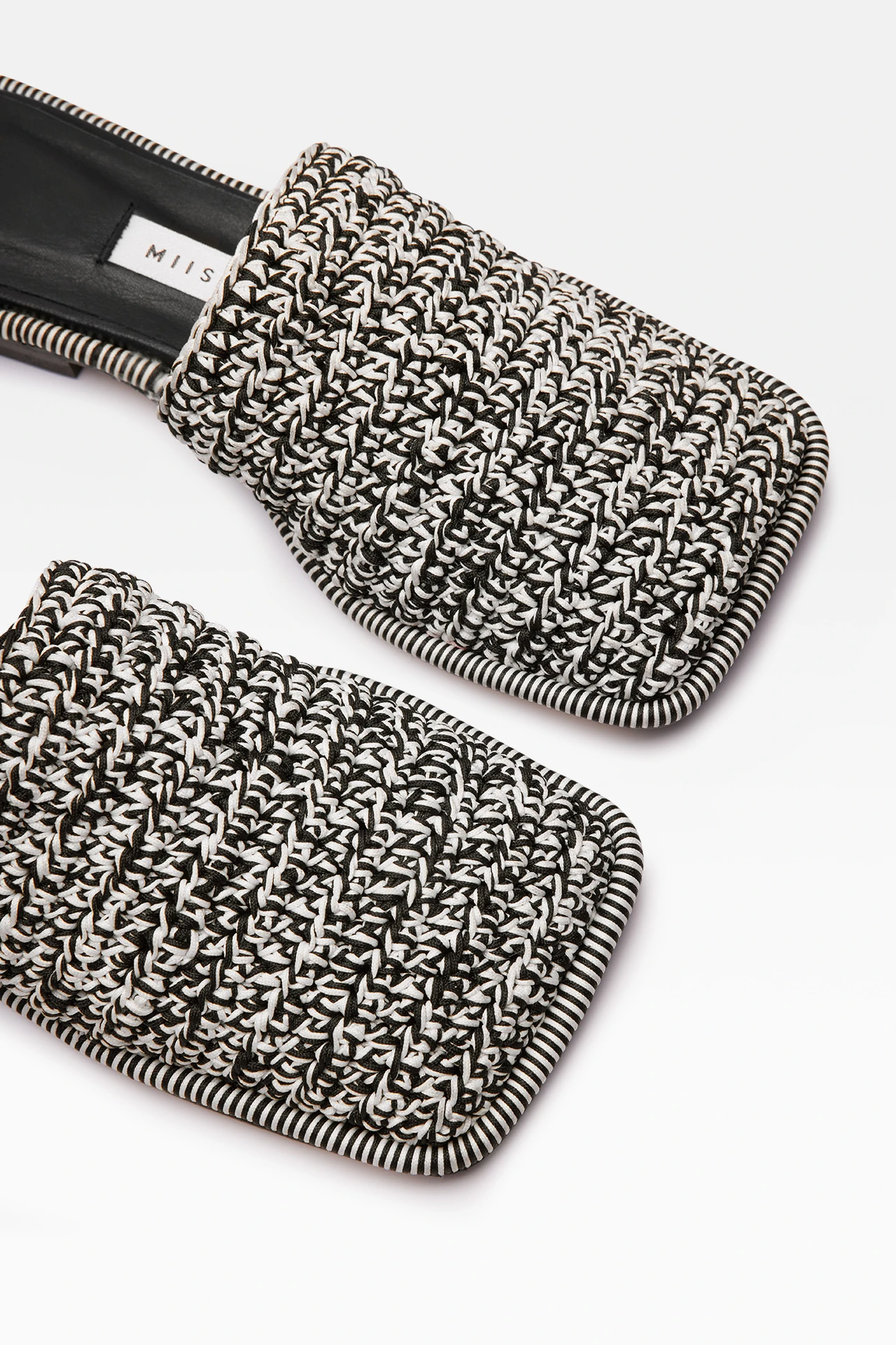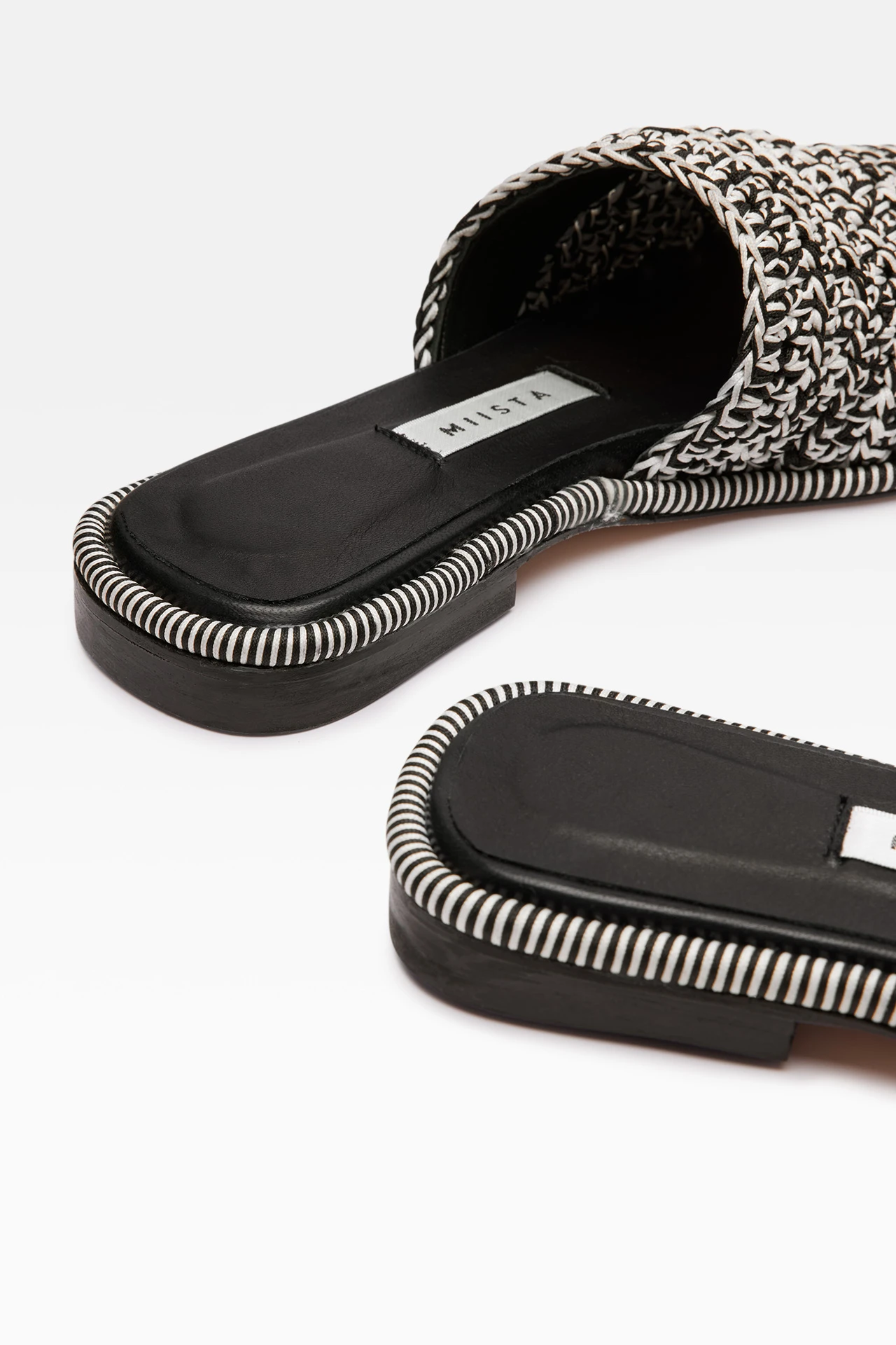 Employing multi-materiality, Gioia is an exploration of texture. Her macrame upper is handmade using traditional Galician techniques, combining black and white cotton to form a statement wide-set square toe edged with striped stitching to the welt. Her flat slimline heel stands in direct opposition, formed of robust rubber for a pleasing contrast. Gioia is complete with memory foam insoles and cow leather lining for enhanced comfort, plus a rubber heel cap and rubber-invected toe protecting its vegetable tan cow leather sole. Heel Height 1,5cm This style is true to size. We recommend selecting your standard European size. Designed in London | Handcrafted in Spain
