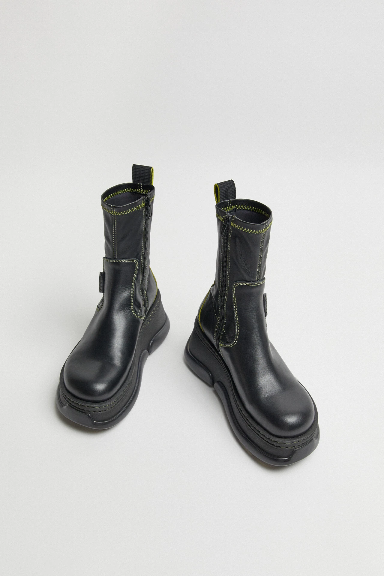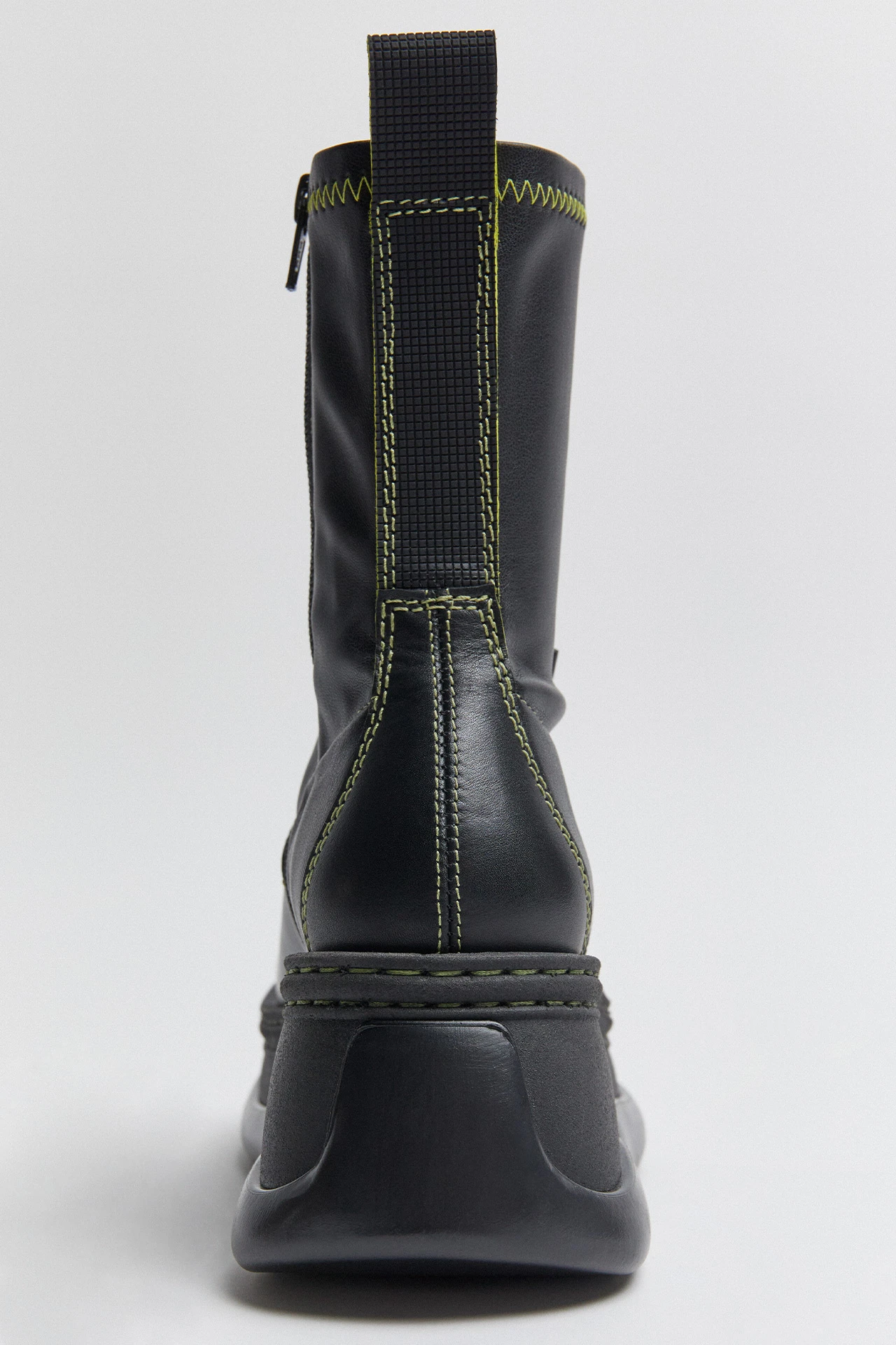Kattrin takes Brietta’s bubbles to new heights, applying the same pseudo-futuristic Japanese touch but transforming her into boot form. Atop a thick black rubber flatform sole complete with contrast bubble outer wrapping, her upper is built from three panels, reaching up to your mid-calf with a sock fit.