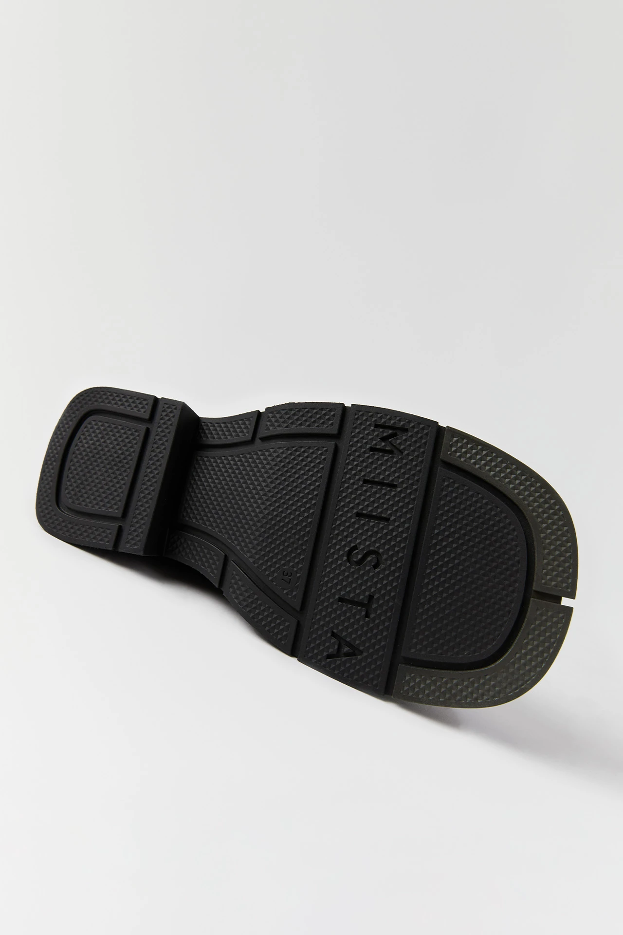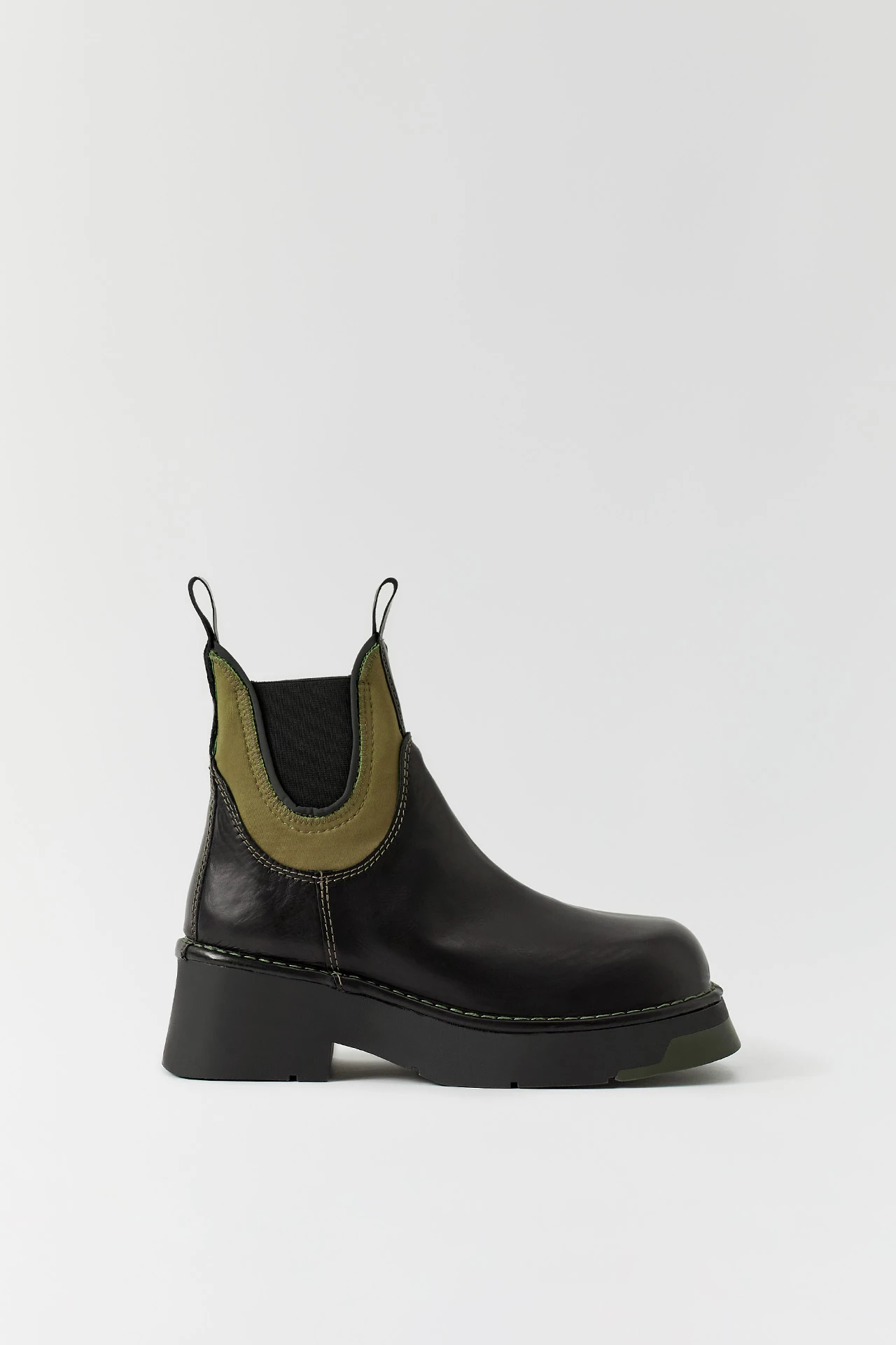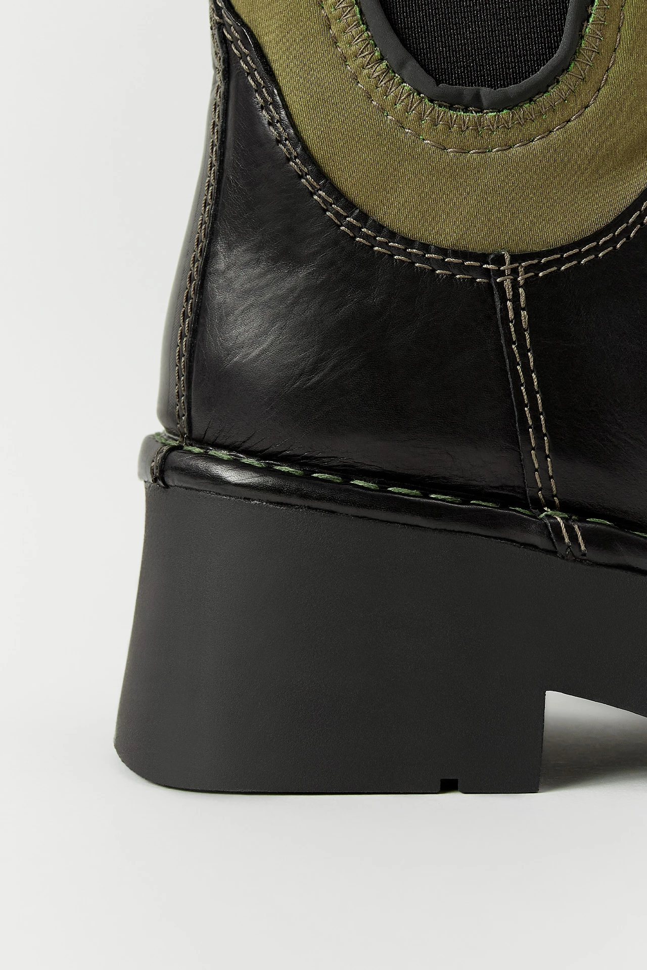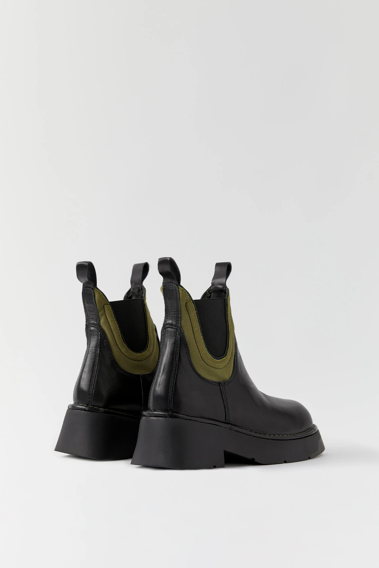 Featuring a thick rubber sole with a slight heel, Kaya takes the traditional chelsea boot to new heights. Her upper plays with multiple materials, combining black cow leather with an elastic khaki gusset of pull-on lycra. Visible stitching binds the panels together, running right up to loops on both the front and rear. But it’s not just Kaya’s upper that’s rich with personality: her robust toe, too, is full of character, leading down to a grey gap-tooth-esque insert at the toe of the sole.