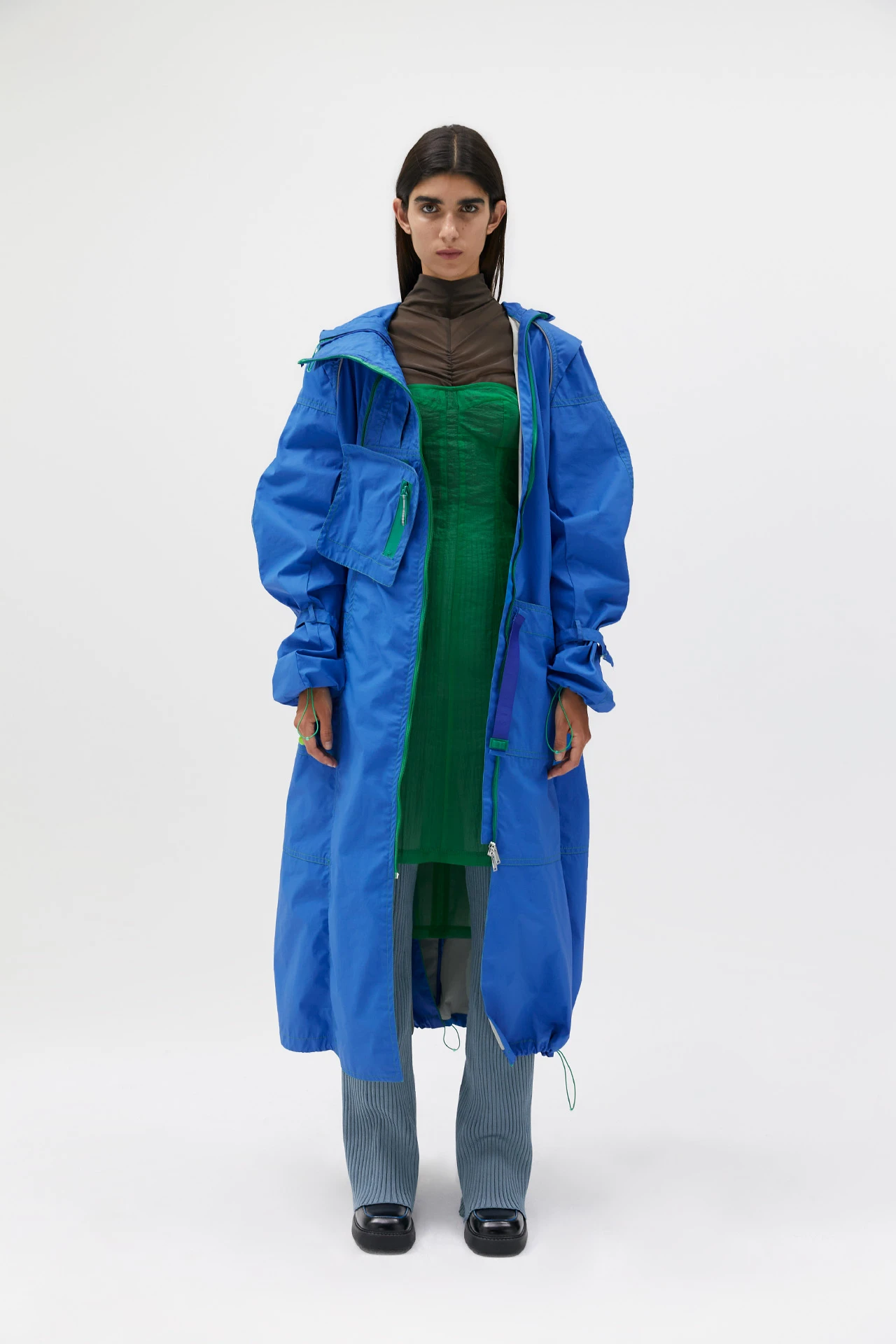 Kerri’s a ride. Reaching up to the mid-calf, she’s been crafted from a combination of geometric and free flowing panels of smooth black leather, plus one square of biker-inspired padding to the rear – all joined with contrasting piped green and blue seams.