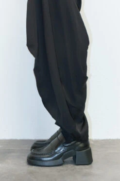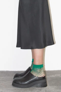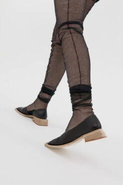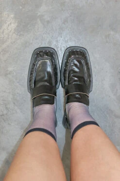 A Miista version of the d’Orsay pump, the elegant asymmetric upper is crafted from smooth brown calf leather and juxtaposed with an angular stacked leather heel and oversized sole finished with a doubled welt and metal staples.