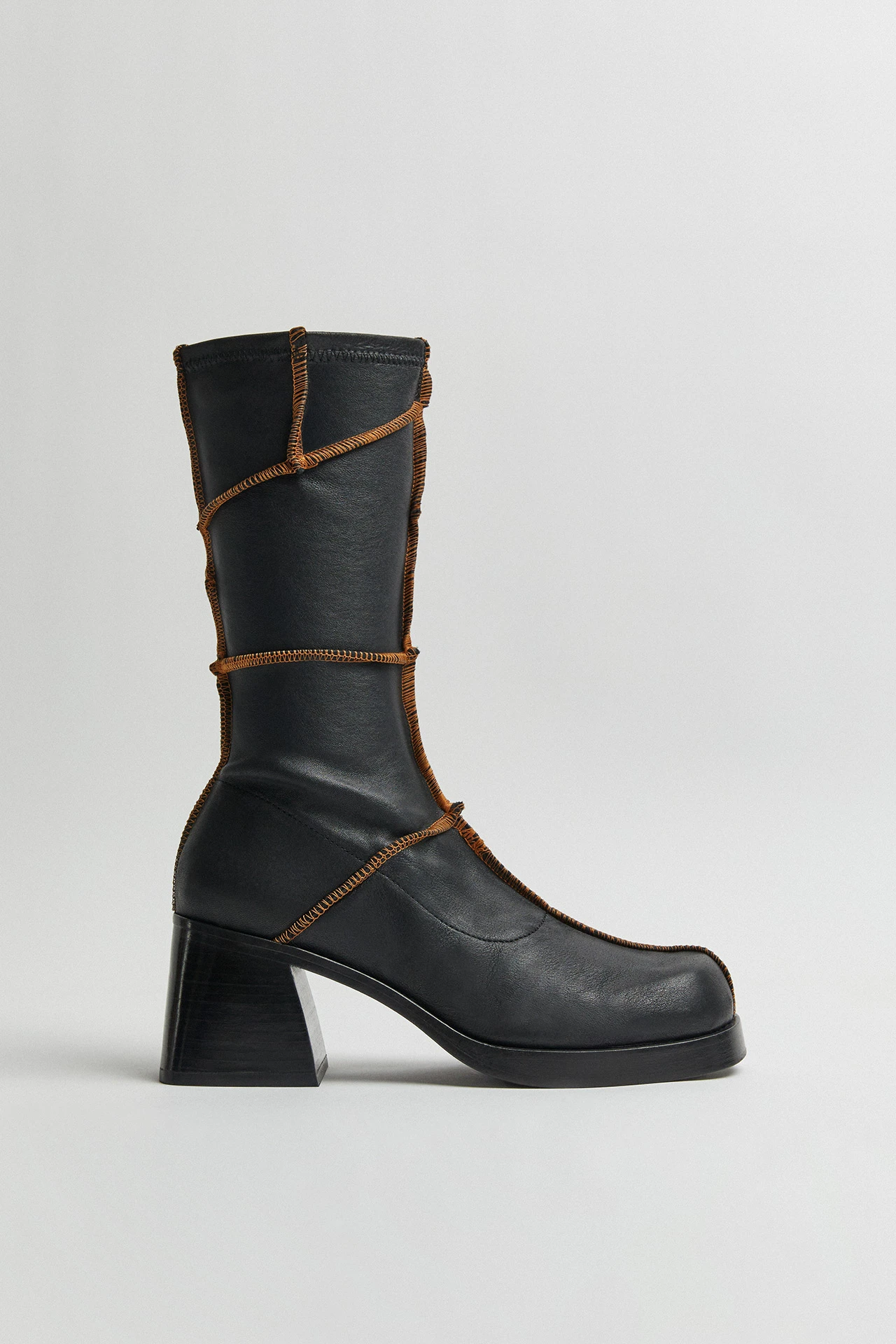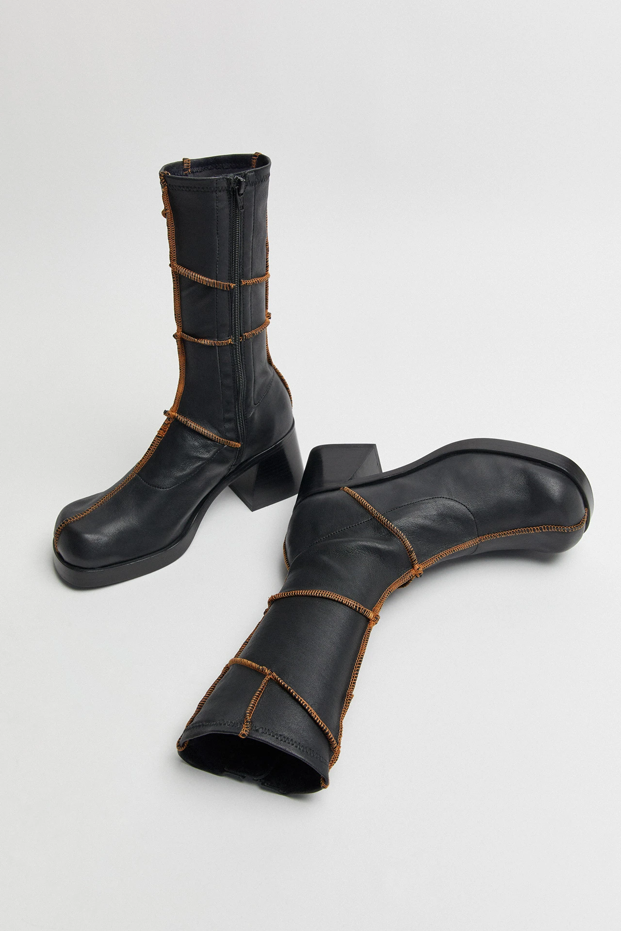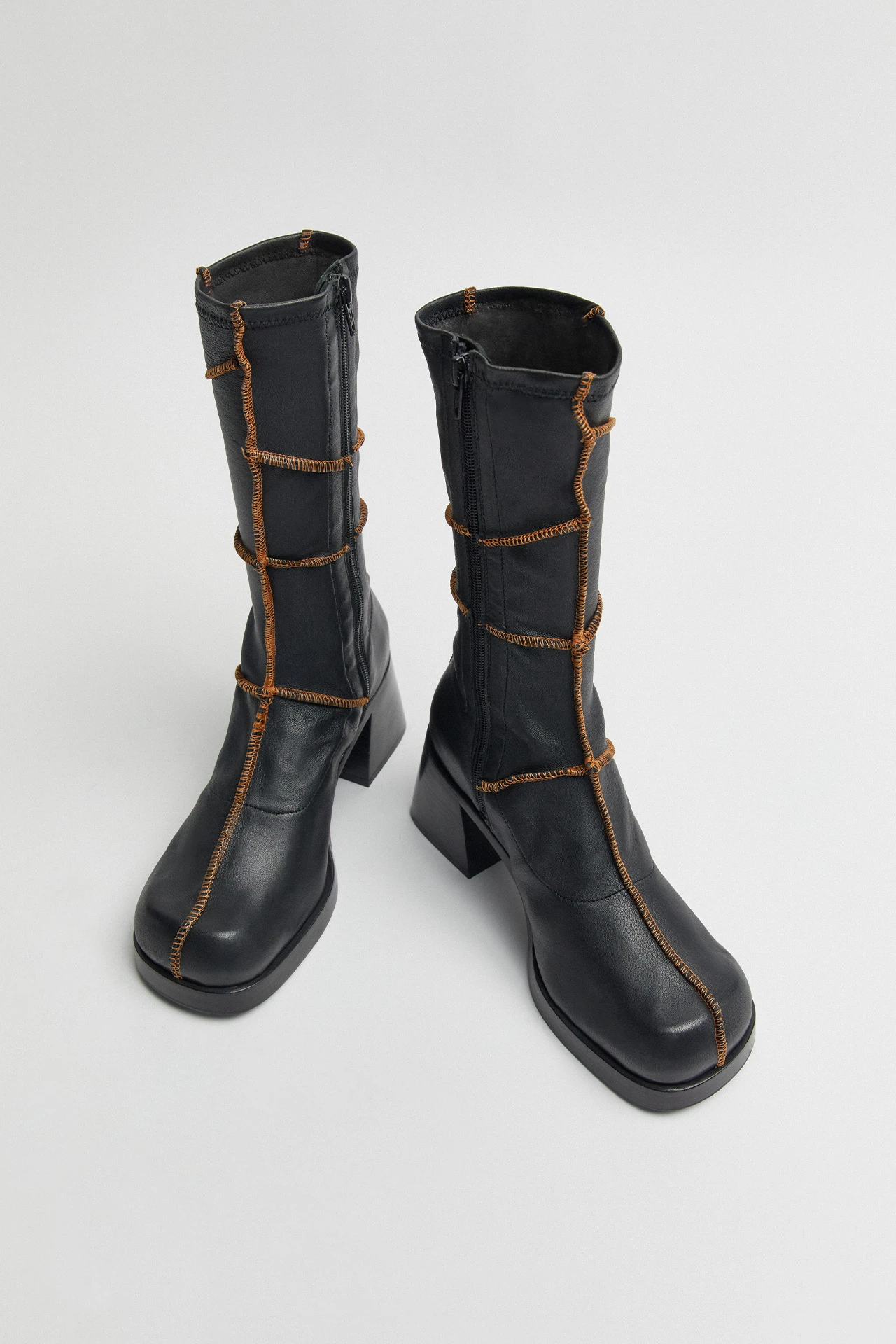 Merging an assortment of panels with overlocked contrast stitching, Lois is a subversive Icon for the people. Her vegetable tan stretch lamb leather upper reaches up to the mid-calf from her stacked heel and platform running the full length of the sole. Lois’ stretch factor and inner zip allow for a flattering, snug fit on all shapes and sizes. As with all Icons, she’s finished with memory foam insoles and vegetable tan cow leather lining for enhanced comfort, plus a rubber heel cap and rubber-invected toe on her vegetable tan cow leather sole for robust durability.