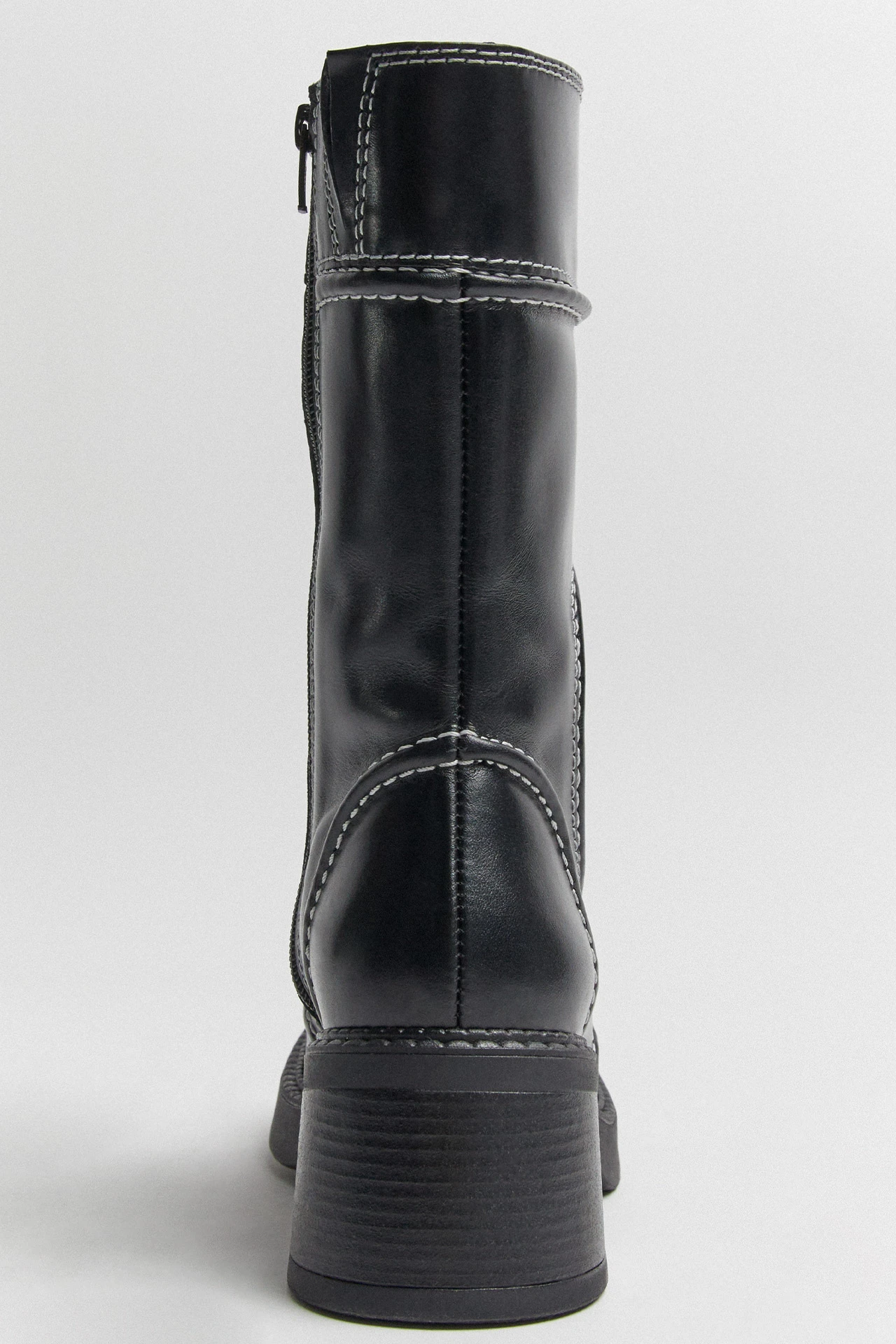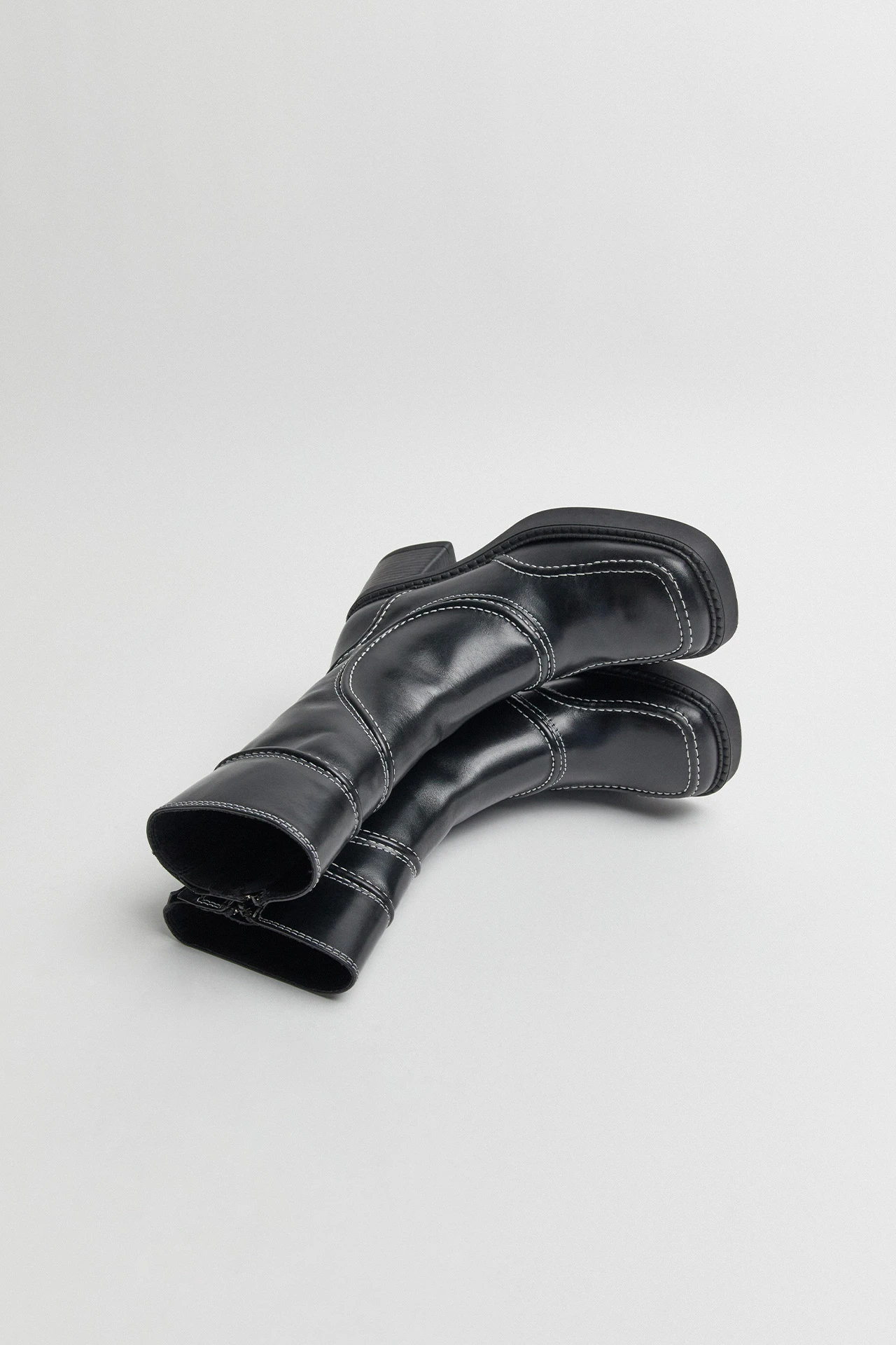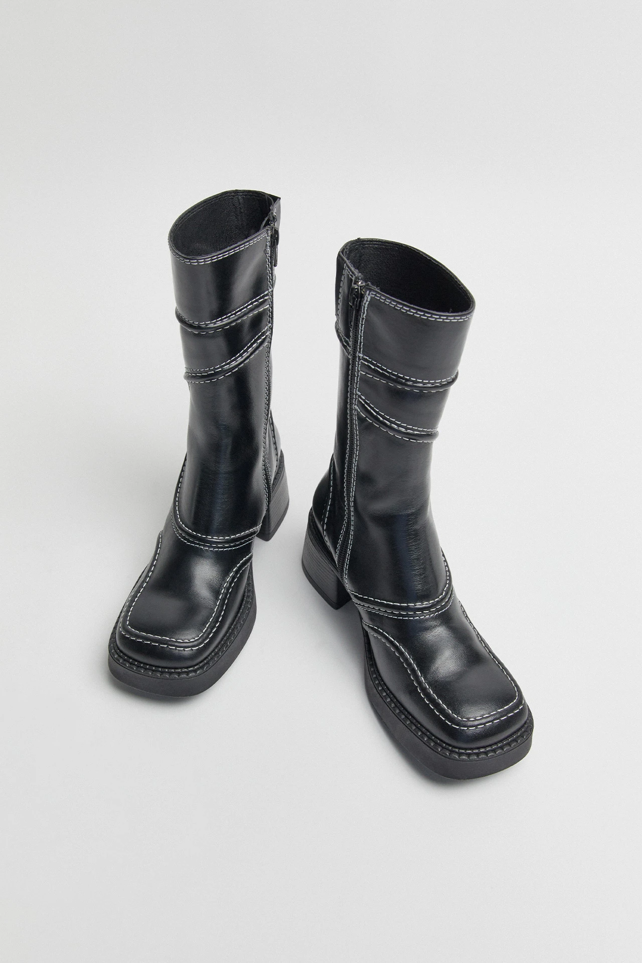 Malene reaches upwards to the mid calf, formed of contrasting panels and shapes that play with The Opposite Thing: squared edges meet flowing lines and circles morph into rectangles – all bound with double contrast white stitching and internal piping for extra emphasis. Malene’s rubber outsole is robust, with her mid-heel stacked and slightly flared, promising optimum comfort with no compromise on impact. She’s complete with an inner zip and a subtle elastic gusset for your perfect fit.