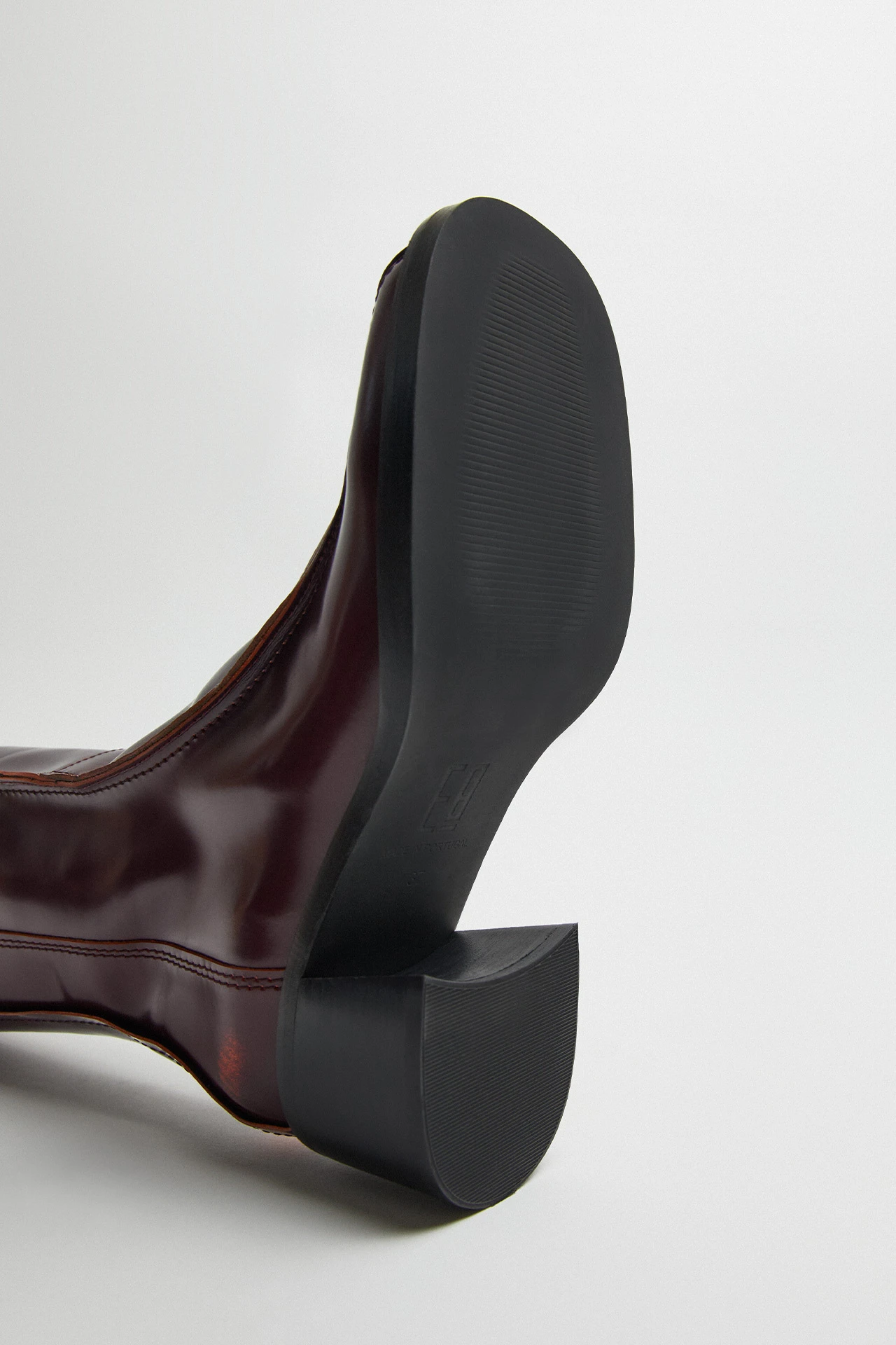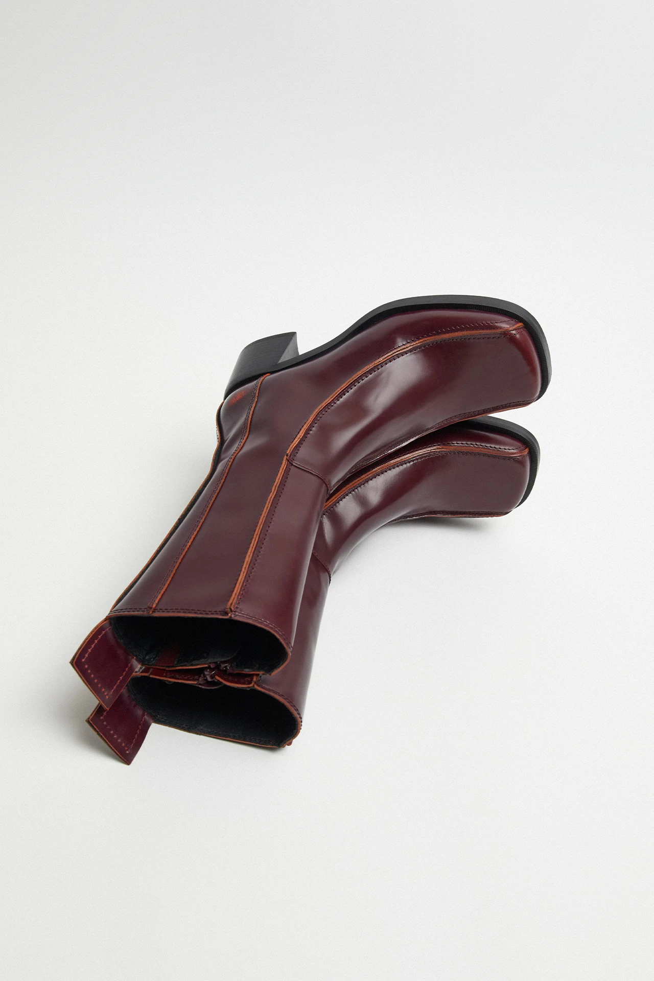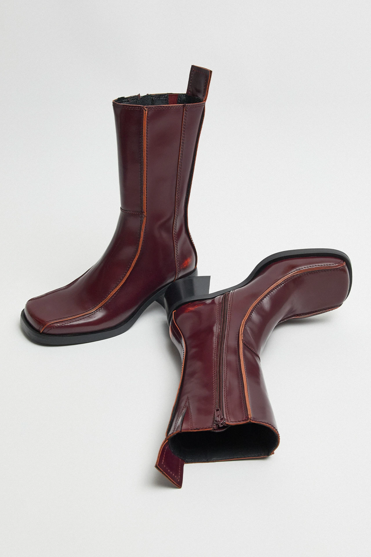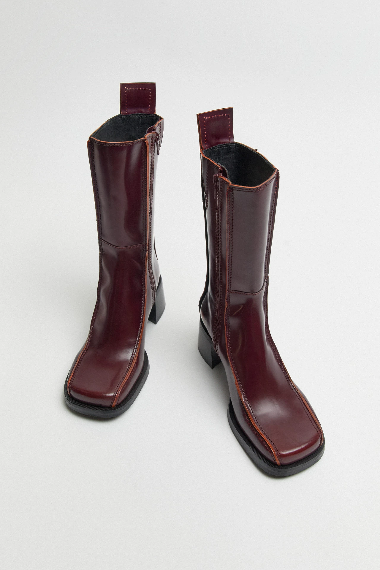 Tangerine piping joins a series of burgundy leather panels together in Mariela’s geometric design. She is set on an angular heel for an extra dose of stylish sensibilities, taking the classic everyday boot to new dimensions. The future is now. Heel Height: 6cm