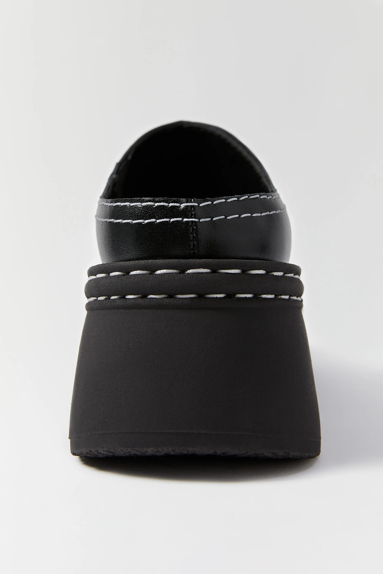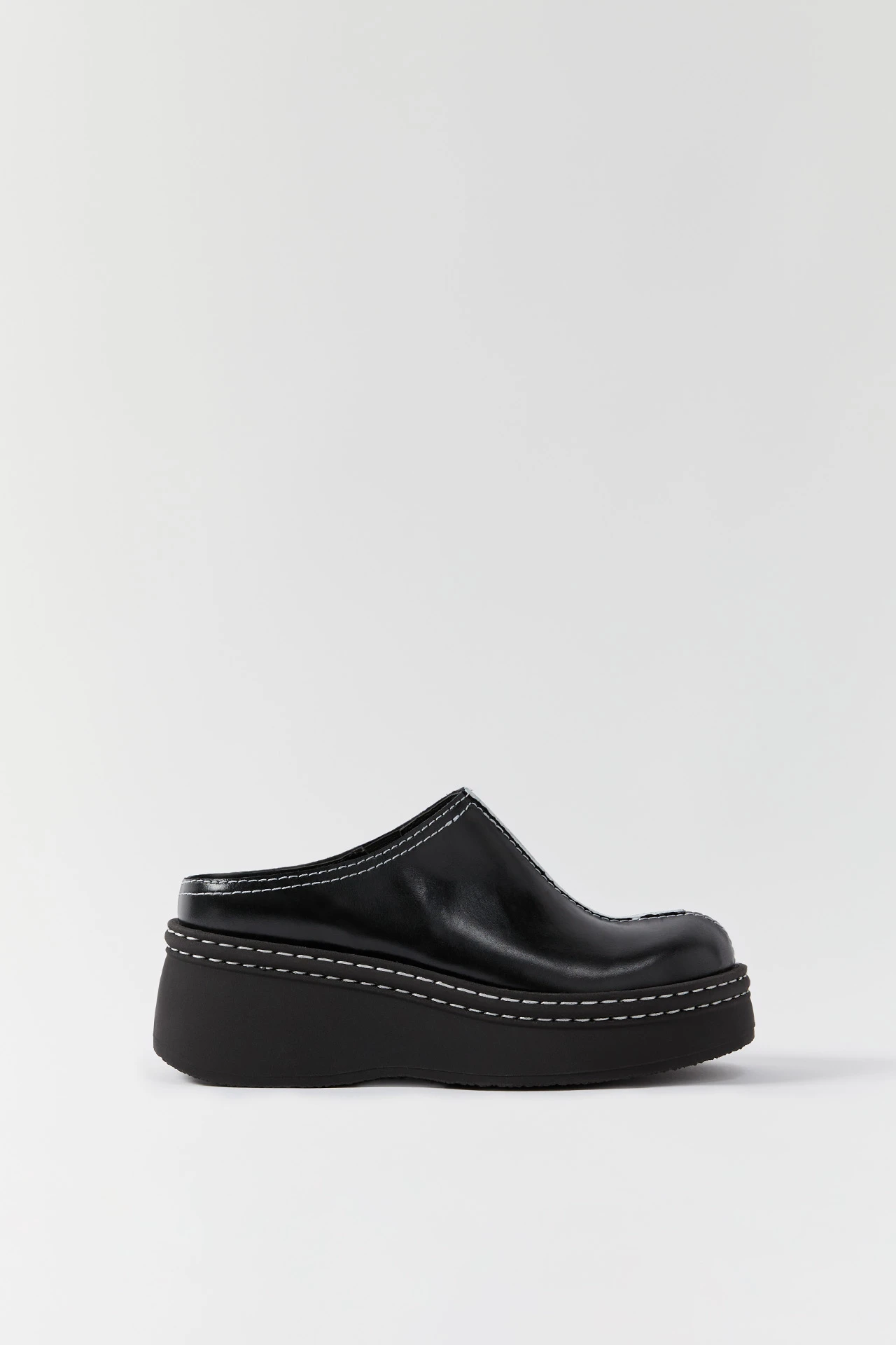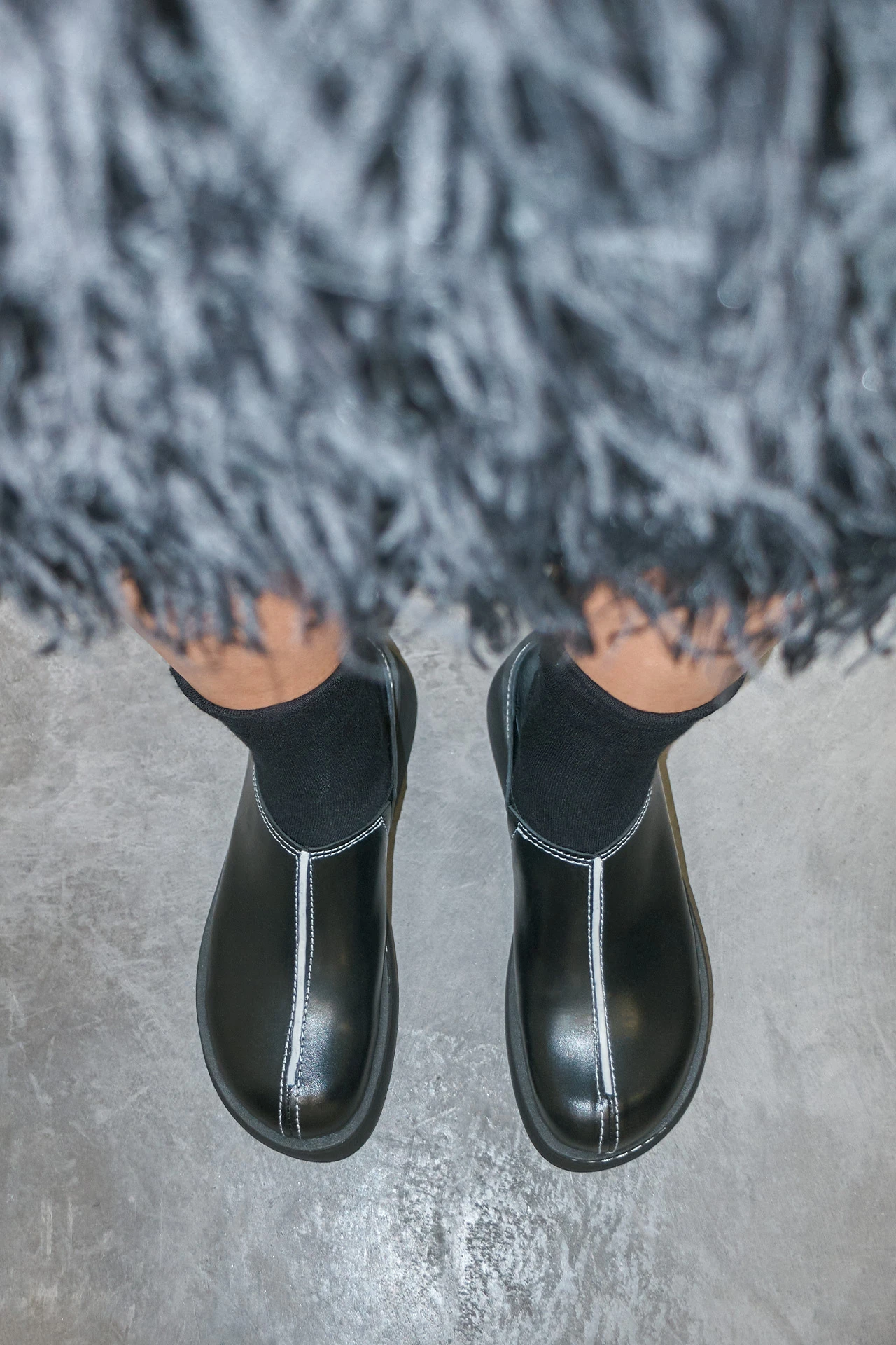 Unflinching in her wearability, Mego struts into your closet and is at one with every outfit she meets. Her black leather upper bears a butted central seam with contrast rubberized edging and contrast white stitching that meets a low swooping ankle cuff, complete with a discreet elastic inner gusset for optimum comfort. Her rubber sole forms a thick flatform – slightly raised to the rear for a subtle wedge effect and complete with contrast blue stitching around her perimeter. ck flatform – slightly raised to the rear for a subtle wedge effect.