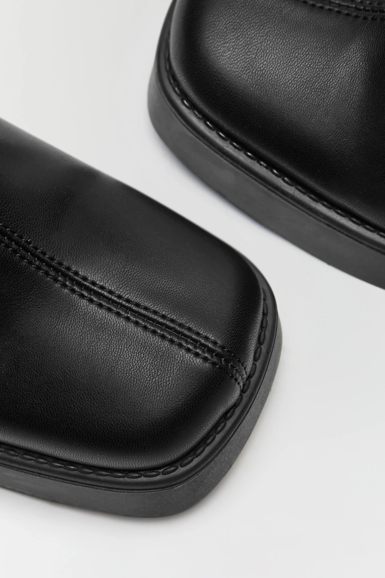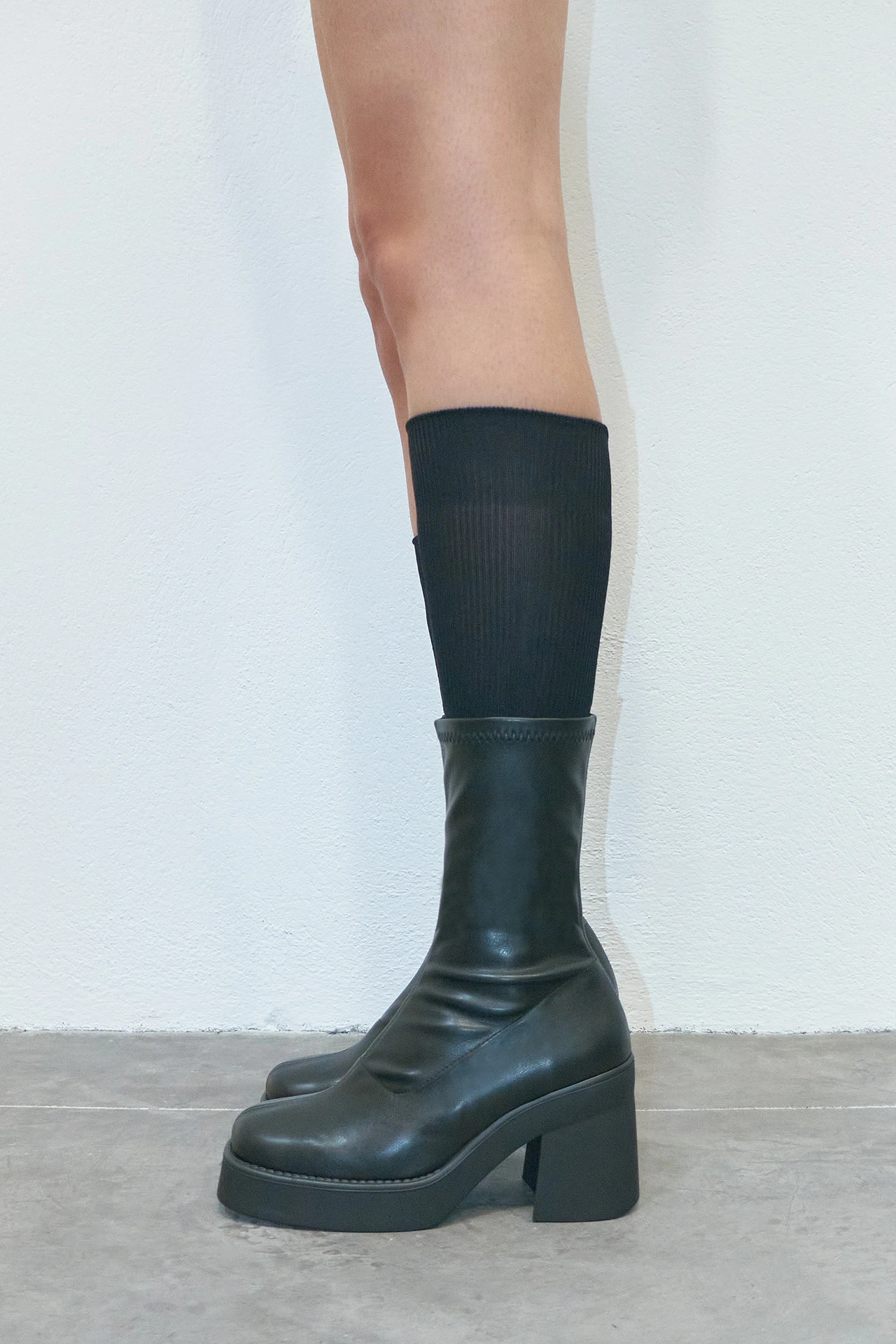 Noely is the quintessential 70s dancefloor boot. Her kick-flare heel bridges down to a thick platform, creating the foundations for her smooth-as-silk synthetic paneled stretch upper. Noely reaches right up to the mid-calf, embracing the ankle close with a sock-like fit.