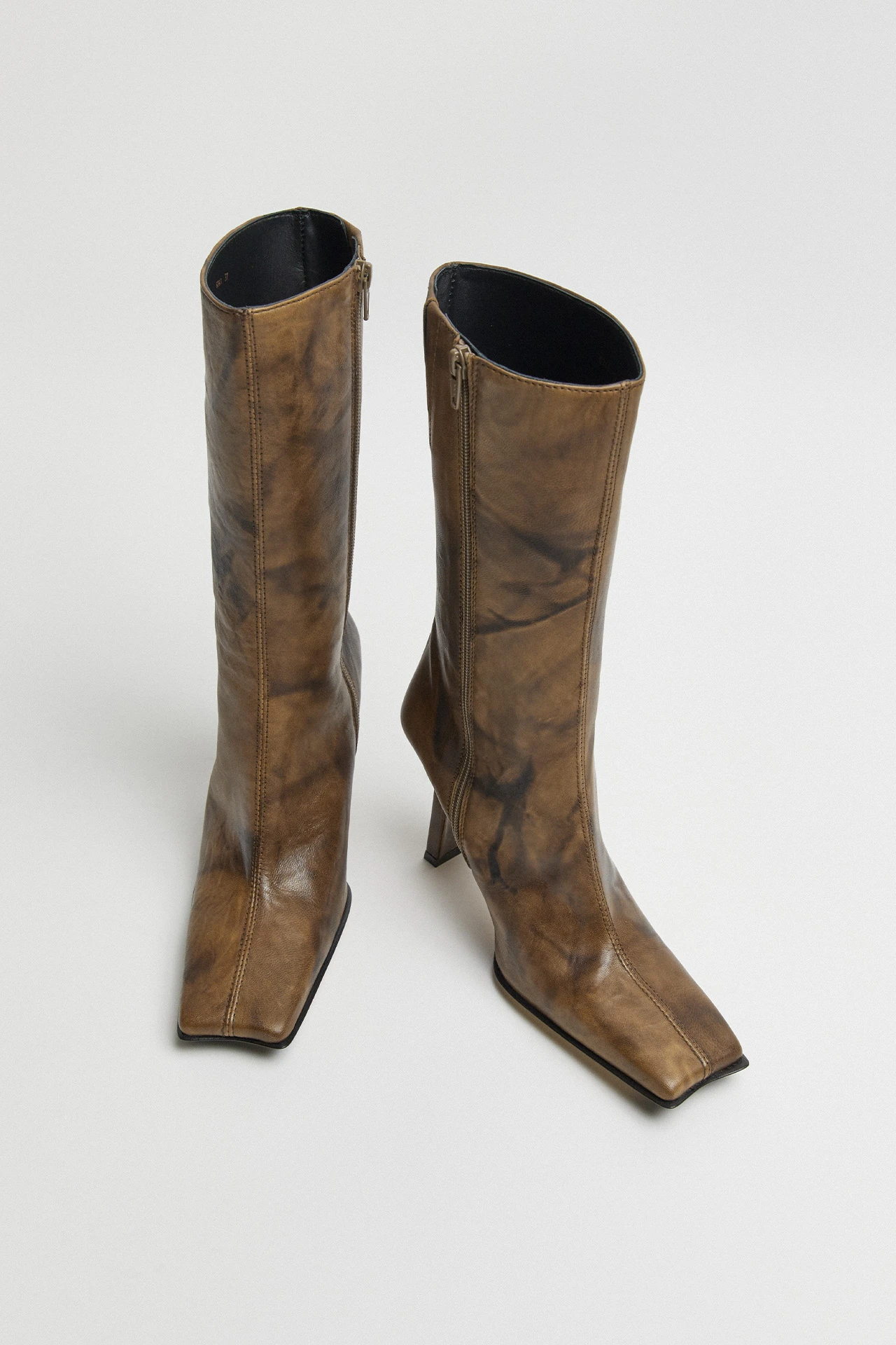 Reaching the mid-calf, Noor sports a sharp, leather-coated kickback heel, and a swooping, swirling brown leather upper – complete with a central seam running to her revered concave toe. Her inside zip and its accompanying subtle elastic gusset allow Noor’s wearers the perfect fit, with memory foam insoles offering enhanced comfort. Her lining is crafted from vegetable tan cow leather for breathability, and the same materiality features on her sole, too – finished with a rubber top piece heel and invected toe for durability. Noor is not a boot, she’s an Icon.