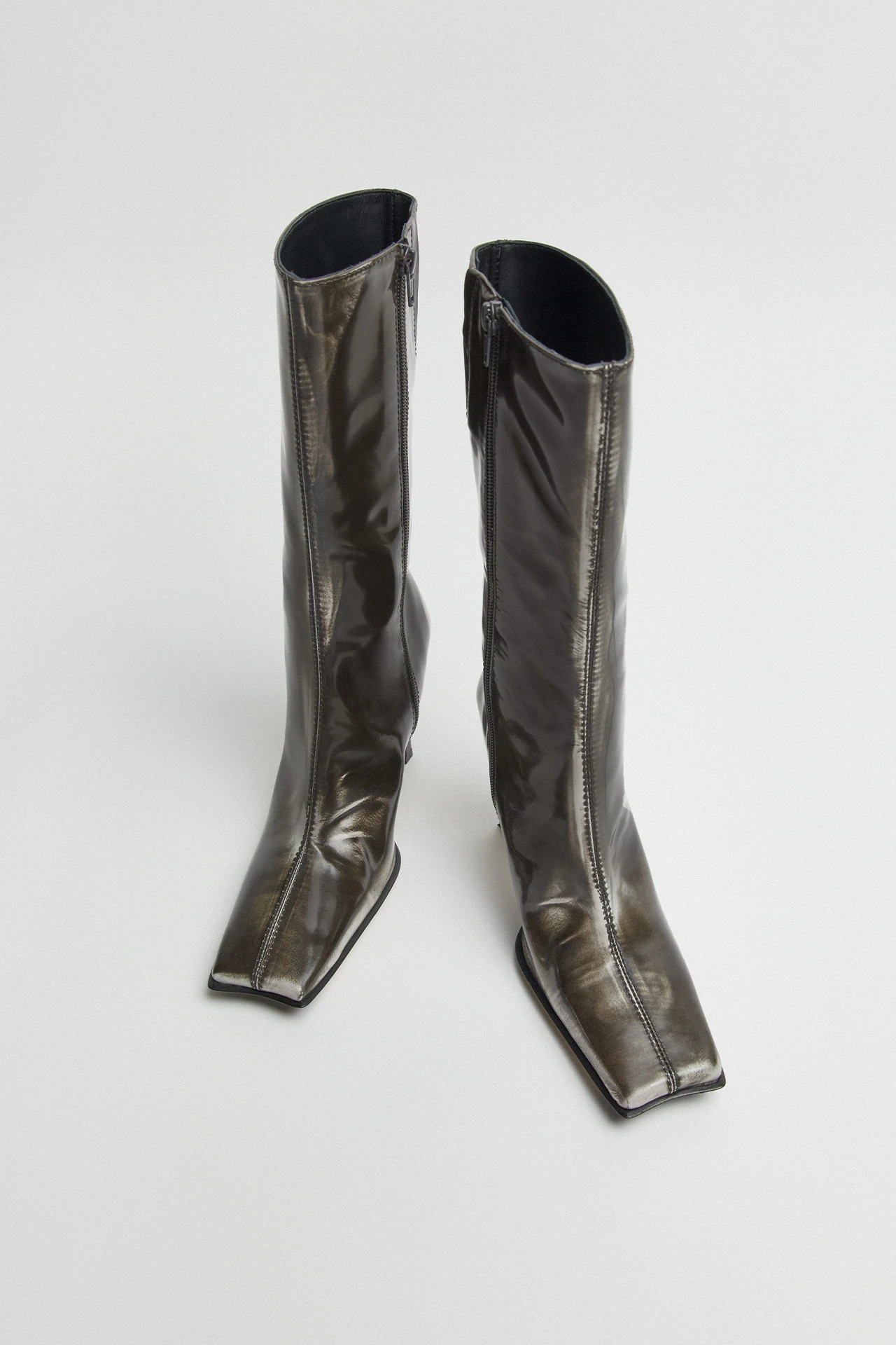 Reaching the mid-calf, Noor sports a sharp, leather-coated kickback heel, and a swooping dark grey patent leather upper – complete with a central seam running to her revered concave toe, which has been gently brushed to reveal a light grey distressed effect beneath. Her inside zip and its accompanying subtle elastic gusset allow Noor’s wearers the perfect fit, with memory foam insoles offering enhanced comfort. Her lining is crafted from vegetable tan cow leather for breathability, and the same materiality features on her sole, too – finished with a rubber top piece heel and invected toe for durability. Noor is not a boot, she’s an Icon.