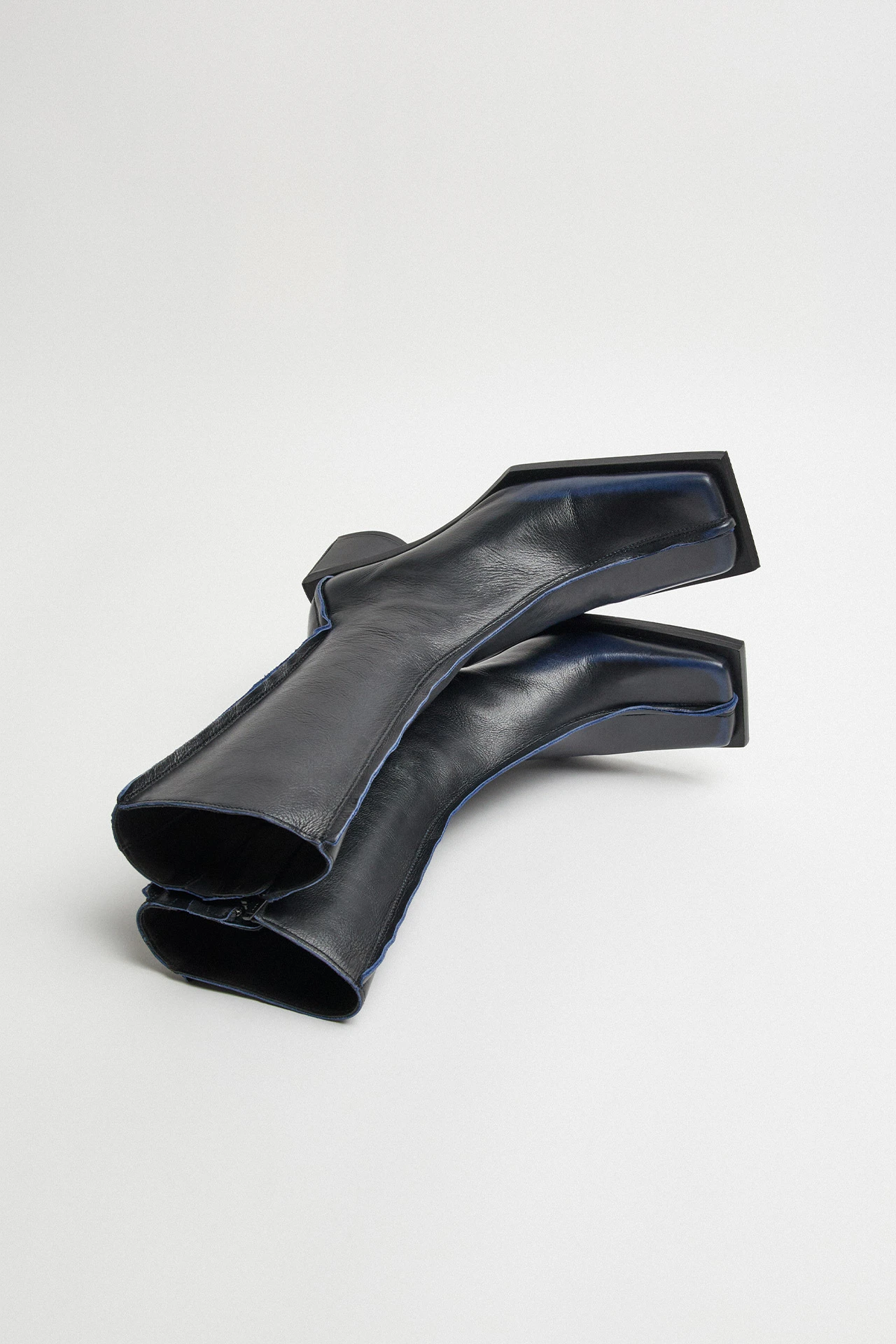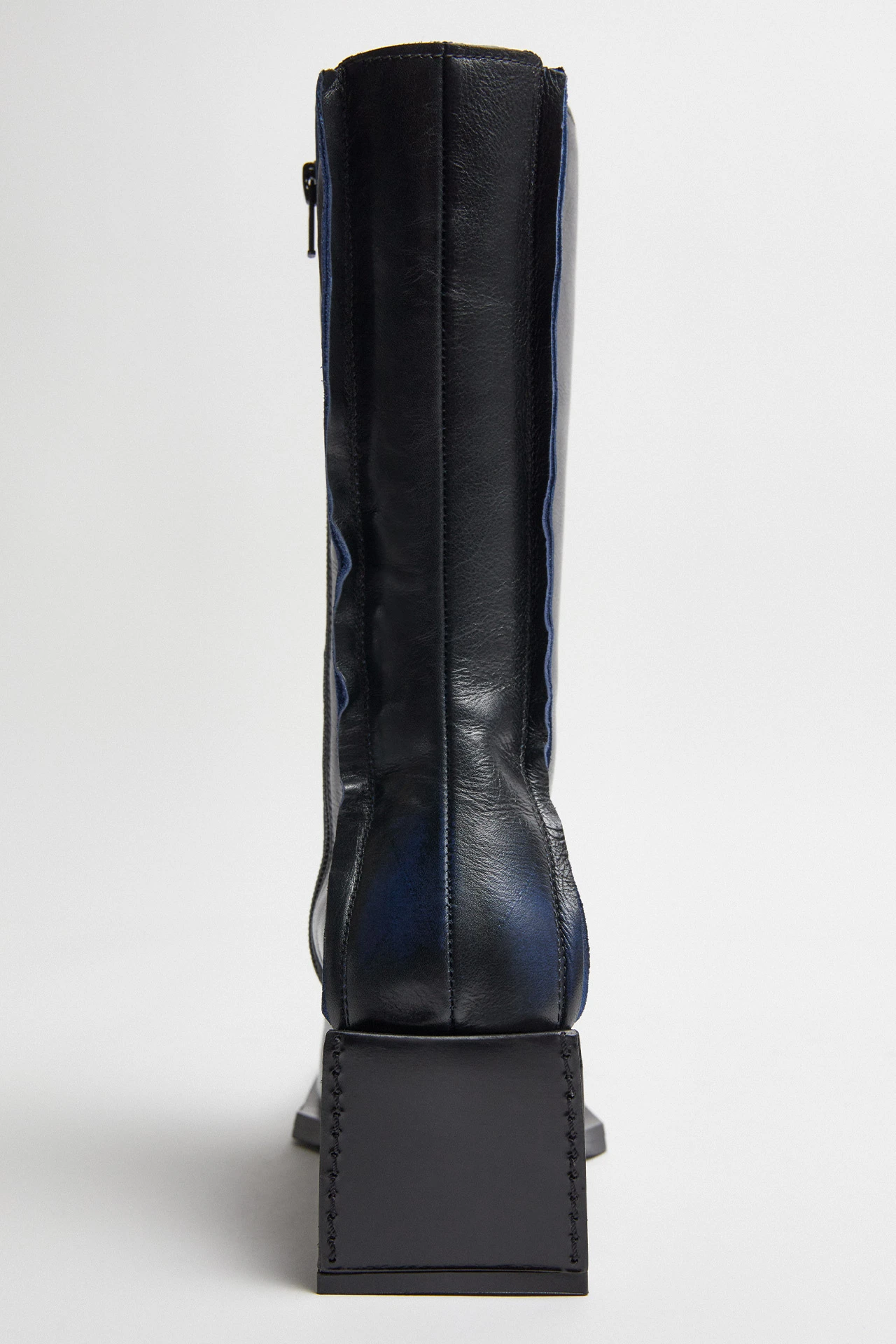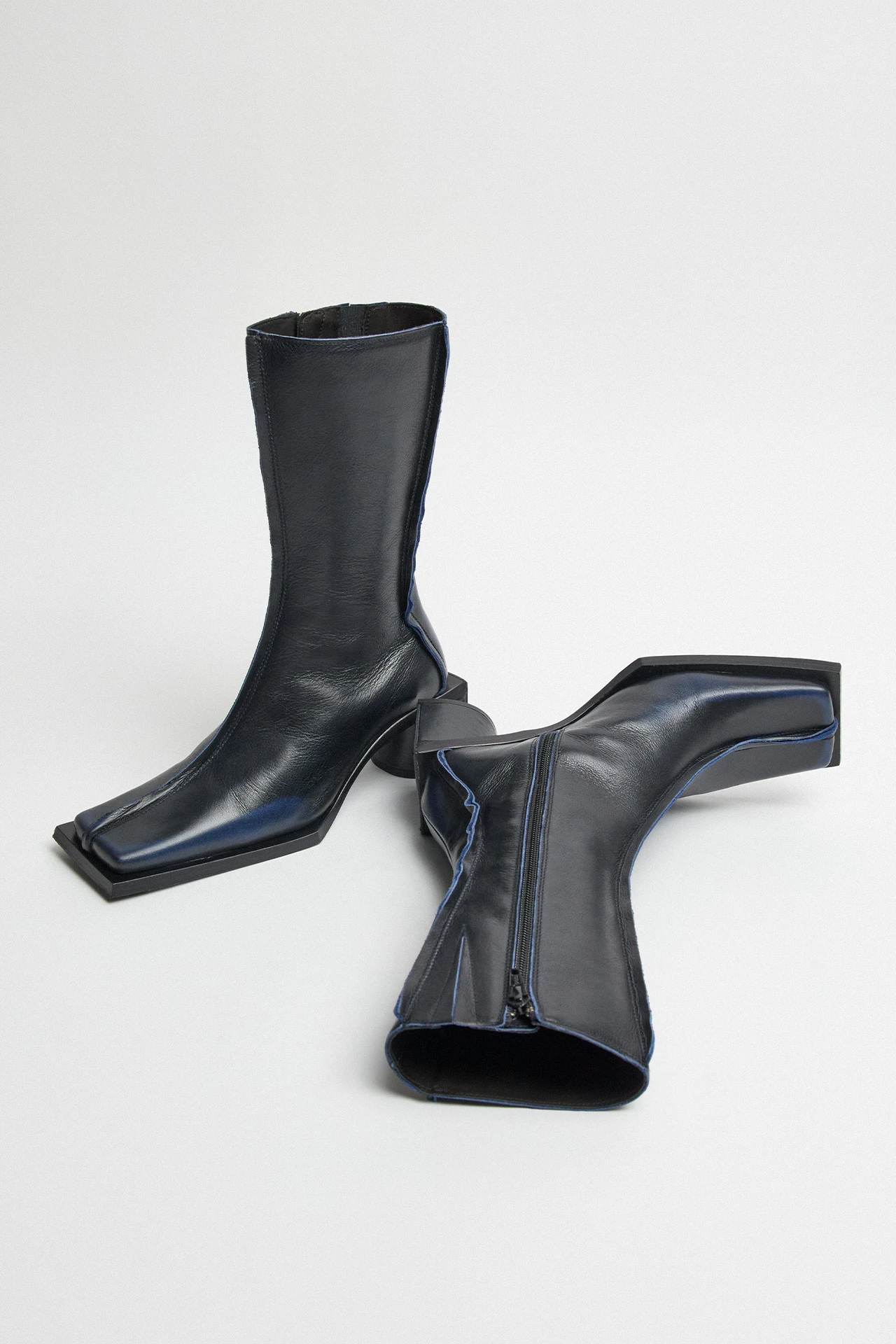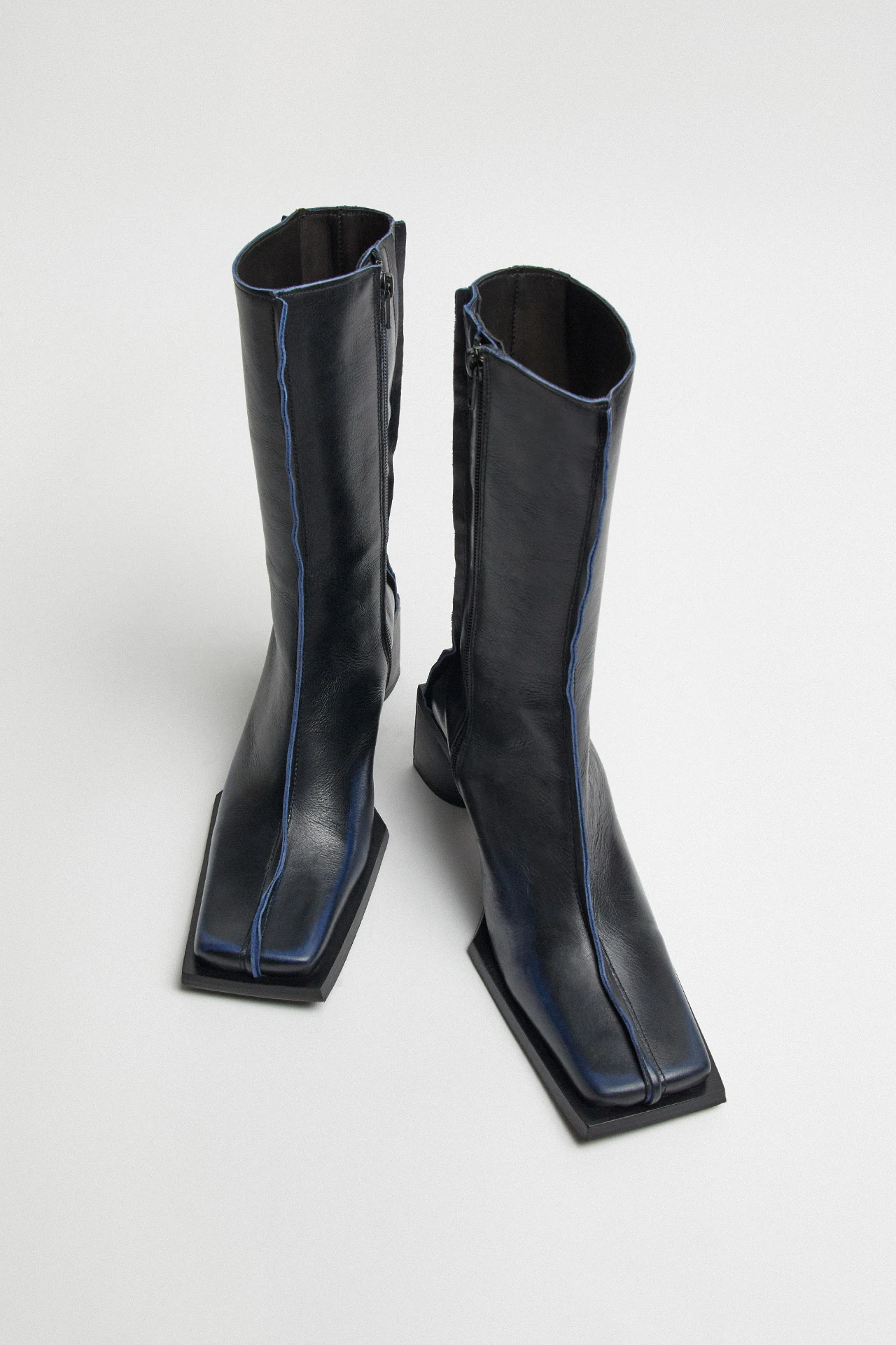 Reiko is angular in all the right places. In black distressed leather, her paneled upper has been brushed to reveal a rich regal blue at the edges of her elongated squared toe, from which an expertly angled sole extends slightly outwards for an exaggerated finish. From the toe, a contrast blue central seam reaches right up to the mid-calf height, with matching double seams flanking the rear down to Reiko’s inverted round-flat heel.