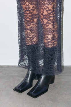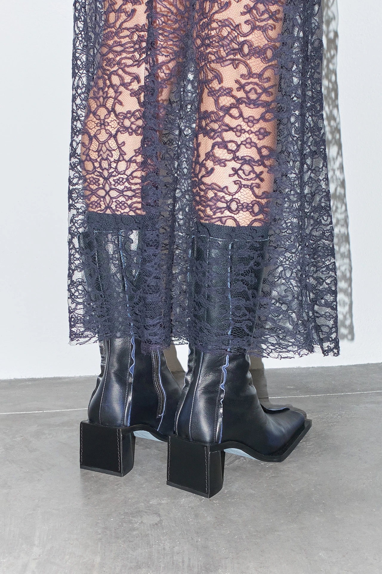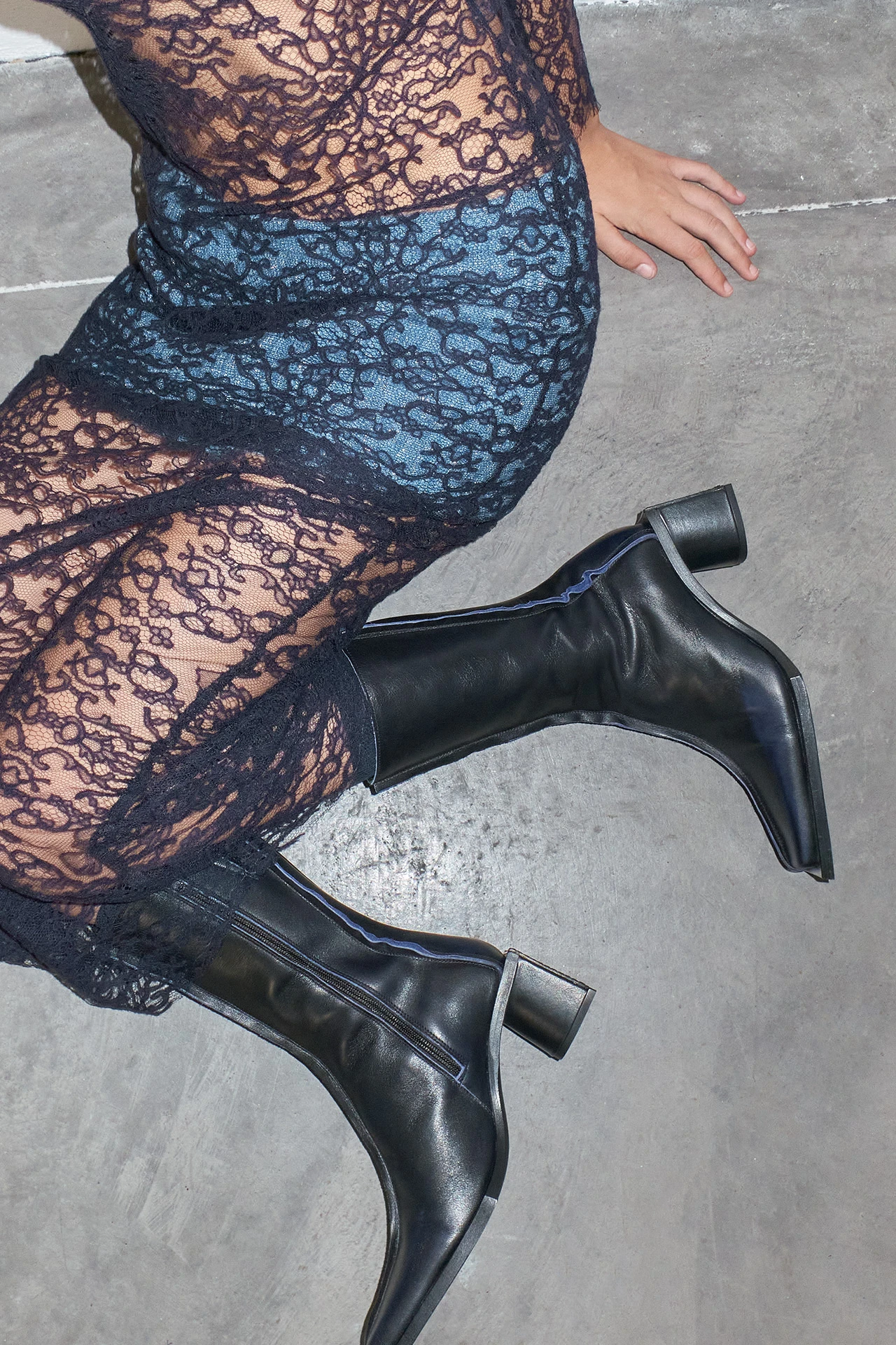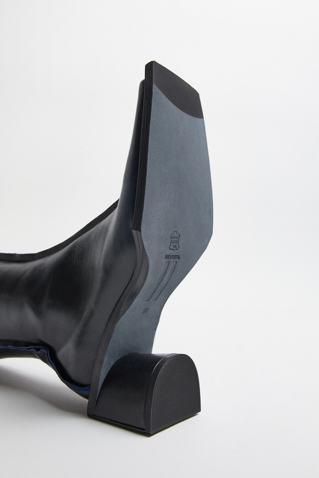 Reiko is angular in all the right places. In black distressed leather, her paneled upper has been brushed to reveal a rich regal blue at the edges of her elongated squared toe, from which an expertly angled sole extends slightly outwards for an exaggerated finish. From the toe, a contrast blue central seam reaches right up to the mid-calf height, with matching double seams flanking the rear down to Reiko’s inverted round-flat heel.
