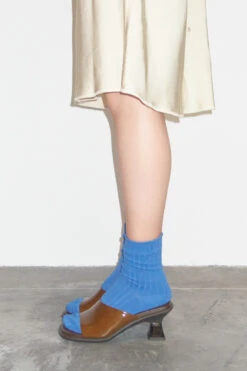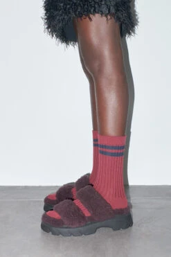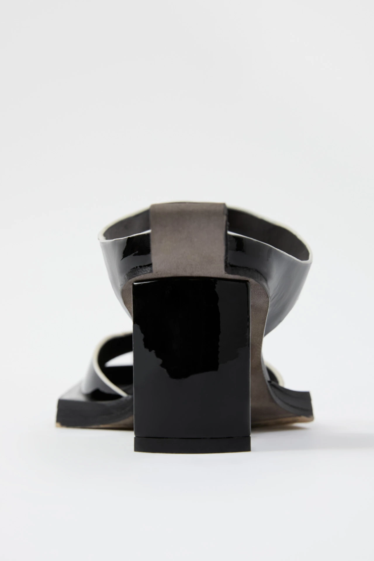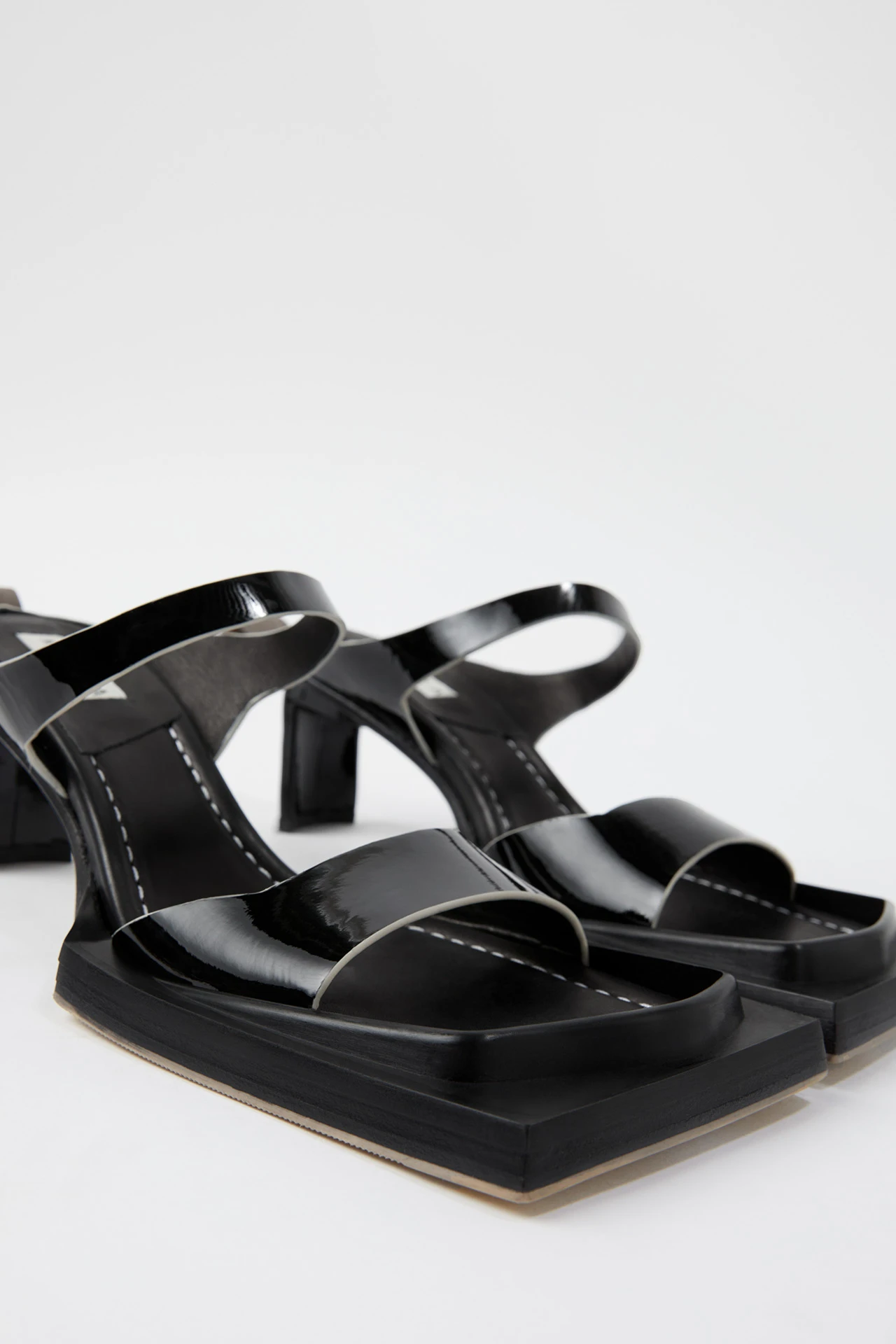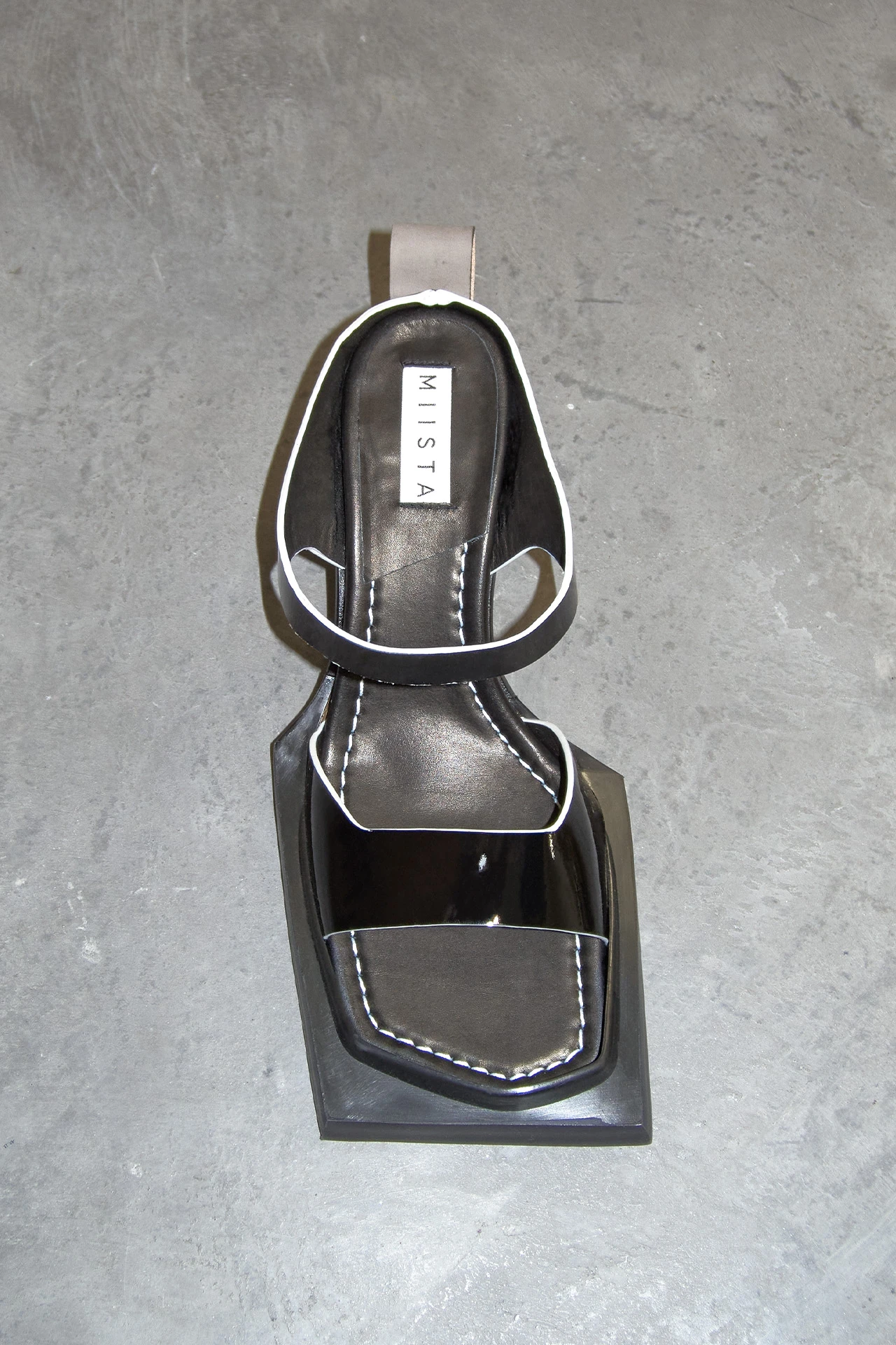 As sandals go, Ren is a strong one. Inspired by steel-capped workboots, her sharp-cornered rubber toe-caps extend far beyond the welt of the outsole for an assertive statement finish. The ultra-thin curved heel stands in opposition to this angularity, sitting just below her contrast rear loop, added for easy entry. Ren’s straps are formed from black patent leather with contrast white rubberised edging, and she has a vegetable tan cow leather insole – complete with a rubber toe and heel cap to protect her leather sole.
