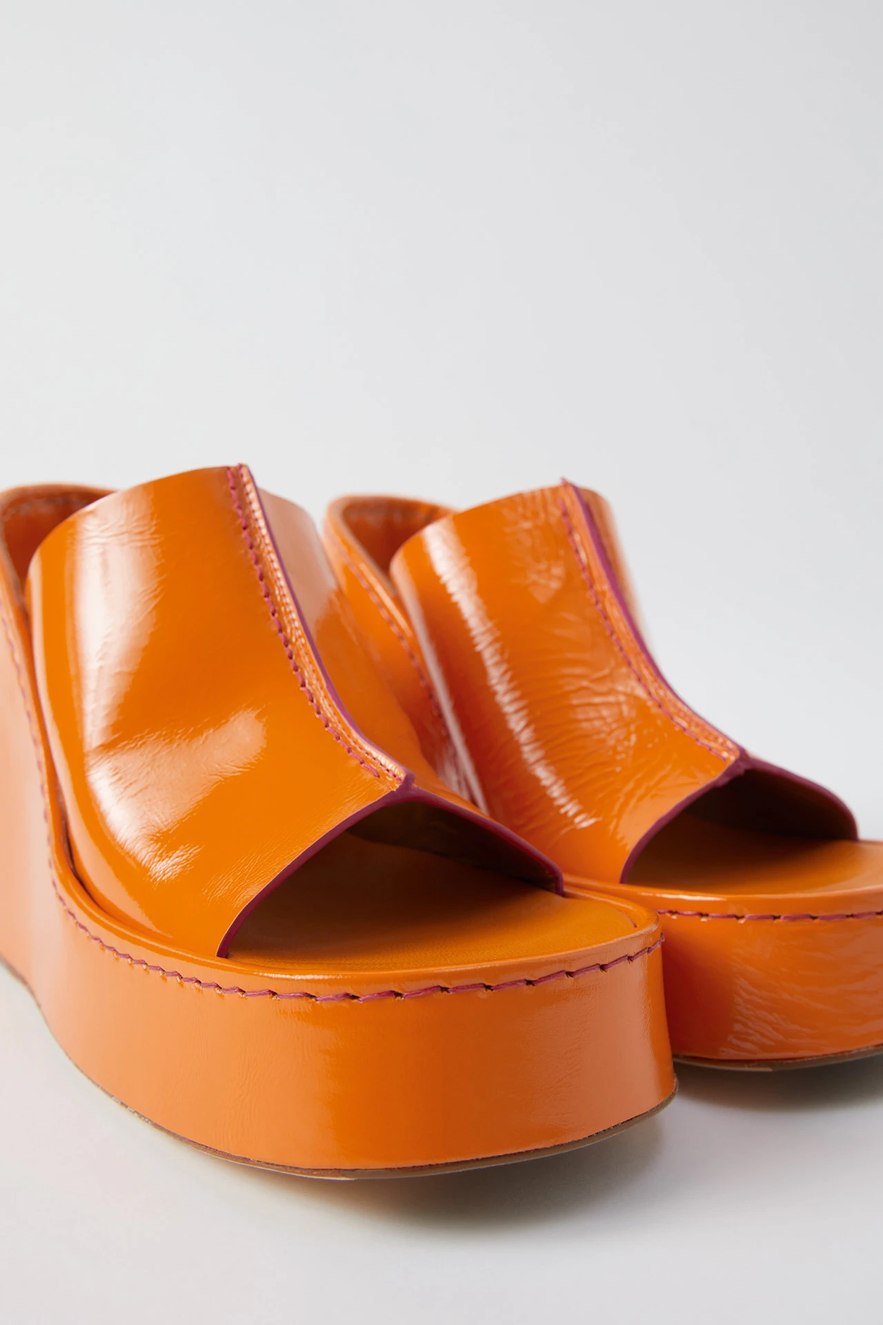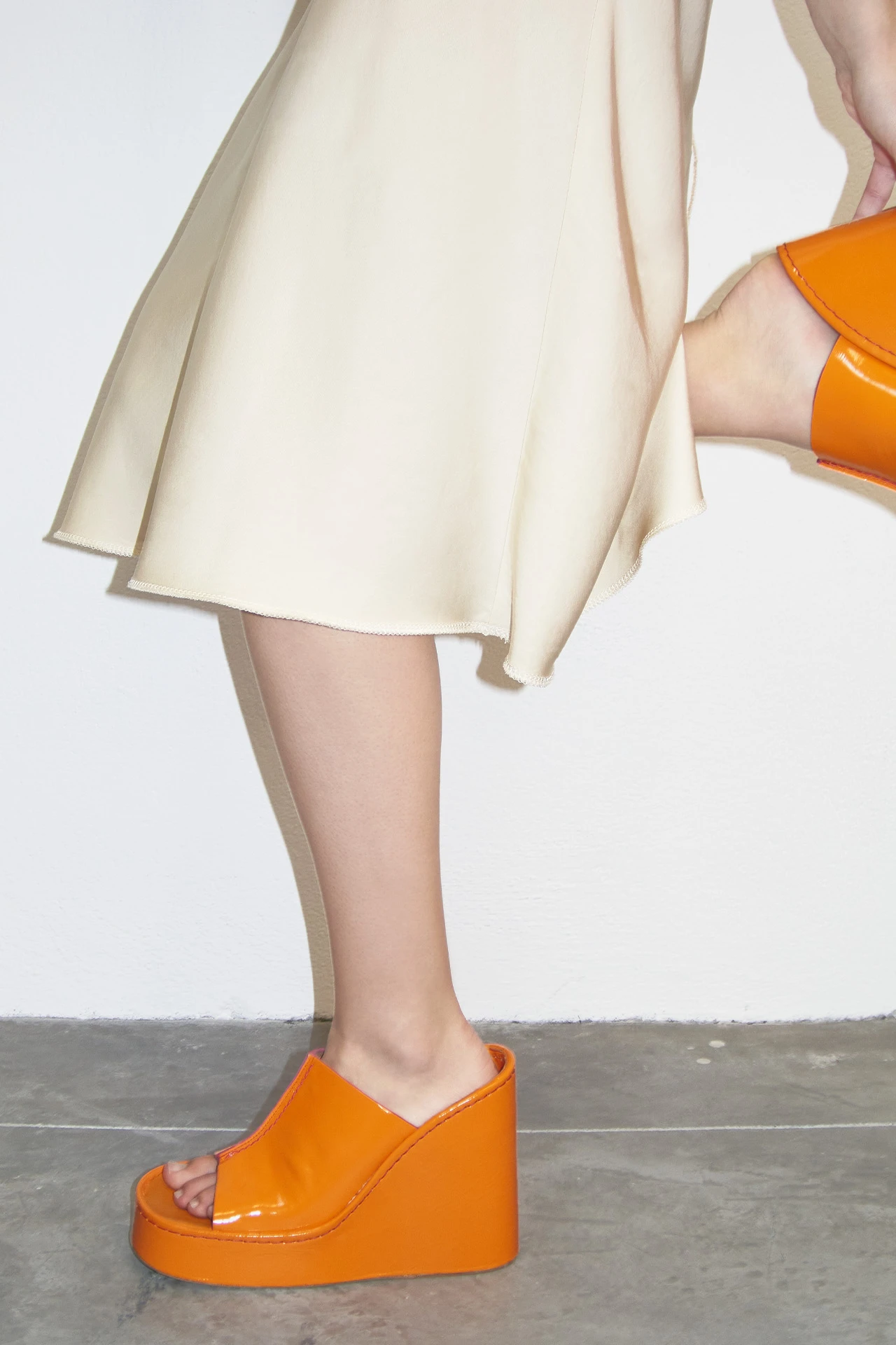 Inspired by the ultimate icon – Barbie, Rhea is an Icon all her own. Upon entry, her wearer’s foot sinks deep into the patent cow leather wedge – the edges of which extend above and beyond the insole, wrapping the back of the foot. So Rhea appears skyrocket high, but it’s all an illusion – aided and abetted by her thick platform frontage. A central seam runs up her upper, stitched then finished with a rubberized edge. Rhea’s cow leather sole has a wider footprint than her ultra-comfortable memory foam insole counterpart, making for a flattering statement look.