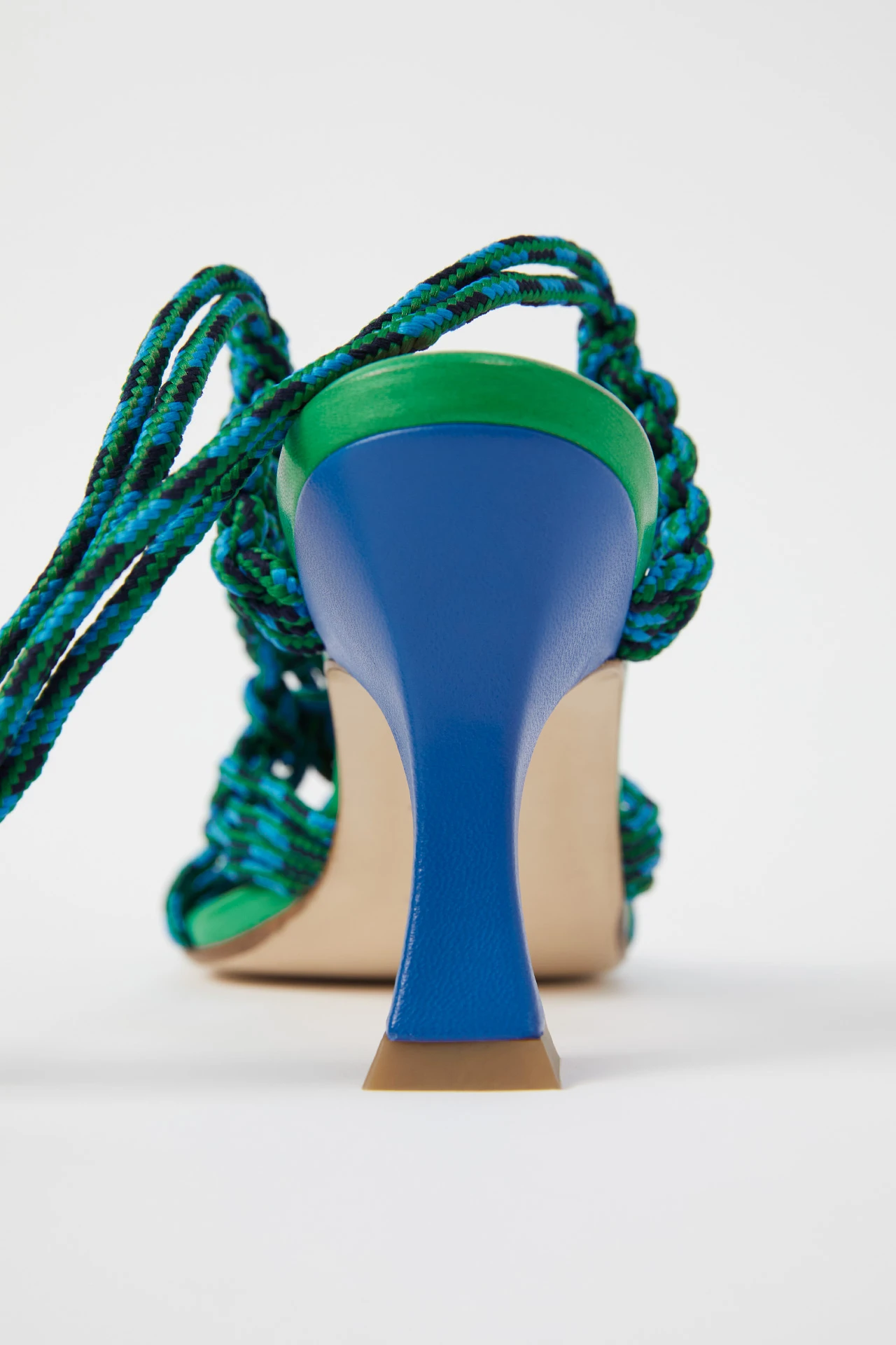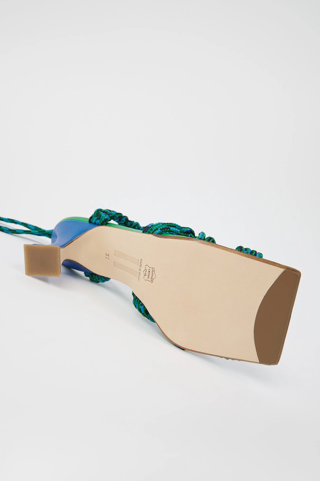Some sandals fade, but Stephanie’s Icon status sustains. And quite right, too. Atop a blue lambs leather covered flared heel and green square-toed slimline cow leather outsole, her upper is formed of macrame knotted shoelaces in contrasting green, blue, and black – tied typically to the rear, or however you see fit. As with all Icons, Stephanie is finished with memory foam insoles and vegetable tan cow leather lining for enhanced comfort, plus a rubber heel cap and rubber-invected toe on her vegetable tan cow leather sole for durability. This style is true to size. Heel Height 7,5cm We recommend selecting your standard European size. Designed in London | Handcrafted in Spain