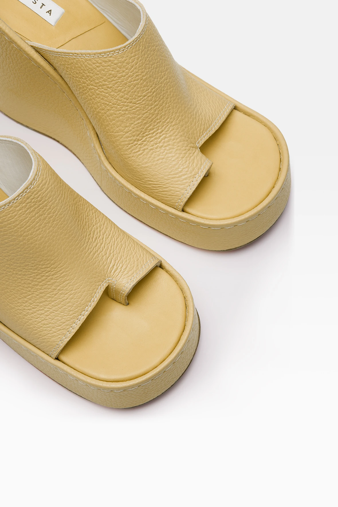 The Barbie-inspired Thais wedges offer undiluted joy in buttery yellow leather with hidden between-the-toe detailing and oversized stitching along the wedge. The foot sinks into the wedge that extends above the heel giving the illusion of an extreme high heel without stopping you dancing all night long. Finished with ultra-cushioned memory foam insoles, calf leather lining and leather outsoles injected with rubber details for added grip and endurance. This style is true to size. We recommend selecting your standard European size. Designed in London | Handcrafted in Spain