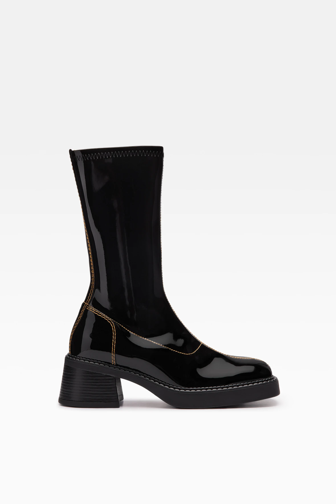 Vero is a mid-century icon transformed for the present day. Her black patent leather upper glints in the darkness, reaching up to the mid-calf and revealing glimmers of warm contrast stitching to unite her panels. Her sole features a very slight platform, bridging the gap between the pavement and her stacked mid heel.